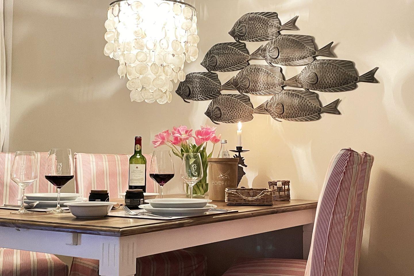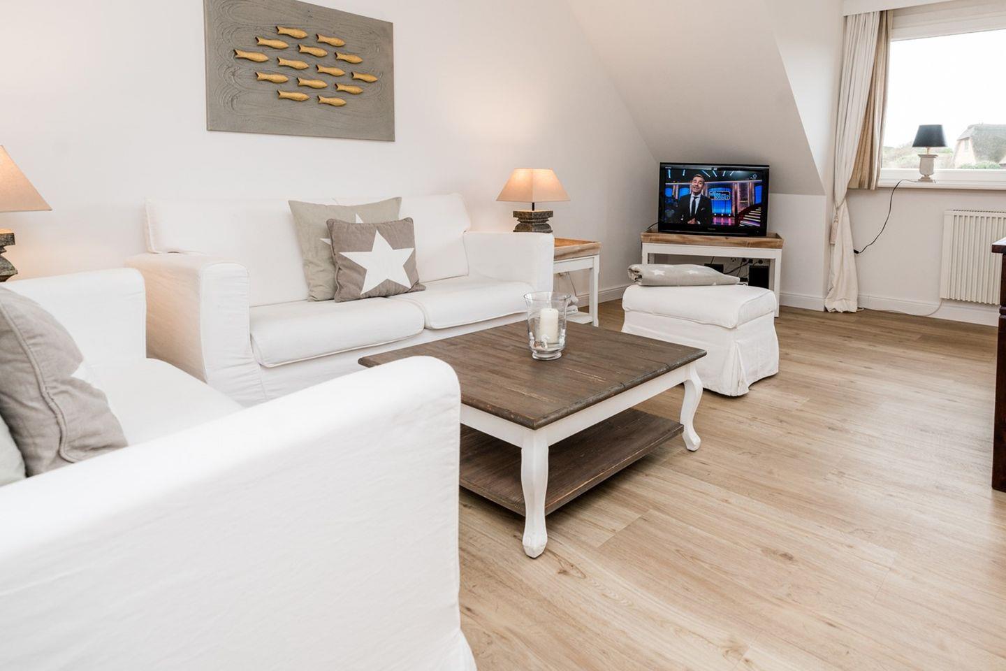 Das geräumige und helle Appartement liegt in Rantum auf Sylt im ersten Obergeschoss des Hauses und besticht durch die gemütliche Ausstattung und die herrliche Lage mit schönem Blick. Hier begrüßt Sie morgens die Sonne. Auf einer Ebene finden Sie ein geräumiges Wohnzimmer, eine voll ausgestattete separate Küche mit Nespressomaschine, zwei gemütliche Schlafzimmer sowie ein Wannenbad. Das größere Schlafzimmer hat ein sehr bequemes Doppelbett (180x200). In dem kleineren Schlafraum befindet sich ein weiteres gemütliches Doppelbett (140x200). Selbstverständlich stehen Ihnen 3 SAT Flat-Screen TV's, kostenloser WLAN Zugang, ein Telefonanschluss in das deutsche Festnetz und ein PKW-Stellplatz zur Verfügung.