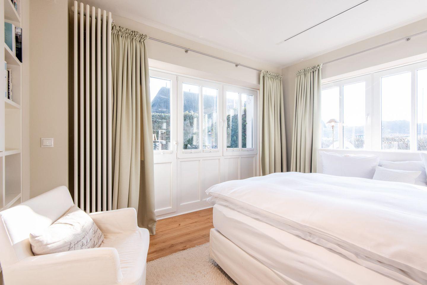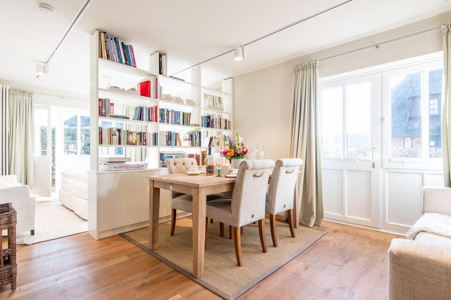 Der helle Wohn- und Schlafbereich ist optisch raffiniert voneinander getrennt und schafft so eine angenehme Balance zwischen Rückzug und Geselligkeit. Machen Sie es sich auf dem Sofa gemütlich, lehnen Sie sich im Sessel zurück und lassen Sie den Tag Revue passieren. Abends sinken Sie entspannt ins Bett und lauschen vielleicht noch dem fernen Rauschen der Nordsee, bevor Sie sanft einschlafen.