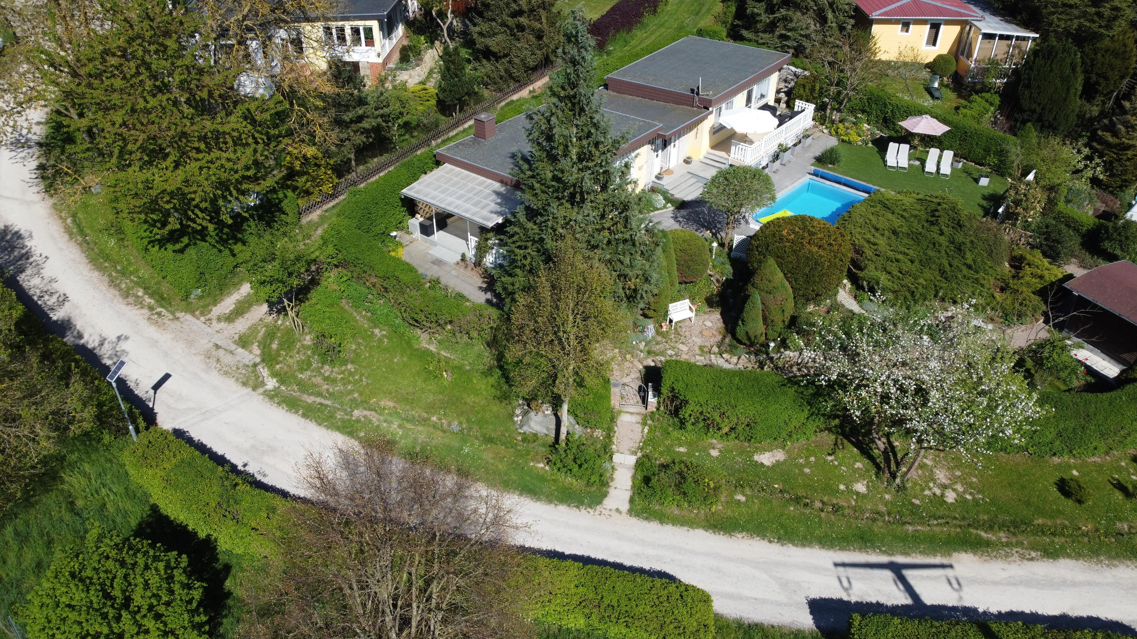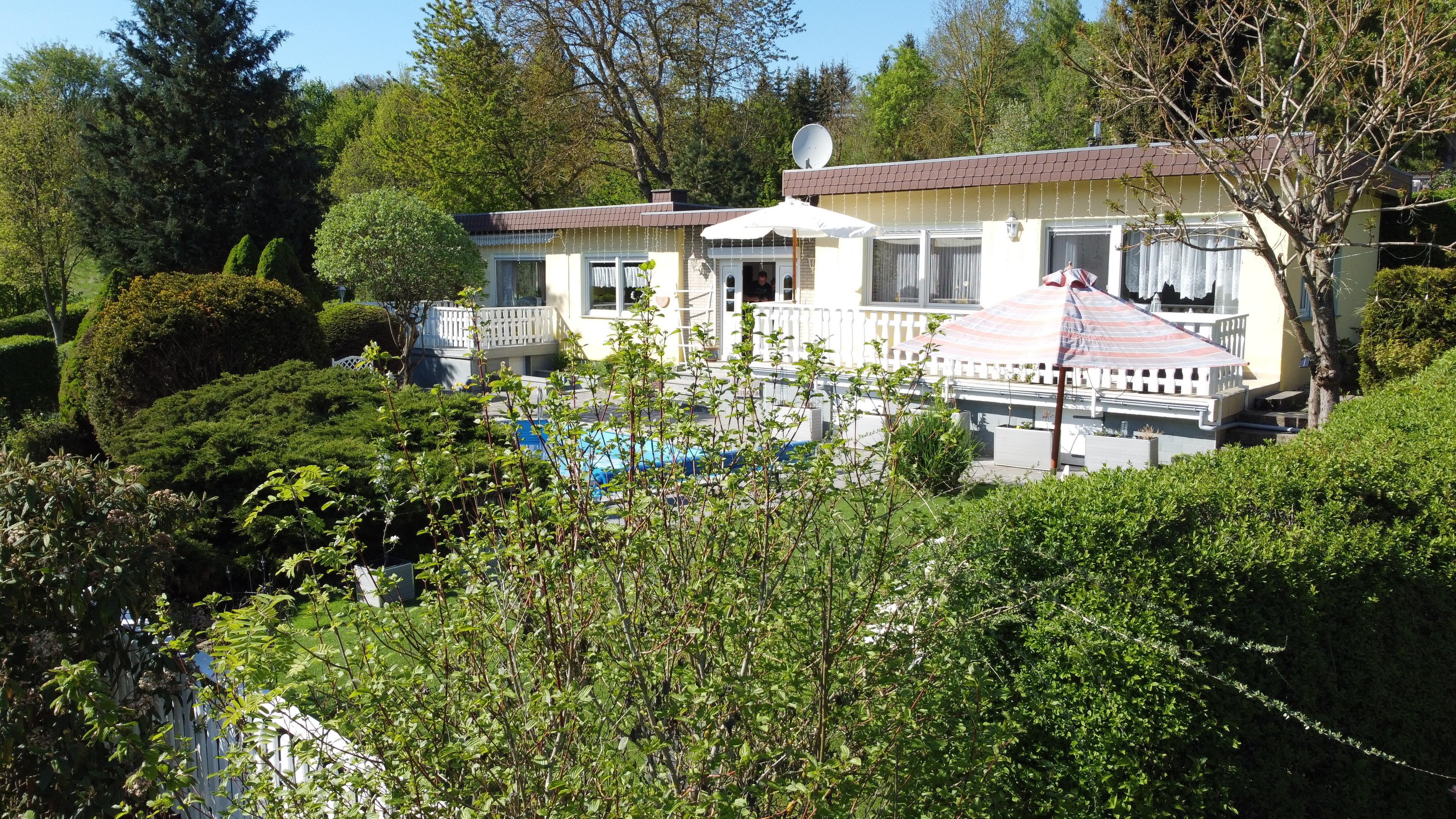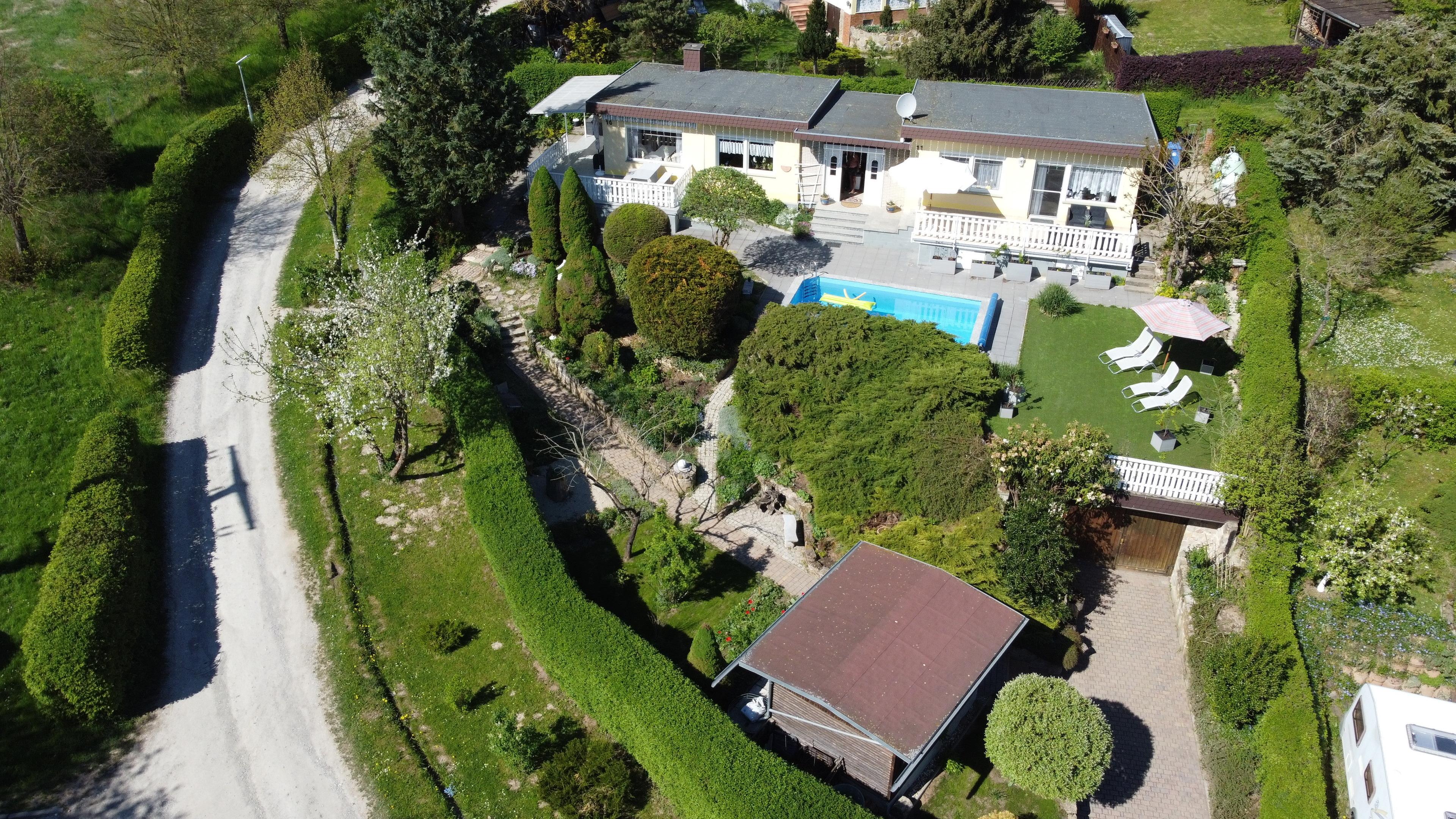 Wir bieten einen gut ausgestatteten Bungalow mit großen Garten und Pool sowie Parkplatz und Unterstellmöglichkeiten für Fahrräder.