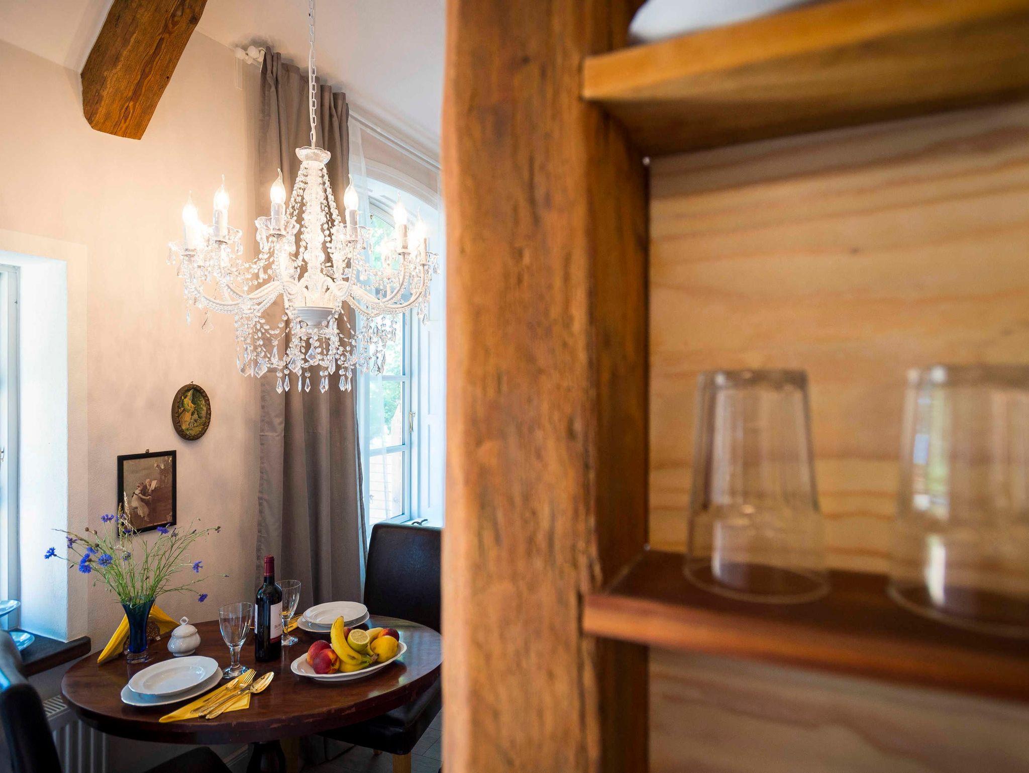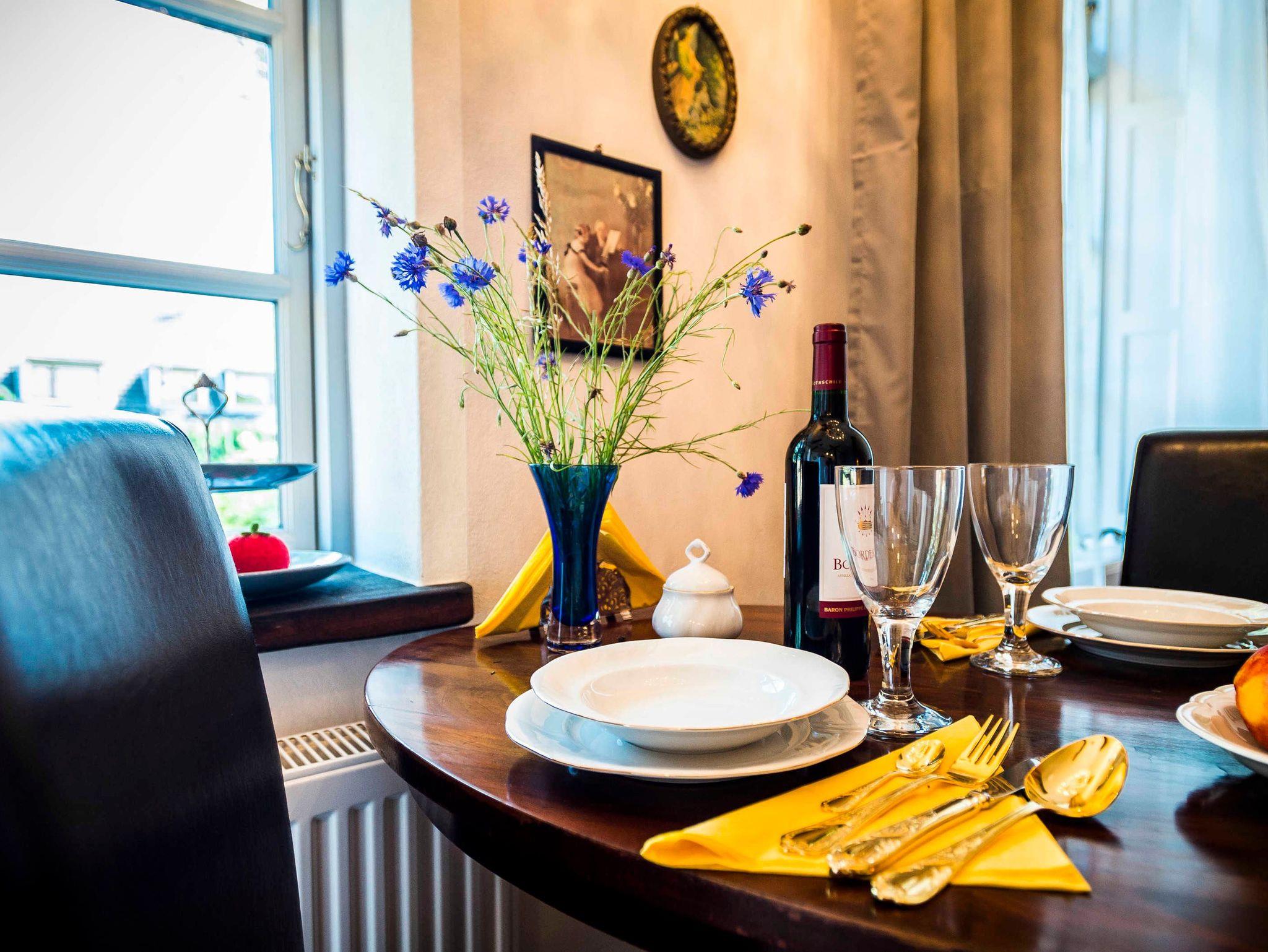 Der Parkplatz der Wohnung liegt unmittelbar vor der umzäunten Terrasse die mit Holzmöbeln und Kissen ausgestattet ist. Die ca. 42 m² große Wohnung erstreckt sich über 2 Etagen. Im EG der Wohnung befindet sich der Wohnraum mit Küche und Esstisch. Der Wohnraum hat einen abgetrennten Bereich für ein gemütliches Sofa mit Blick auf den 48 Flachbildfernseher. Eine Musikanlage mit CD-Player und USB-Anschluss sorgen für Unterhaltung und gemütliche Entspannung. Die Hochglanzeinbauküche läßt keine Wünsche offen. Sie umfasst Kühlschrank inkl. Gefrierfach, Spüle, Geschirrspüler, Vitrinen mit Geschirr und Gläsern, einen Herd mit Cerankochfeld und Tastbedienung, einen Backofen sowie zwei Unterschränke mit Schubladen. Die Küchenausstattung ist komplett mit Töpfen und Pfannen und allen zum Kochen notwendigen Utensilien wie: Kartoffelstampfer, Dosenöffner, Korkenzieher, Sparschäler, Mixstab, Kochlöffel, Knoblauchpresse, anständige Messer etc. Ein Kaffeevollautomat der Firma Saeco und ein Milchaufschäumer zaubern einen perfekten Latte Macchiato. Zusätzlich gibt es eine konventionelle Kaffeemaschine, einen Wasserkocher und Toaster. Das Geschirr und Besteck sind für 12 Personen damit der Geschirrspüler auch gefüttert werden kann. Außerdem gibt es Espressotassen, Michkaffeetassen, Müslischalen und zum Teil antike Servierschüsseln und Platten. Der Essbereich grenzt an die Küche. Über dem antiken Holztisch mit 2 Stühlen thront ein wunderschöner Kronleuchter mit 12 Leuchten, der stufenlos gedimmt werden kann. Die Wohnung erstreckt sich über zwei Etagen. In die 1. Etage führt eine Holztreppe in einen kleinen Flur mit einer Kommode mit viel Stauraum und antikem Spiegel. Von hier aus geht es in das Bad und das Schlafzimmer. Das Badezimmer mit grauen Hochglanzfliesen ist ausgestattet mit einer Badewanne und Regendusche, einem Waschtisch mit zwei Schubladen, einem großen Spiegel mit zwei zusätzlichen Leuchten und einem Handtuchheizkörper. Es liegt ein Föhn mit Diffuser bereit sowie pro Person ein Bade- und ein Handtuch. Das Schlafzimmer ist ausgestattet mit einem Doppelbett (160 x 200) mit einer wundervoll dicken Matratze, jede Bettseite hat einen Nachttisch mit einer Lampe und davor einem runden Teppich. Neben dem Kleiderschrank mit Spiegeltüren und Innenbeleuchtung steht eine kleine antike Kommode. Eine nostalgische Glasschale, eine zusätzliche Tischlampe mit gedimmten Licht und ein antikes Bild sorgen für nostalgische Atmosphäre.