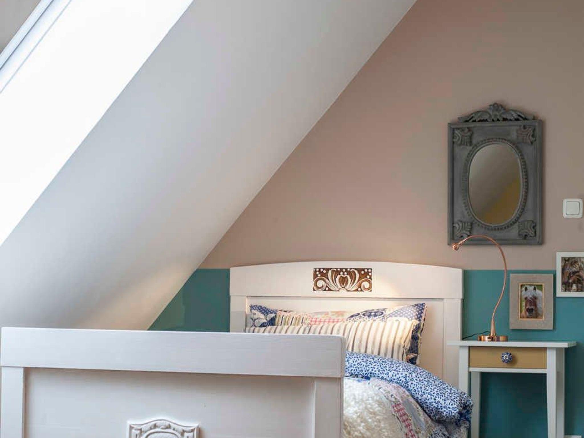 Das 3. Schlafzimmer gleicht einer Puppenstube. Neben dem antiken Bett steht ein Nachtschränkchen mit Leselampe, auf der anderen Seite ein Kleiderschrank und Bücherregal mit Spiegel. Die verspielte Einrichtung verströmt einen besonderen Charme. Das Fenster ist ausgestattet.
