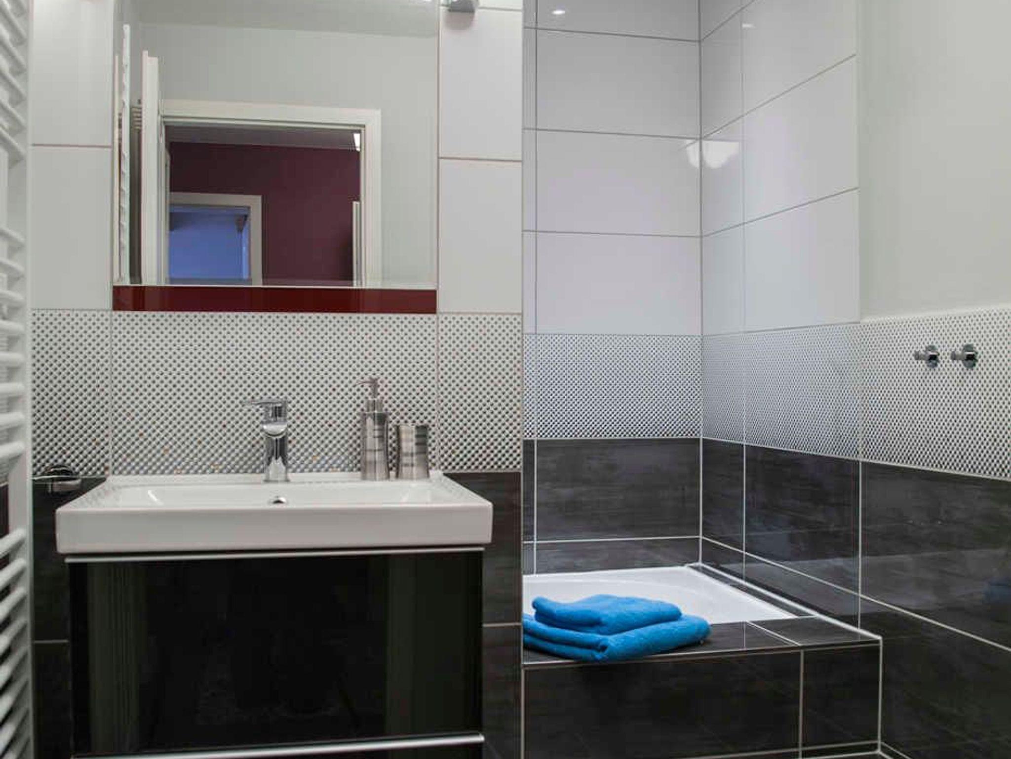 Das Badezimmer mit grauen Hochglanzfliesen ist ausgestattet mit einer Badewanne und Regendusche, einem Waschtisch mit zwei Schubladen, einem großen Spiegel mit zwei zusätzlichen Leuchten und einem Handtuchheizkörper. Es liegt ein Föhn mit Diffuser bereit, ebenfalls pro Person ein Bade- und ein Handtuch.