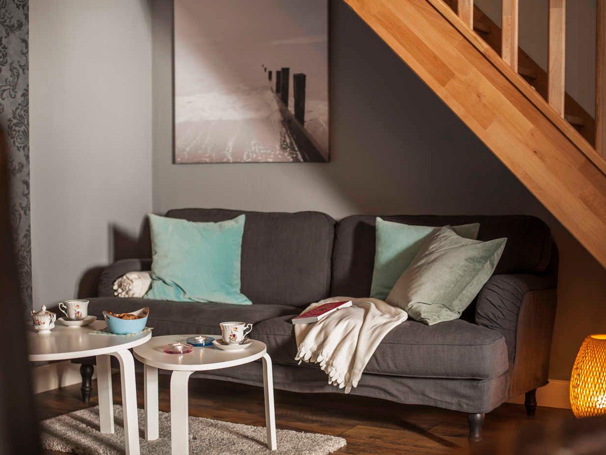 Im EG liegt der Wohnraum mit Küche und Esstisch. Der Wohnraum hat einen eigenen Bereich für ein gemütliches Sofa mit Blick auf den 50 Flachbildfernseher. Eine Musik-Anlage mit CD-Player und USB-Anschluss sorgen für Unterhaltung und gemütliche Entspannung.