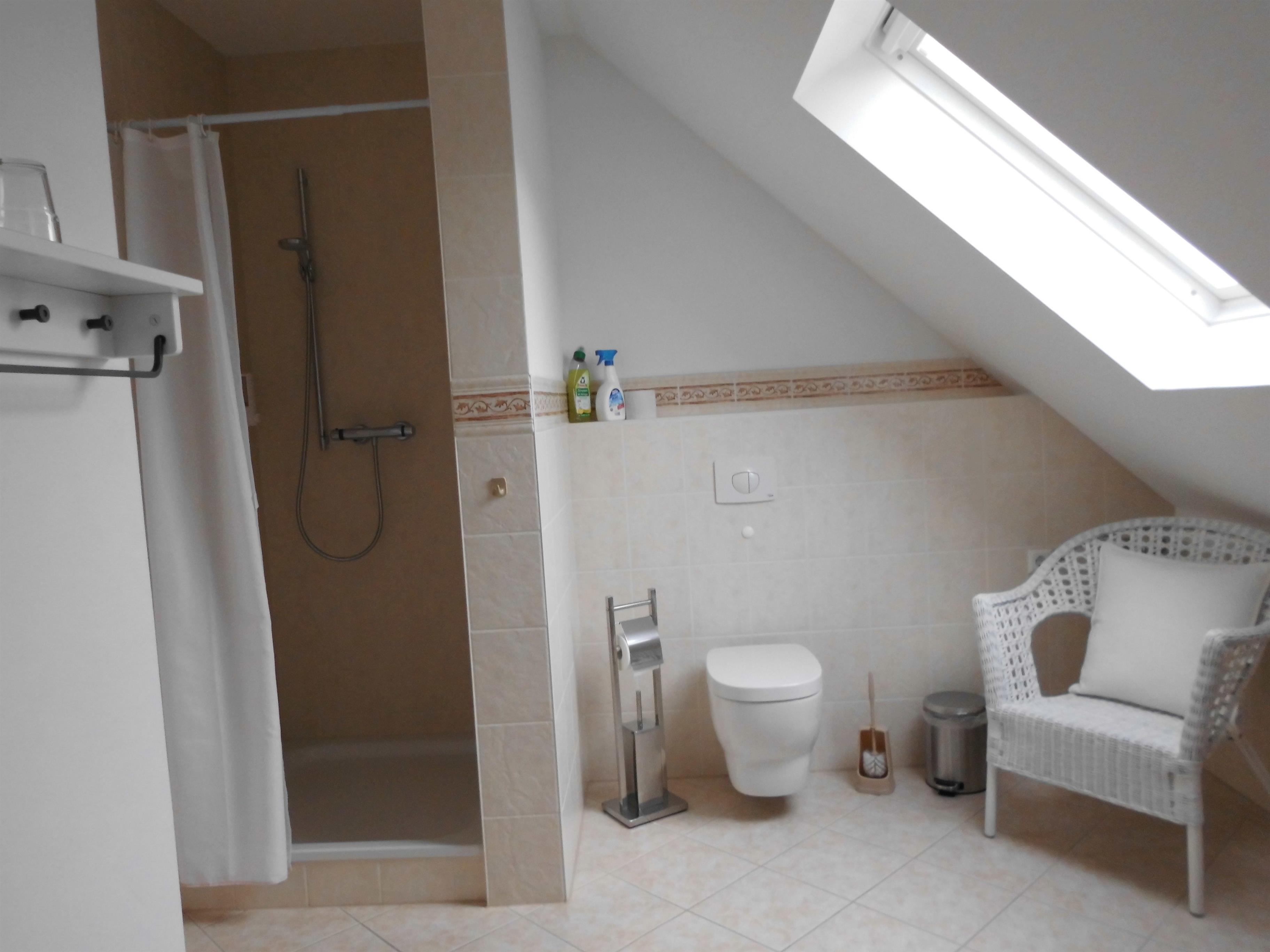 - Duschbad mit Fön, Ganzkörperspiegel sowie Rasier- und Kosmetikspiegel, Shampoo und Seife