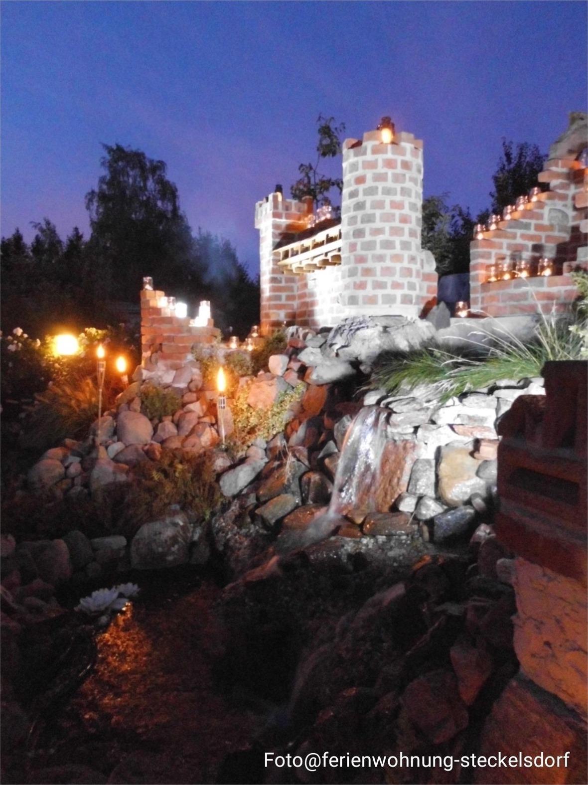 Im Außenbereich befinden sich im Innenhof sowie im Garten ausreichend Stühle, mehrere Sitzbänke, Tische sowie Sonnenliegen. Am Wasserfall können Sie relaxen. Unsere Burgruine ist ein Hingucker für unsere großen und kleinen Gäste. Gern können Sie die Feuerschale für ein gemütliches Beisammensein nutzen. Für unsere kleinen Gäste bieten wir einen hauseigenen Sandstrand hinter der Scheune. Der Strandkorb dazu bietet die perfekte Sommer-Sonne-Sand-Urlaubszeit. Zudem bieten wir für Erwachsene Fahrräder (Herren- oder Damenrad) an. Bis zu 3 PKW-Stellplätze sind auf unserem abschließbaren Hof kostenfrei abstellbar.