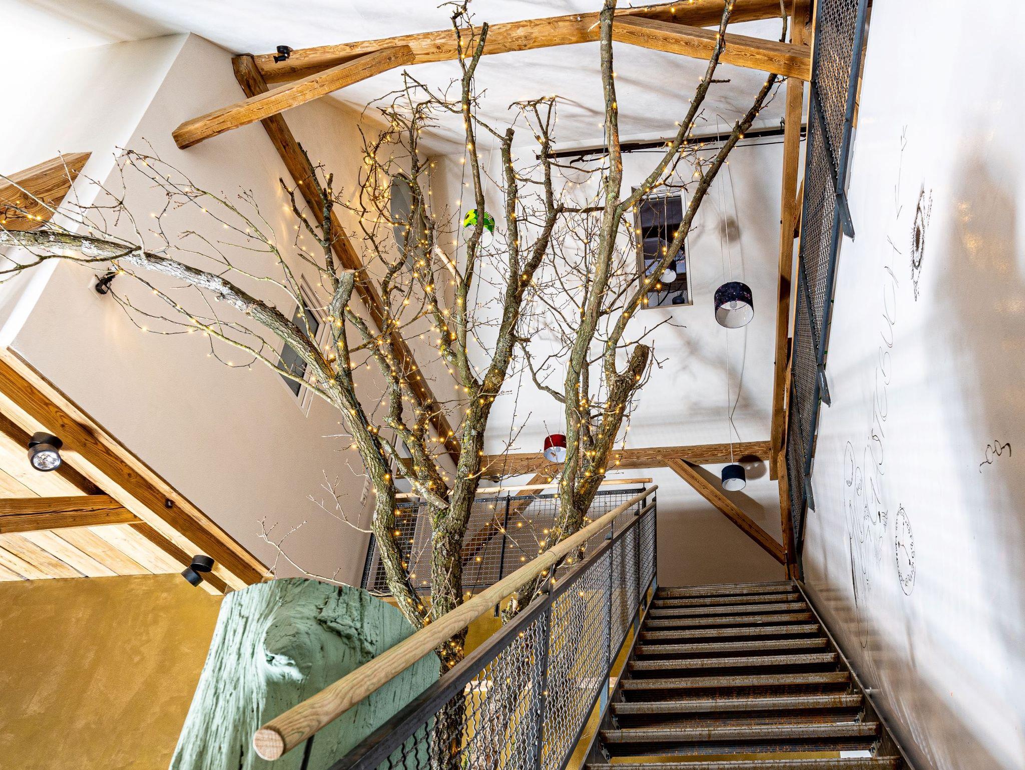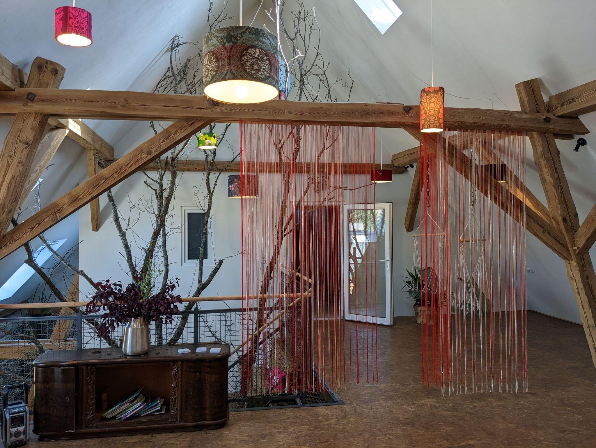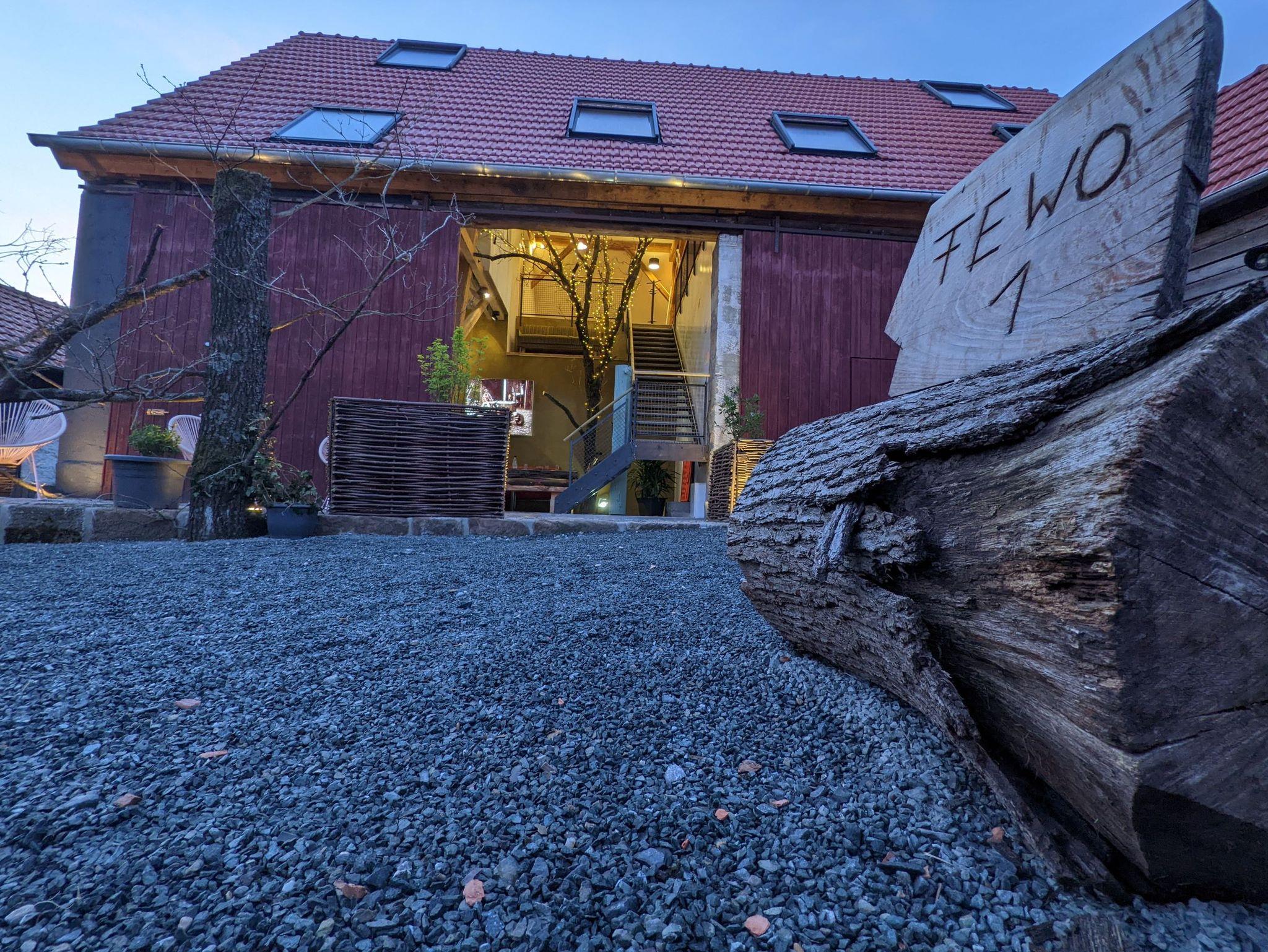 Im Eingangsbereich der Scheune sorgt die 10 Meter hohe Eiche für ein besonderes Ambiente. Am Treppenaufgang der offenen Galerie können Sie sich in unserem riesigen Gästebuch auf der Wand verewigen. Oben angekommen gibt es einen offenen Raum mit vielen Möglichkeiten zum Entspannen oder Lesen. Von da aus geht es auch in die 2 Tiny Häusern von denen eines Ihnen gehört. Im Tiny House gibt es ein Doppelbett für 2 und ein Sofa-Bett für eine weitere Person bzw. 2 Kinder. Zur Ausstattung gehören ein Aufenthaltsraum mit kleiner Kochnische, ein Essbereich und ein TV sowie ein Bad mit Dusche und WC. Über die Raumspartreppe (steile, schmale Treppe) kommen Sie auf Ihr Hochbett mit großartigem Blick in die offene Galerie der Scheune und einem XXL-Fenster direkt über dem Bett für den Sterneblick zum Einschlafen. Vor der Scheune gibt es noch eine große Terrasse für den Ausklang in der Abendsonne. Wir haben alles individuell gestaltet und versucht mit viele kreative Ideen sowohl im Design als auch bei der Ausstattung etwas Besonderes zu schaffen.