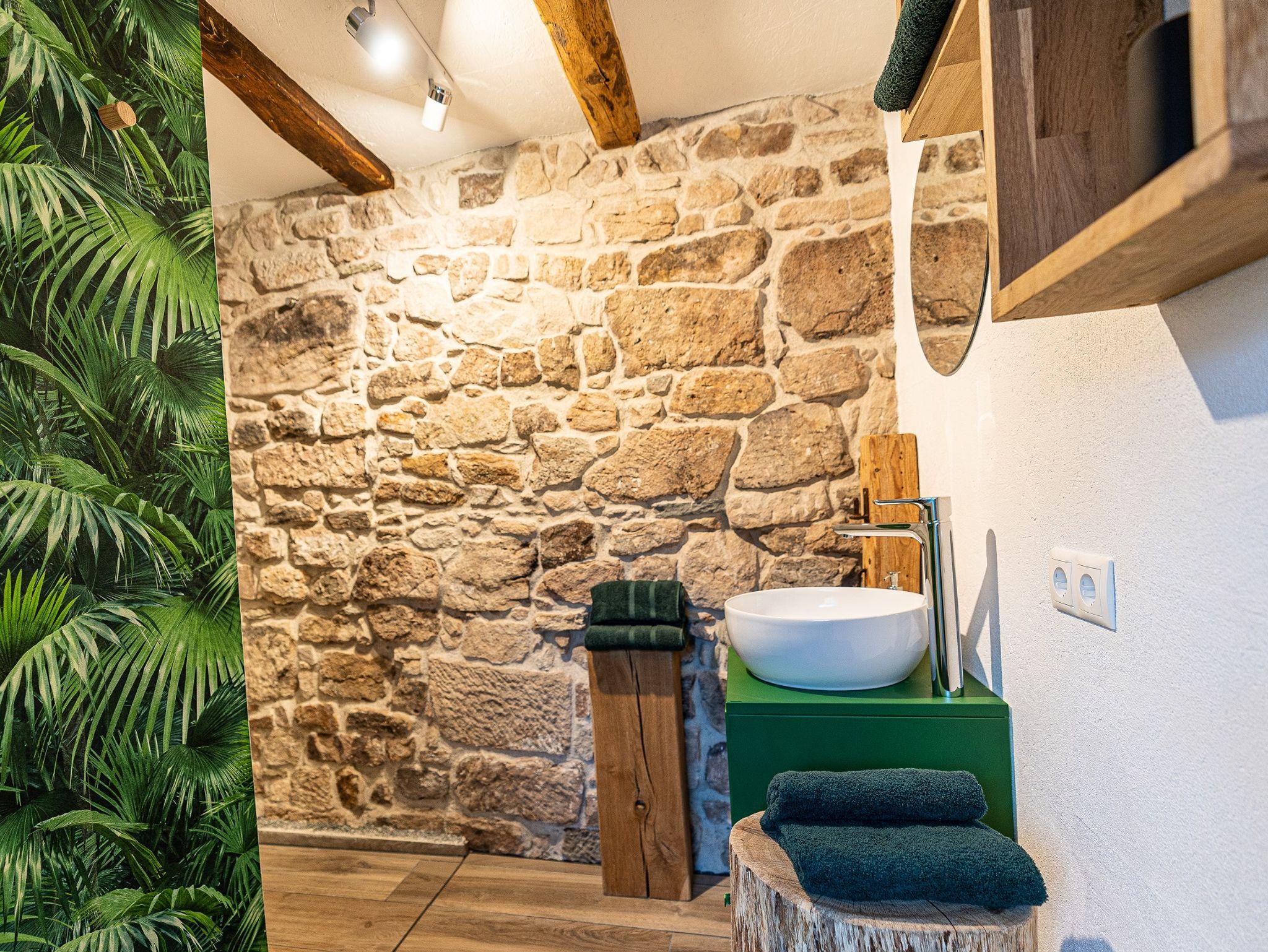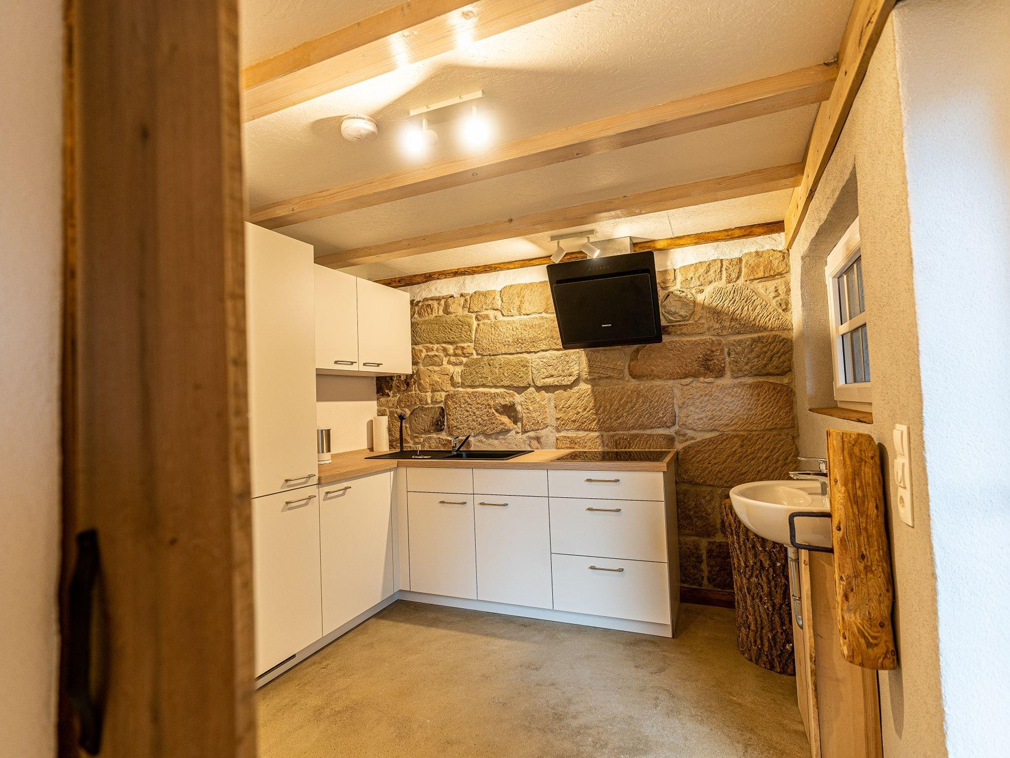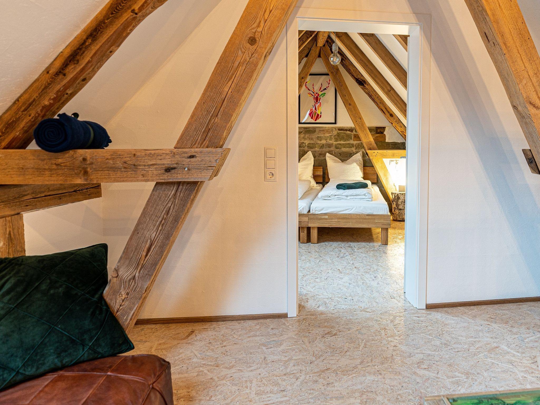Das Highlight der Ferienwohnung ist der offene Dachstuhl und die durch das ganze Gebäude laufende original Bruchsteinwand. Die zwei Schlafzimmer befinden sich in der offenen Galerie und verfügen jeweils über 1 Doppelbett. Wir haben jeden Raum individuell und außergewöhnlich gestaltet. Es gibt 2 Schlafzimmer, eine Küche, eine Dusche und ein separates WC. Auf unserer Terrasse können Sie gemütlich frühstücken oder am Abend grillen. Neben dem kostenfreien WLAN gibt es einen TV, einen Fahrradstellplatz mit Ladestation, zwei Parkplätze, gekühlte Getränke aus der Minibar sowie eine umfangreiche Versorgung mit hochwertigen Lebensmitteln aus der Region.