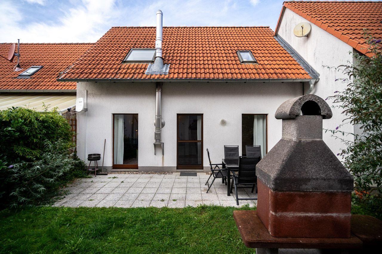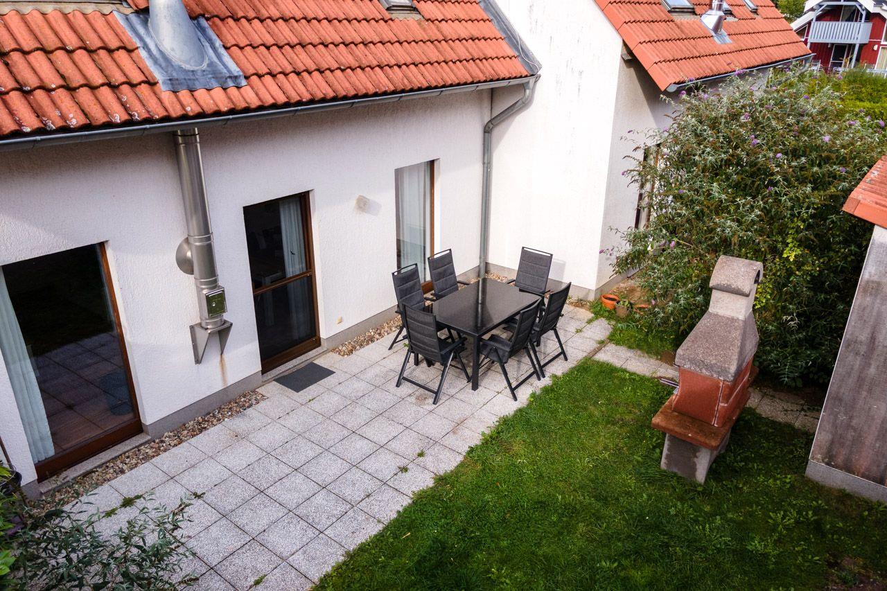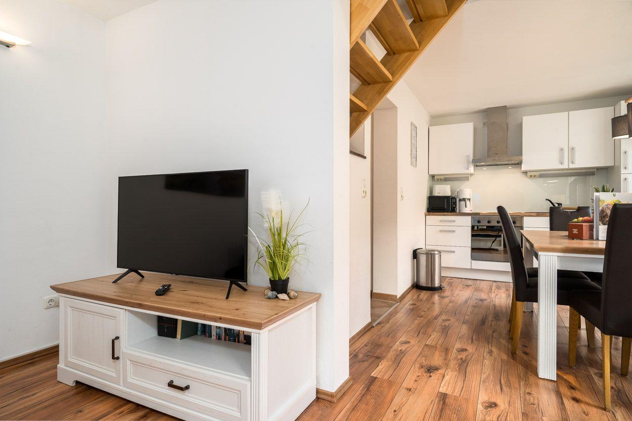 Das Ferienhaus/ Reihenhaus mit Süd- Terrasse, kleinem Garten, einem herrlichen Blick zum Hafen und nur 50 m vom Wasser entfernt, bietet auf 2 Ebenen und 4 Zimmern viel Platz zum Urlauben. Im gemütlich eingerichteten offenen Wohn- und Essbereich mit Kamin befinden sich ein Sofa, sowie Kabel-TV (SmartTV). Die offene Küche ist komplett ausgestattet mit Cerankochfeld, Backofen, Geschirrspüler, Kühlschrank mit TK-Fach, Kaffeemaschine, Mikrowelle, Toaster und Wasserkocher und alles was nötig ist. Von den 3 Schlafzimmern, befinden sich 2 im Obergeschoss (3 SZ mit Doppelbett), das Badezimmer mit bodengleicher Dusche im Erdgeschoss. Die Gartenmöbel und 1 Grill stehen zur Verfügung. 2 PKW Stellplätze befinden sich am Haus. Fliegengitter und Fußbodenheizung gehören ebenfalls zur Ausstattung. Die Stromkosten werden nach Verbrauch abgerechnet.