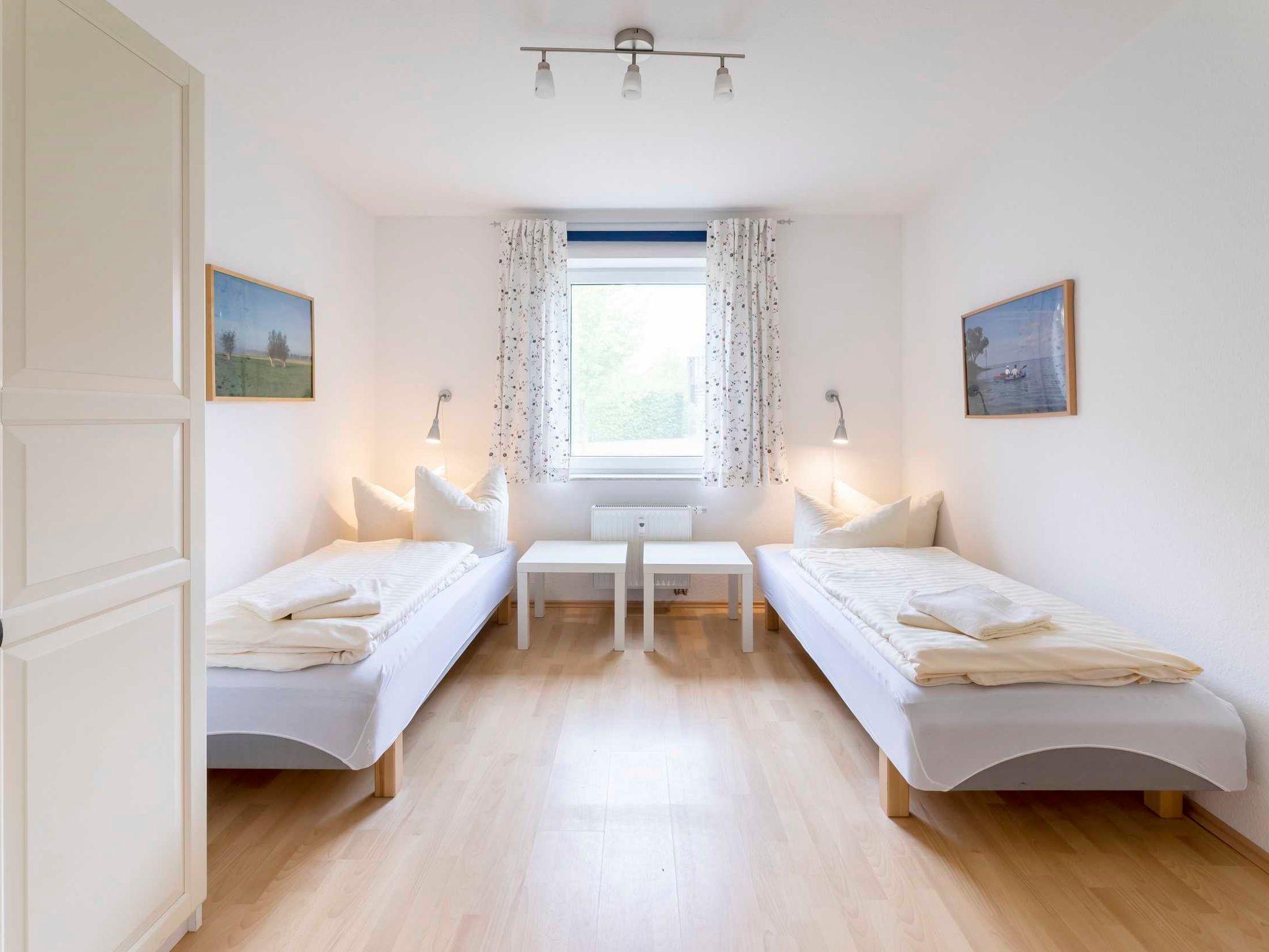 Die barrierefreie Ferienwohnung verfügt über ein Schlafzimmer mit 2 Einzelbetten. Eine zusätzliche Schlafcouch im Wohnzimmer bietet Platz für zwei weitere Personen.