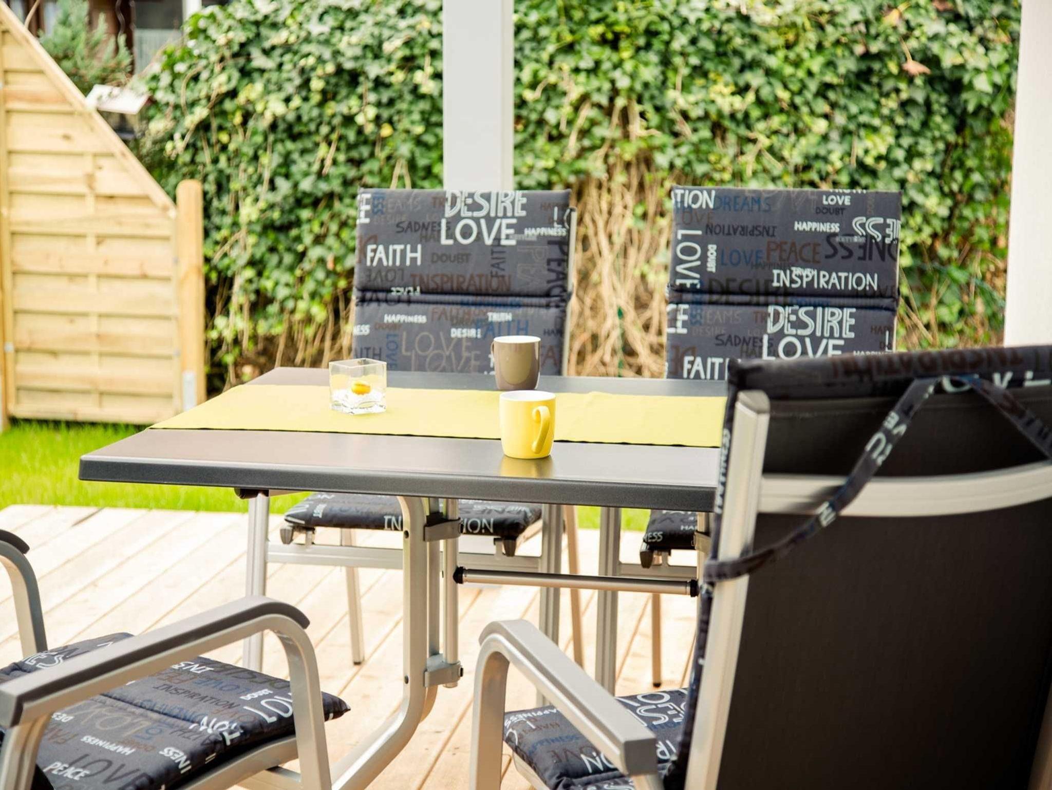 Die Abendsonne können Sie vor dem Haus genießen. Hier steht Ihnen eine weitere kleinere Terrasse mit Sitzgarnitur aus Holz zur Verfügung.