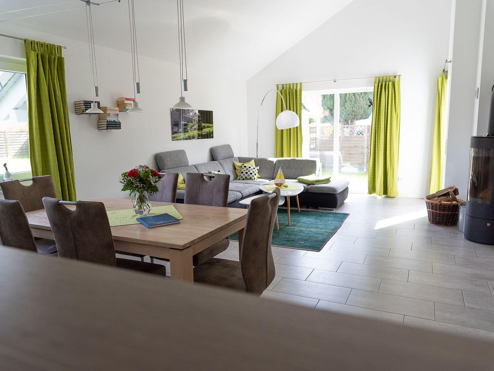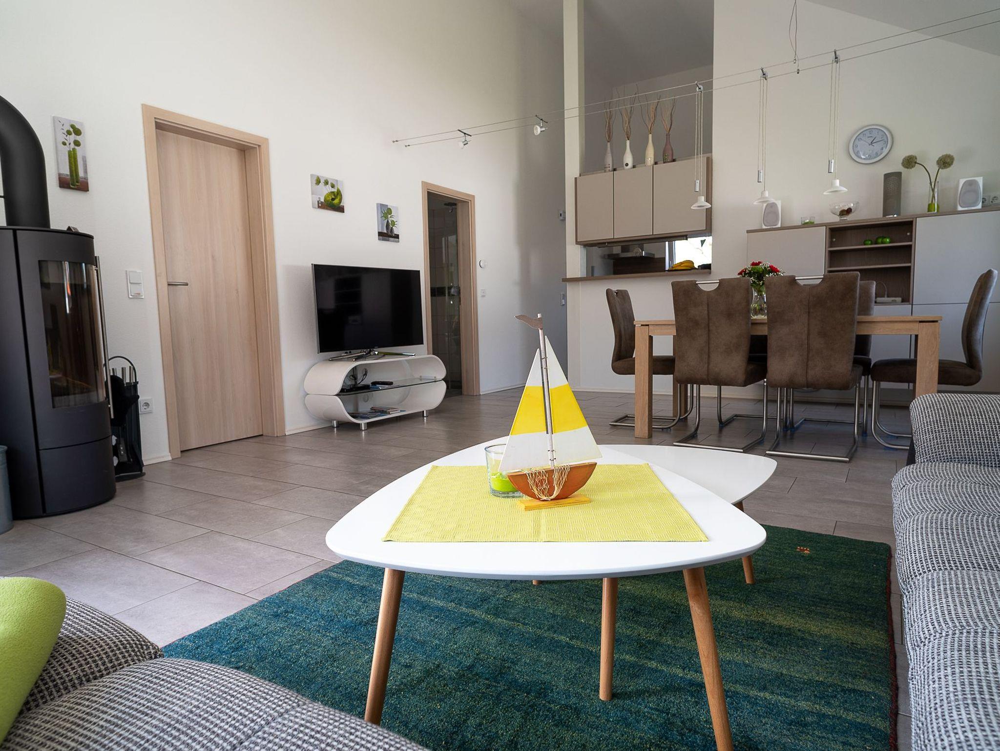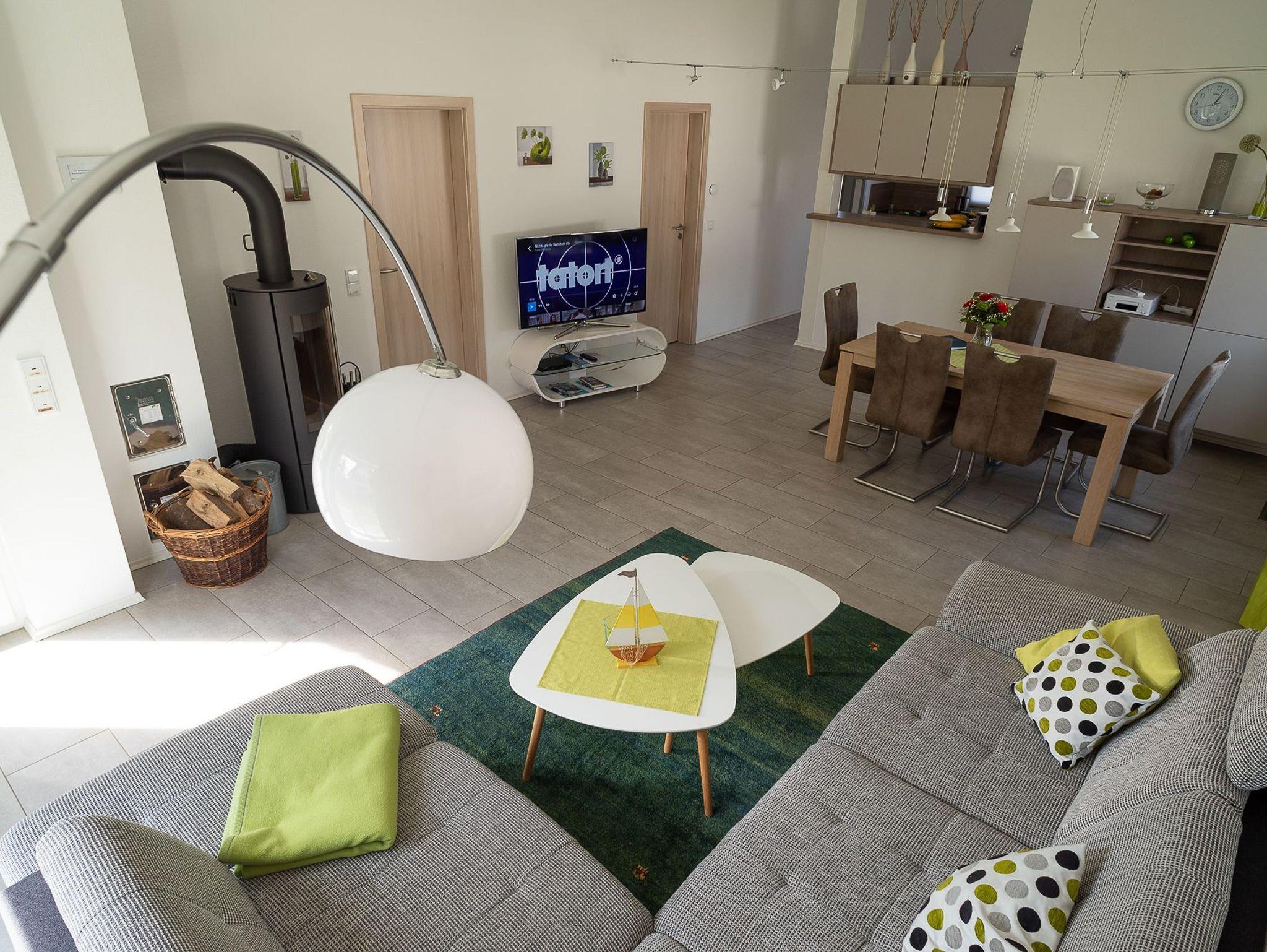 Von der Küche gelangen Sie durch einen Durchgang in das Wohnzimmer. Gleich zur Linken befindet sich ein Sideboard mit einer Hifi-Anlage. Diese verfügt über eine Dockingstation für Ihr iPhone und kann auch via Airplay angesteuert werden. Ein CD-Player sowie ein Radio-Tuner sind ebenfalls integriert. Vor dem Fenster befindet sich die Essecke mit sechs Stühlen. Eine Sofalandschaft vor dem bodentiefen Süd-Ost-Fenster lädt zu gemütlichen Klönrunden, zum Lesen oder zum Fernsehen ein. Ein großer LED-Flachbildfernseher sorgt dafür, dass Sie auch im Urlaub über alle Neuigkeiten in der Welt informiert werden. Möchten Sie auch im Urlaub online gehen, so steht Ihnen das kostenlose W-LAN zur Verfügung. An kalten Wintertagen können Sie durch ein prasselndes Feuer im Kaminofen für zusätzliche Gemütlichkeit sorgen.