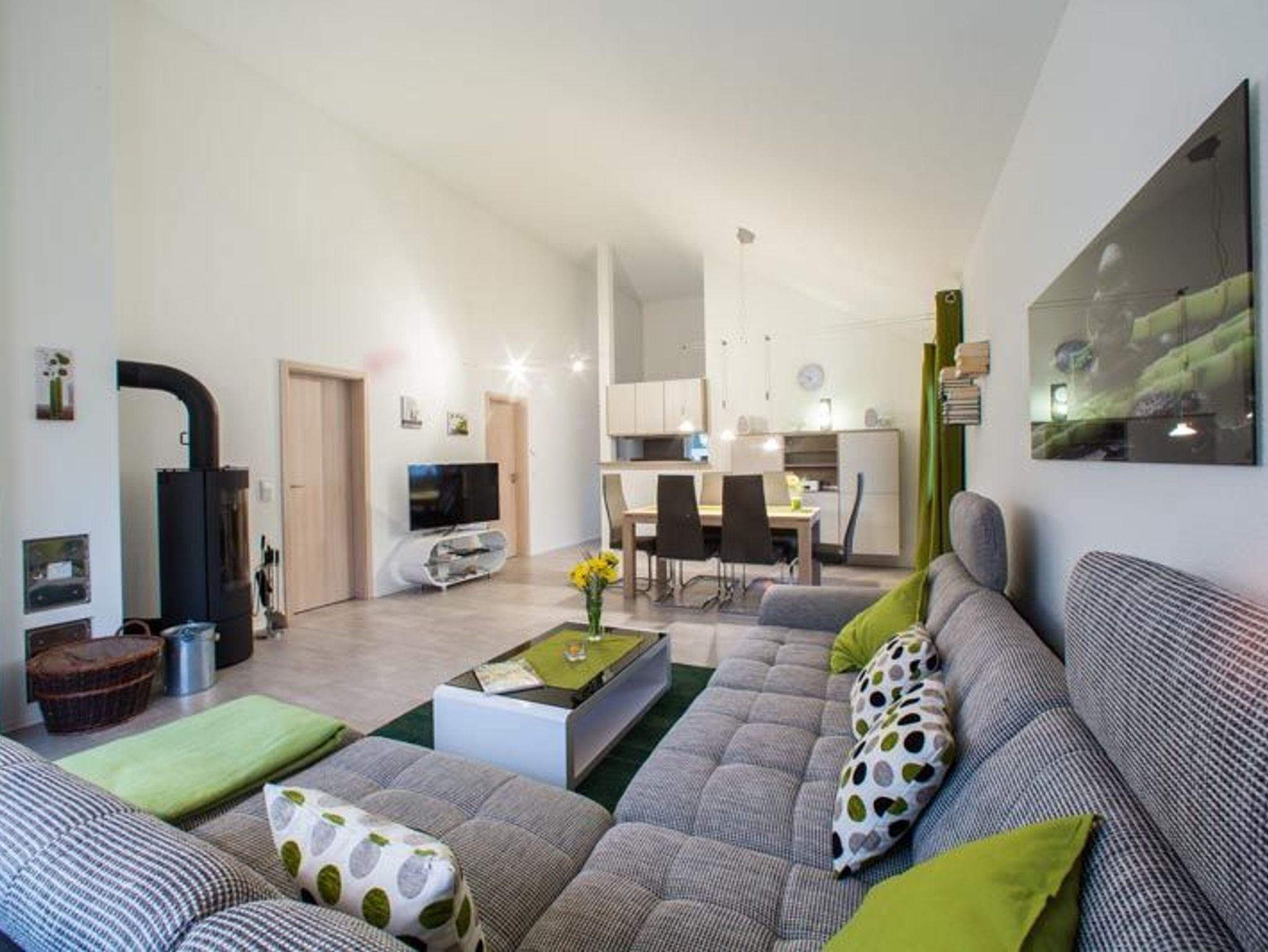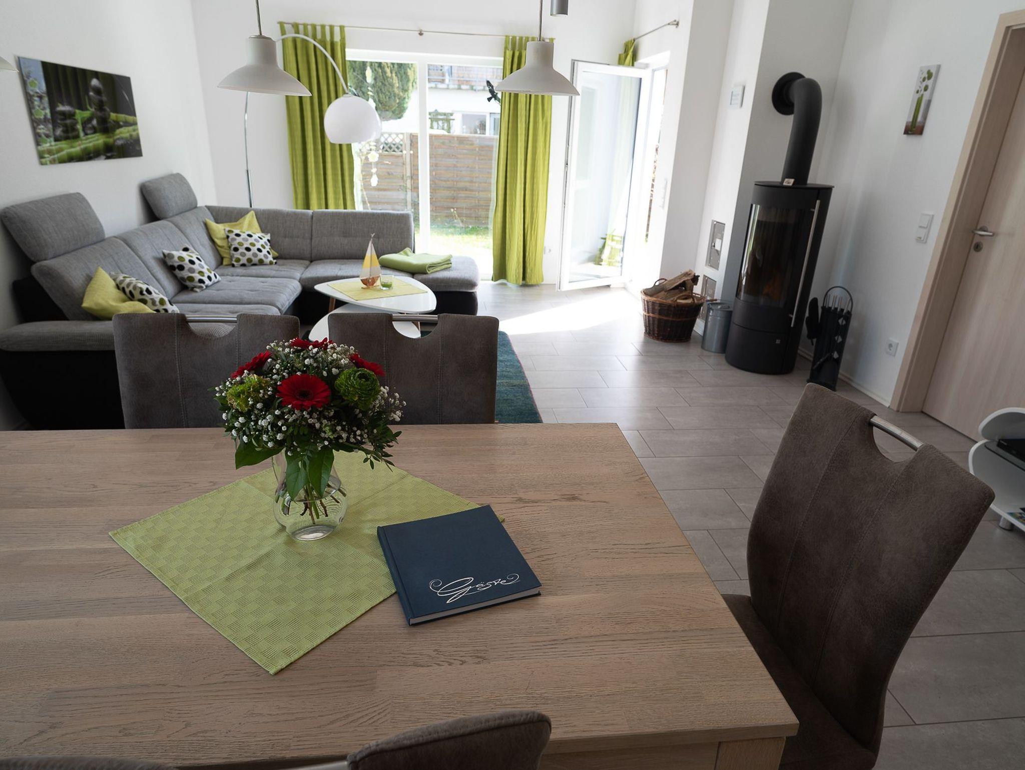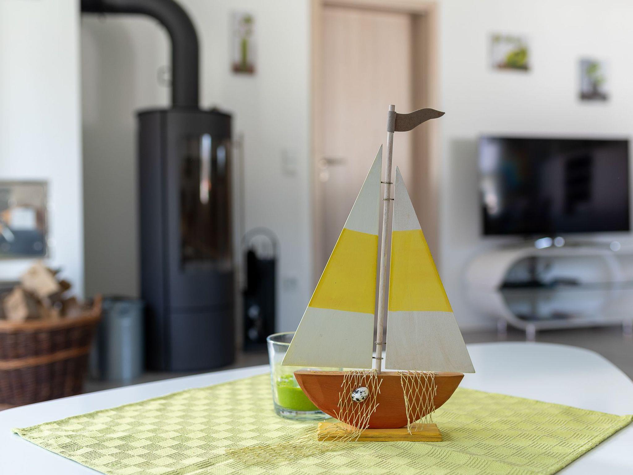 Von der Küche gelangen Sie durch einen Durchgang in das Wohnzimmer. Gleich zur Linken befindet sich ein Sideboard mit einer Hifi-Anlage. Diese verfügt über eine Dockingstation für Ihr iPhone und kann auch via Airplay angesteuert werden. Ein CD-Player sowie ein Radio-Tuner sind ebenfalls integriert. Vor dem Fenster befindet sich die Essecke mit sechs Stühlen. Eine Sofalandschaft vor dem bodentiefen Süd-Ost-Fenster lädt zu gemütlichen Klönrunden, zum Lesen oder zum Fernsehen ein. Ein großer LED-Flachbildfernseher sorgt dafür, dass Sie auch im Urlaub über alle Neuigkeiten in der Welt informiert werden. Möchten Sie auch im Urlaub online gehen, so steht Ihnen das kostenlose W-LAN zur Verfügung. An kalten Wintertagen können Sie durch ein prasselndes Feuer im Kaminofen für zusätzliche Gemütlichkeit sorgen.