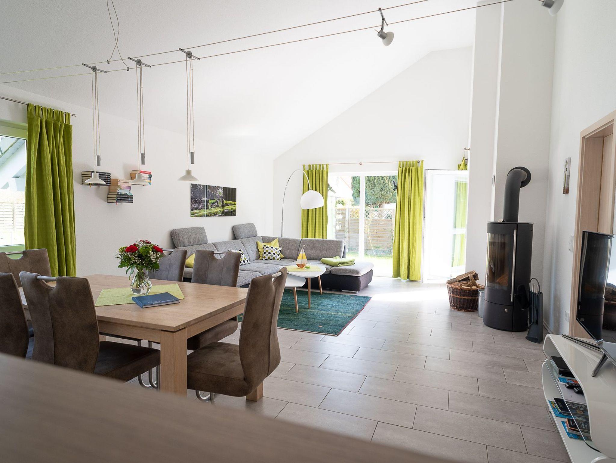 Das Haus bietet auf ca. 80 qm Wohnfläche reichlich Platz für einen erholsamen Urlaub mit bis zu vier Personen. Es wurde ähnlich der skandinavischen Häuser mit Dach gleich Decke als KfW70-Haus gebaut.