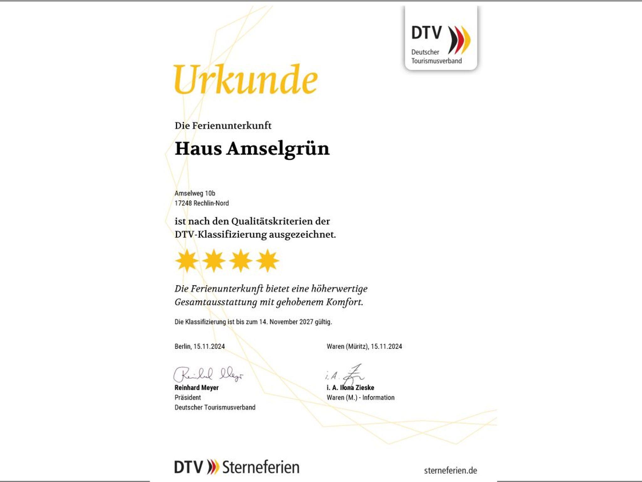 Unser Haus ist nach den Regeln des Deutschen Tourismusverbands mit 4 Sternen zertifiziert.