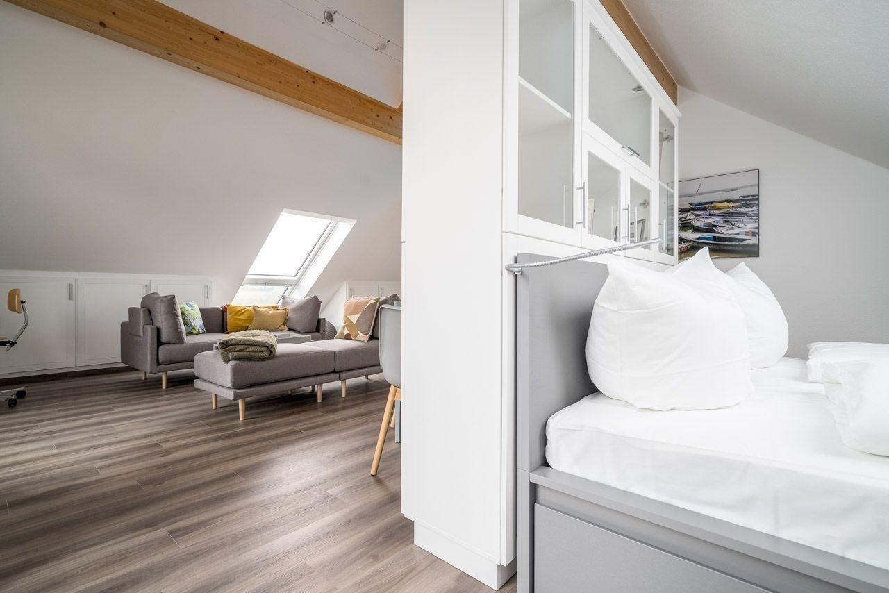 Diese einladende Ferienwohnung bietet eine ideale Kombination aus Komfort und modernem Design. Sie verfügt über ein Schlafzimmer mit einem gemütlichen Doppelbett sowie ein großzügiges Badezimmer mit bodengleicher Dusche, Badewanne und Fenster. Die offene Küche ist mit hochwertigen Geräten ausgestattet, darunter ein Geschirrspüler, Elektro-/Gasherd, Backofen, Mikrowelle und Kühlschrank – perfekt für Kochliebhaber.