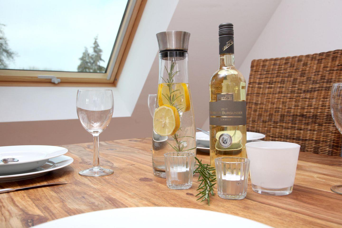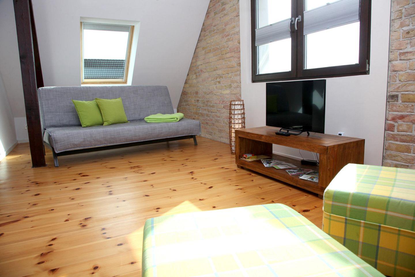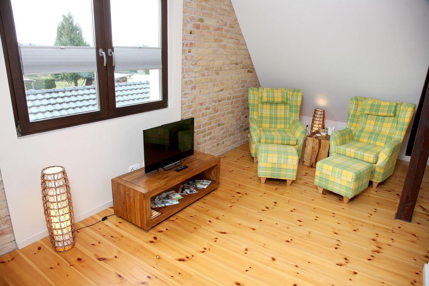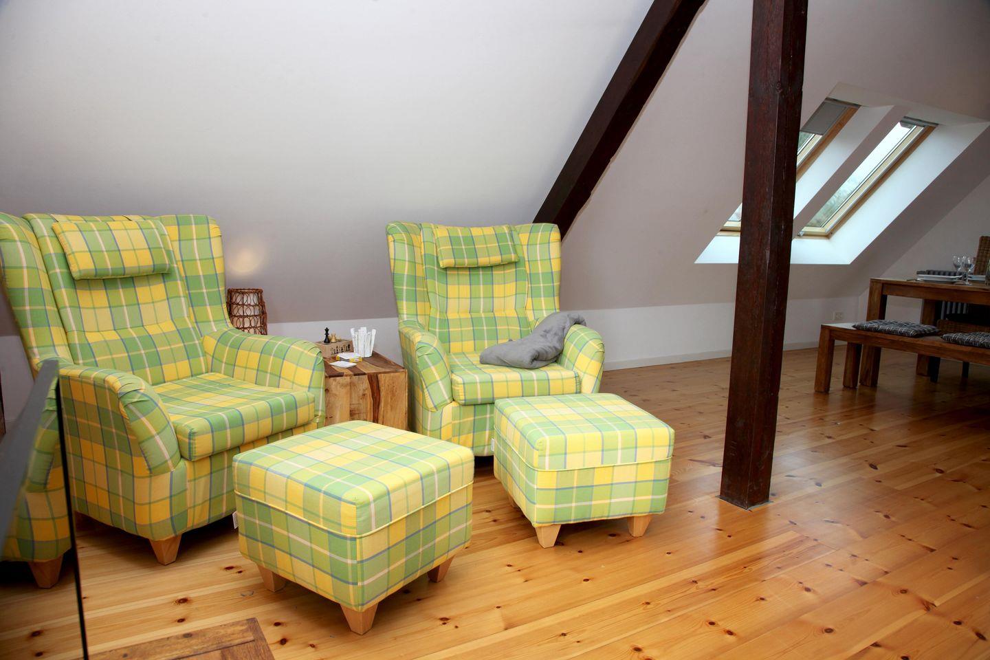 Die Ferienwohnung umfasst das komplette Obergeschoss eines Hauses mit zwei Ferienwohnungen. Das Haus wurde vor wenigen Jahren liebevoll saniert – dabei wurde Altes erhalten und mit Neuem architektonisch verbunden. Die Wohnung hat durch den bis in die Spitze geöffneten Wohnraum eine besondere Ausstrahlung. Sie bietet Ihnen einen kombinierten, lichtdurchfluteten Wohn- und Essbereich mit offener Küche. Die Küche ist mit einem Induktionskochfeld, Mikrowelle,