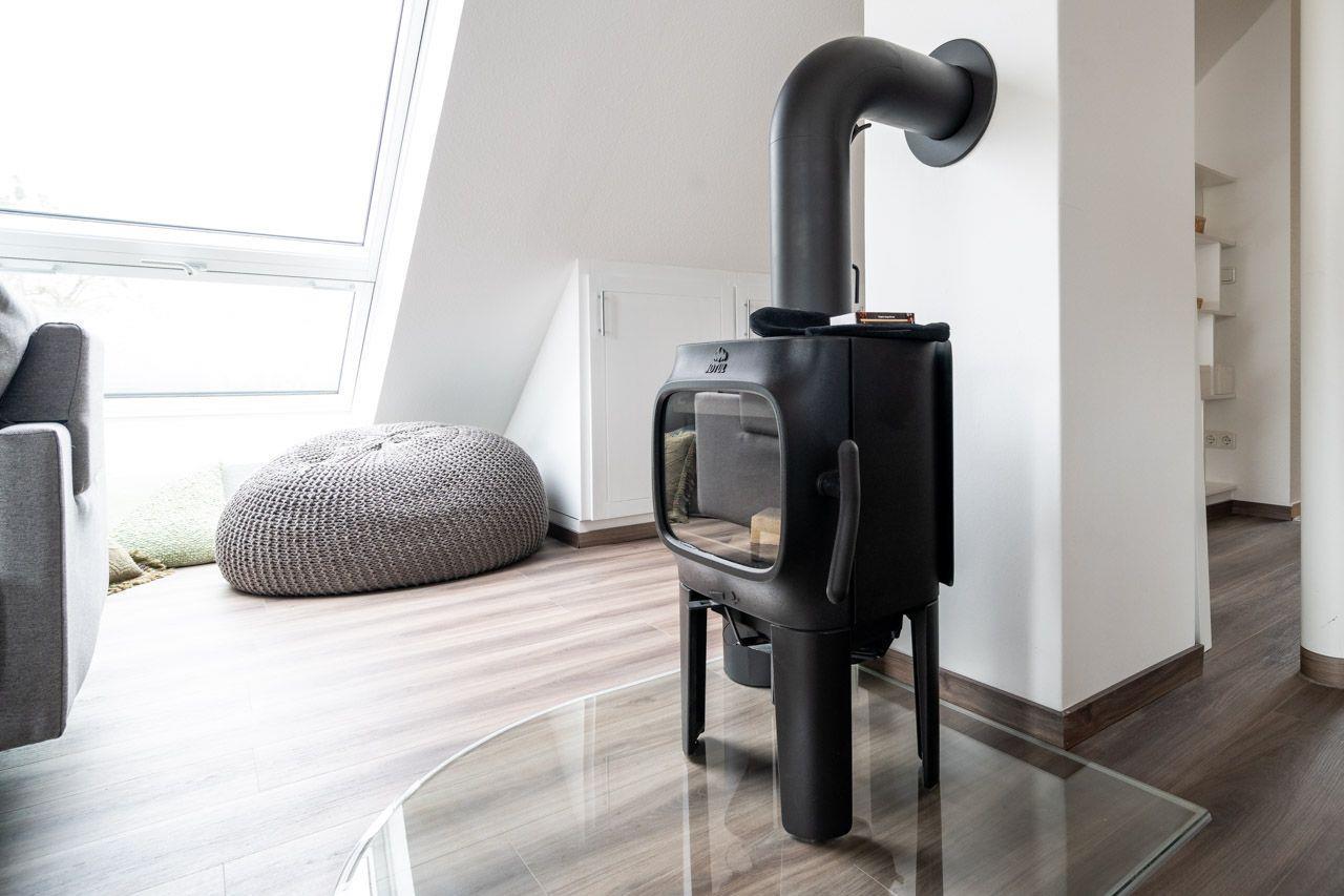 Gemütliches und modernes Ferienappartement und Platz für 2-3 Pers, offener Wohn- und Schlafbereich, große Küche mit Essbereich, Kamin, Waschmaschine, Sauna, Badewanne und Balkon mit Wiesen- und seitlichem Seeblick