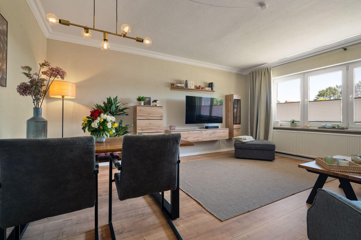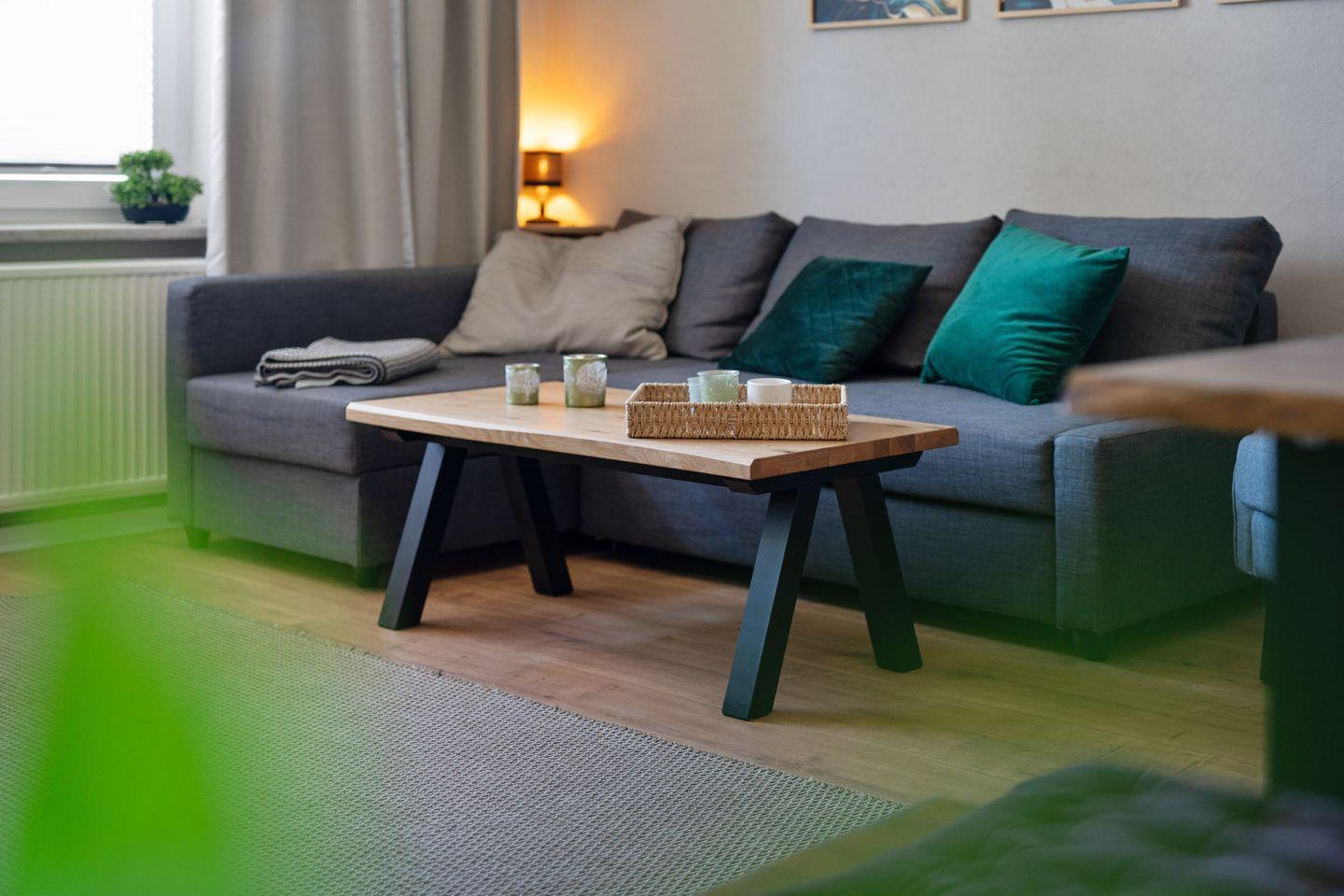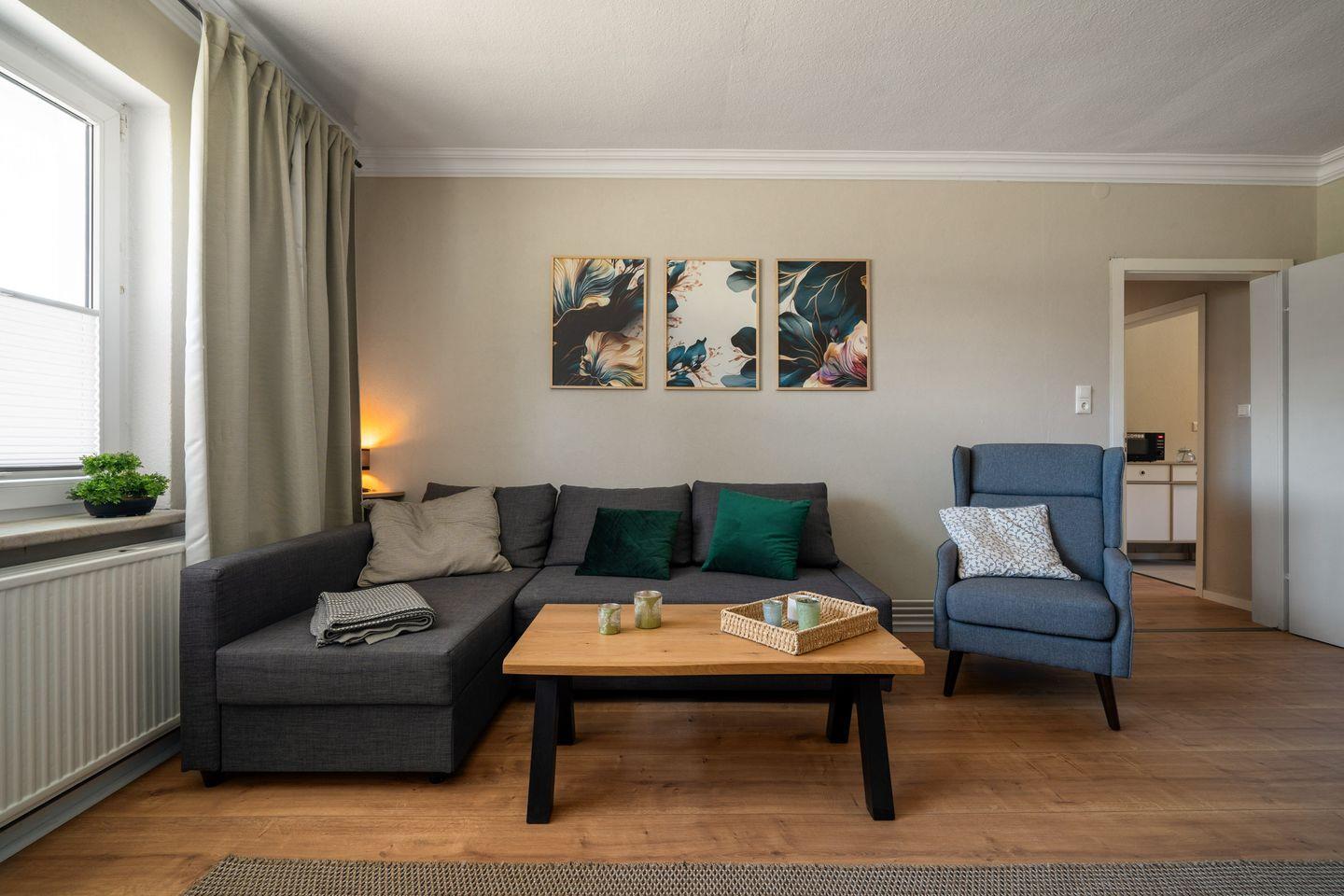 Die gut ausgestattete, geschlossene Küche bietet Ihnen alles, was Sie zur Zubereitung Ihrer Lieblingsgerichte benötigen. Das helle Wohnzimmer mit Schlafsofa und Essbereich lädt dazu ein, gesellige Abende zu verbringen. Zudem steht Ihnen ein modernes Badezimmer mit bodengleicher Dusche zur Verfügung, das zusätzlich mit einer Waschmaschine ausgestattet ist. Mit 2 Schlafzimmern ist die Ferienwohnung gut für mindestens 4 Personen geeignet.