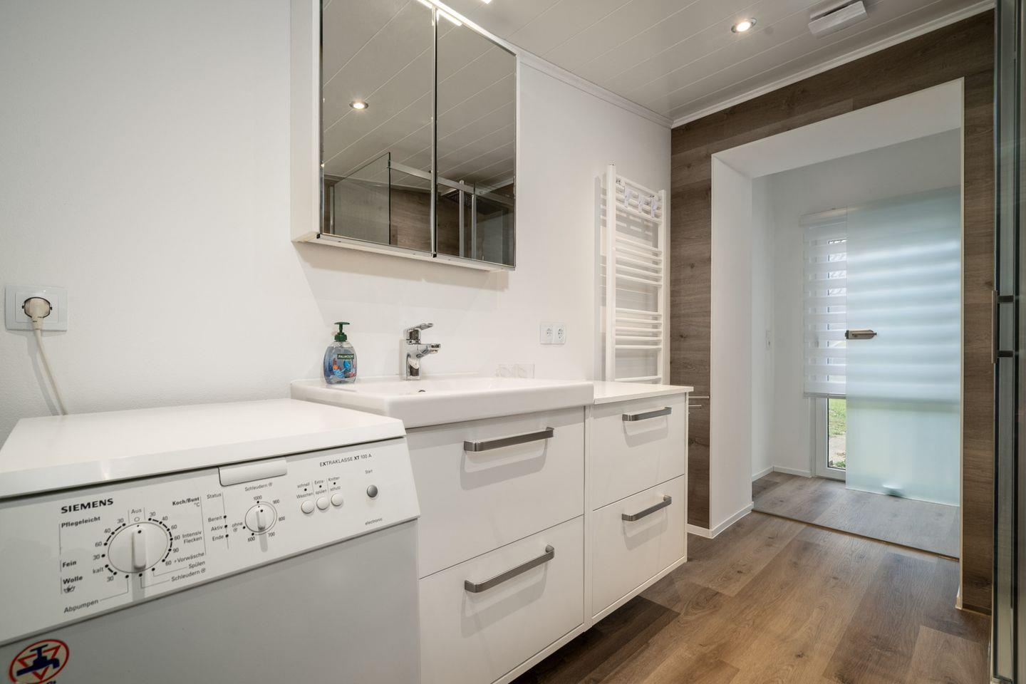 Das moderne Badezimmer ist mit einer bodengleichen Dusche, Fenster, Waschbecken, Haartrockner und WC versehen. Dank des vorhandenen Rauchmelders ist Sicherheit gewährleistet.