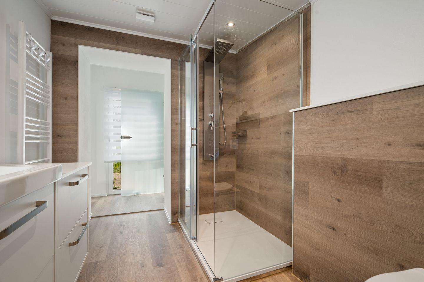 Das eingeschossige Haus verfügt über zwei Zimmer, darunter ein Schlafzimmer mit Vinylboden sowie ein geräumiges Wohnzimmer, das mit einer Sofaecke, TV (44–55 Zoll, digitaler Satellitenanschluss) und kostenlosem WLAN ausgestattet ist. Im Wohnzimmer schließt sich ein Essbereich mit Esstisch und gemütlicher Sofaecke an – perfekt für gemeinsame Mahlzeiten oder entspannte Abende. Für eine angenehme Atmosphäre zu jeder Jahreszeit sorgt die elektrisch betriebene Heizung. Große Fenster mit Sichtschutz und Fliegengitter bieten viel Tageslicht und gleichzeitig Privatsphäre.