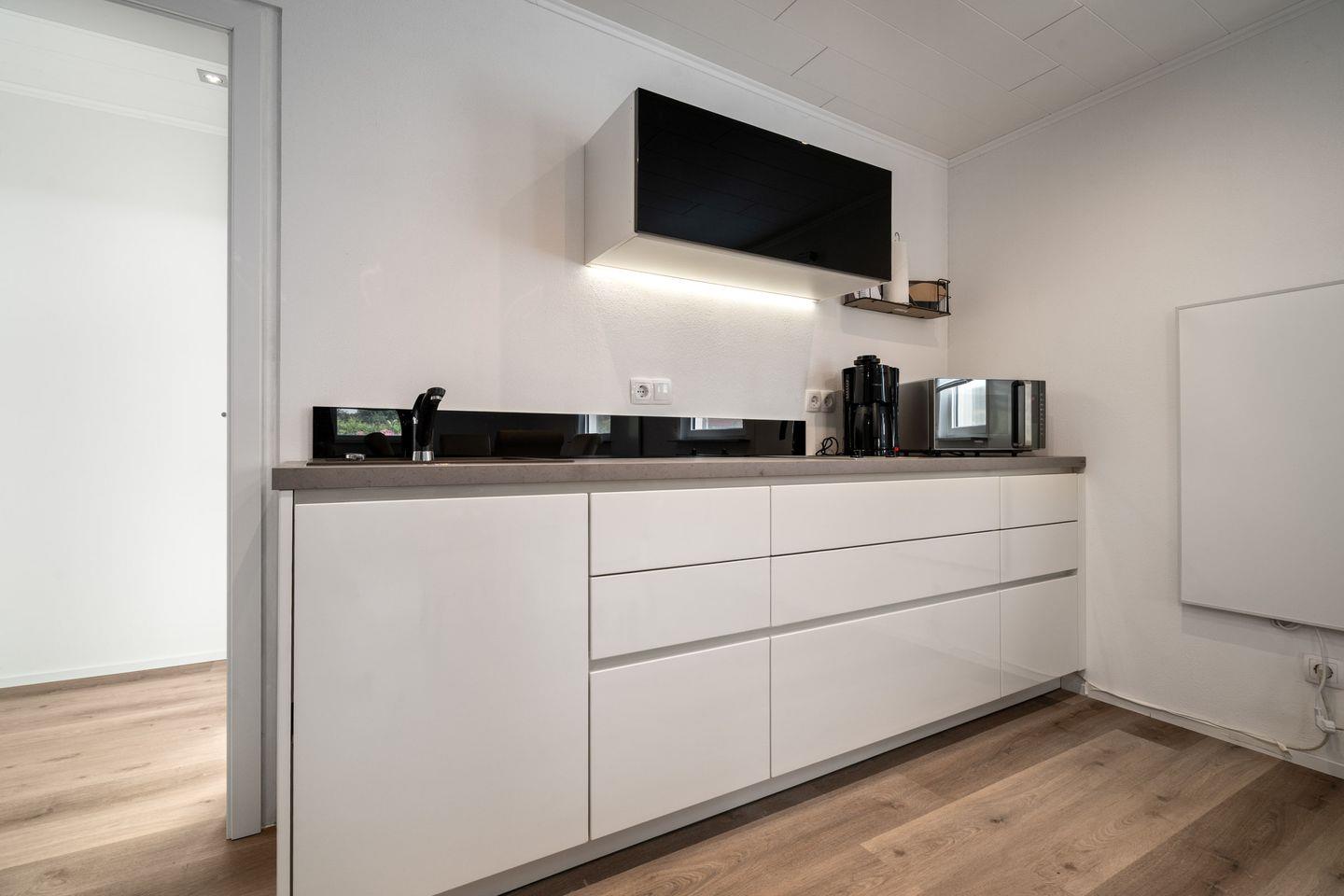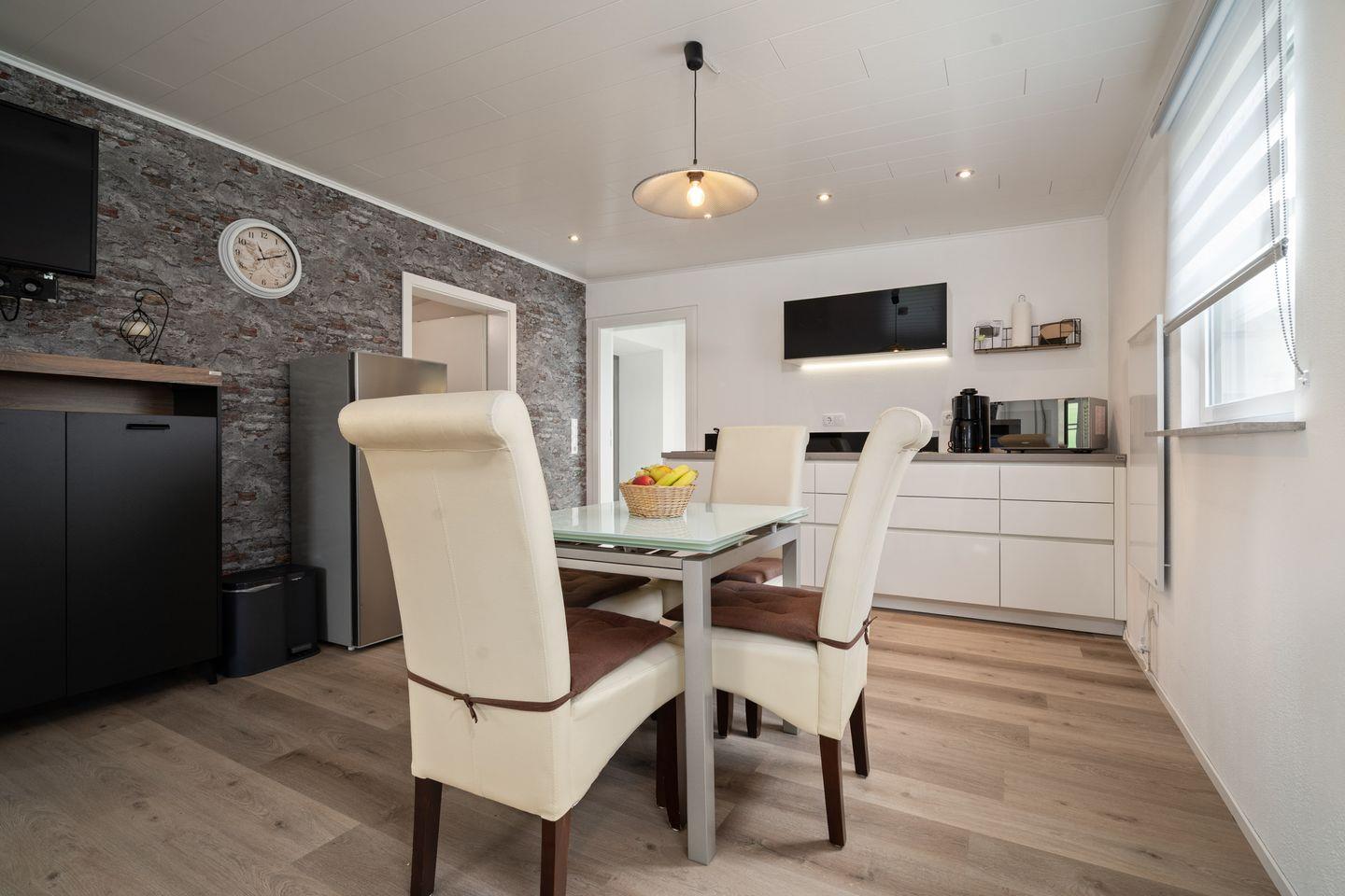 Die offene Küche ist zum Wohnzimmer hin ausgerichtet und bietet umfassende Ausstattung: Ein 2-Platten-Elektroherd, Mikrowelle, Wasserkocher, Toaster, Kaffeemaschine, Kühlschrank mit integriertem Gefrierfach, ausreichend Geschirr, Besteck, Küchenutensilien und verschiedene Gewürze ermöglichen eine flexible Selbstversorgung. Praktische Details wie ein Bügelbrett, Bügeleisen, Wäscheständer und Staubsauger stehen zur Verfügung. Die Erstausstattung an Reinigungsmitteln ist bereitgestellt.