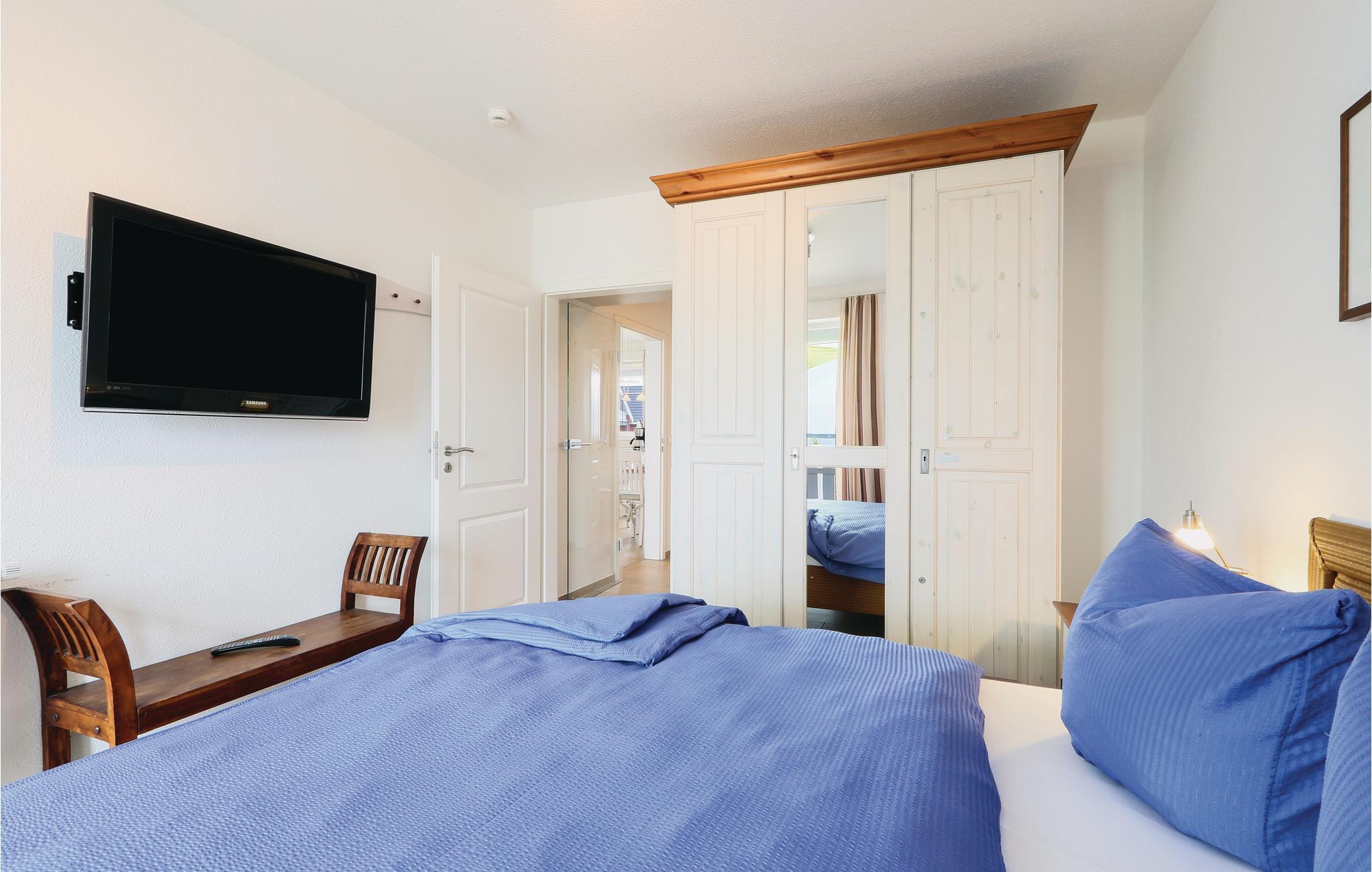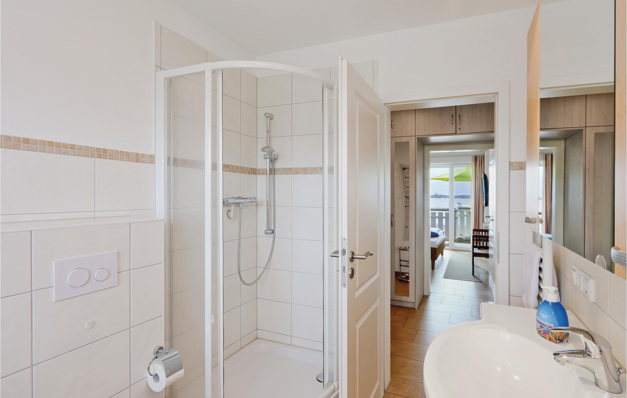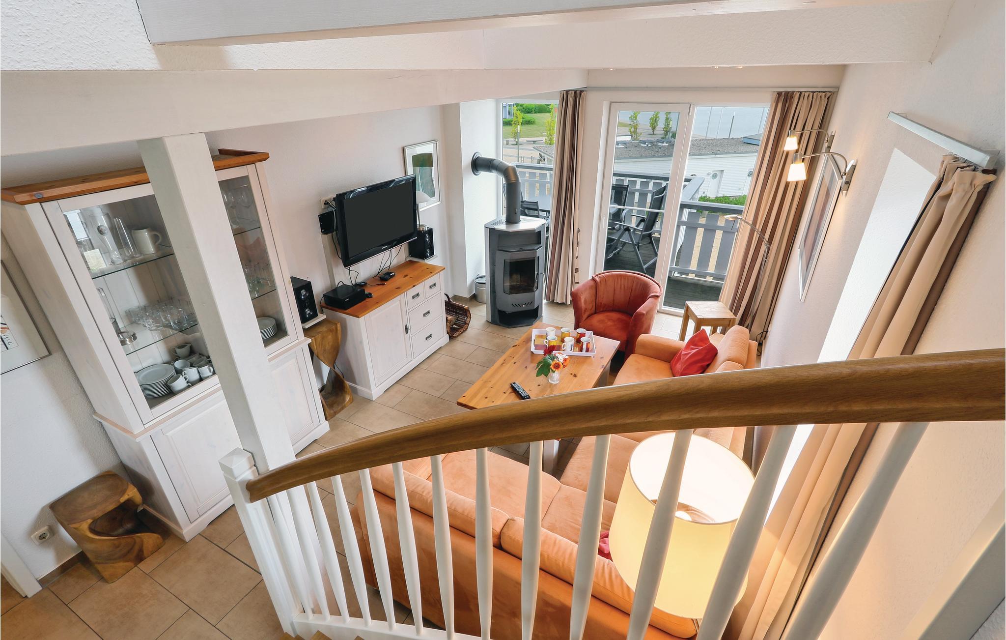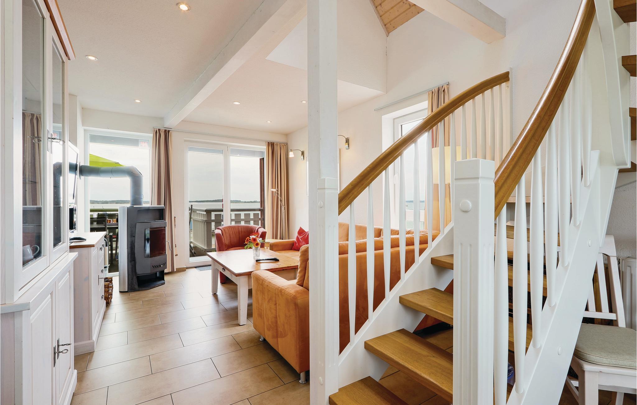 Den toplans lejlighed Kapitänsdeck har en skøn panoramaudsigt over Müritz fra de to altaner. Da der er to altaner er der sol fra morgen til aften. Skulle det ikke være vejr til udendørs ophold, så kan I nyde livet i den lyse stue og tænde op i kaminen. I det store badeværelse er der brusebad og whirlpool, til et afslappet ophold. Der er føntørrer i badeværelset.