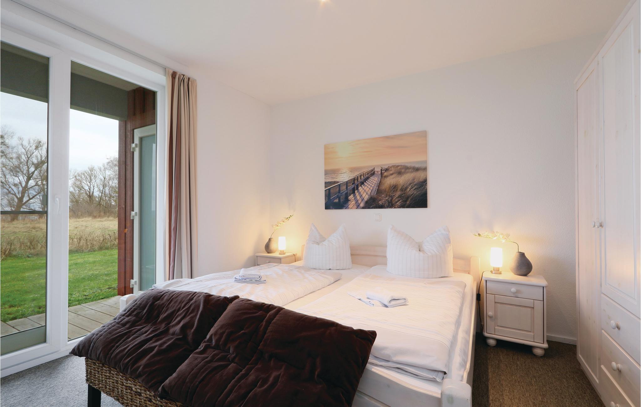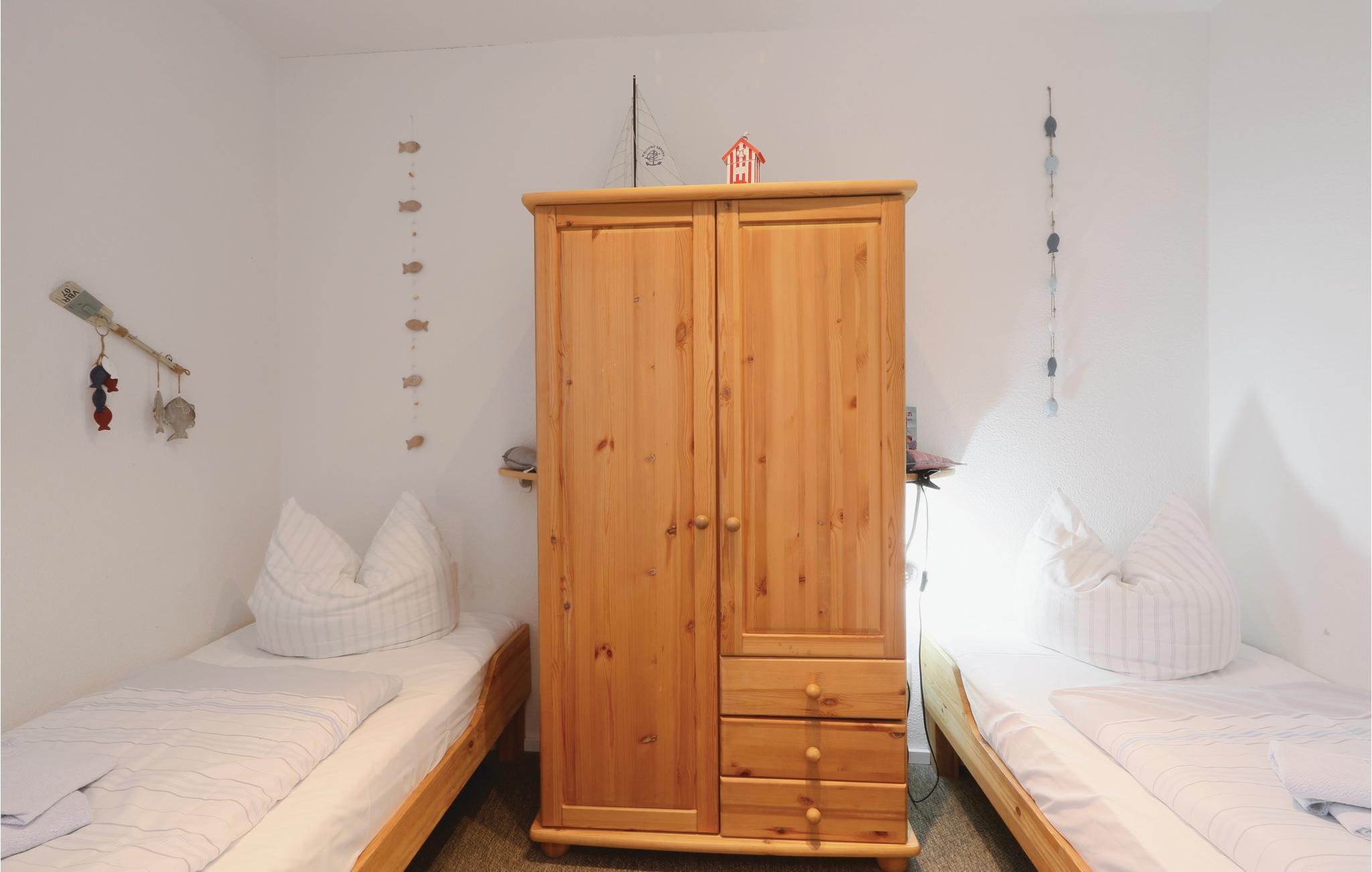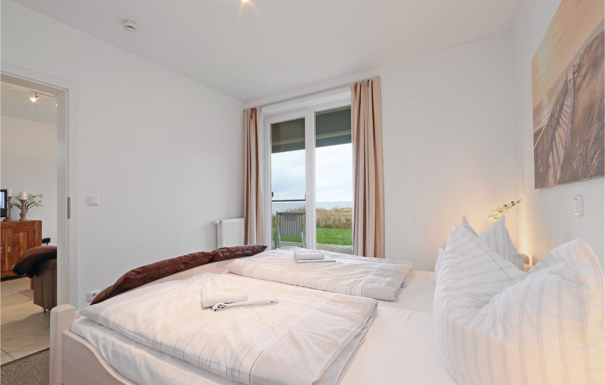 Fra soveværelset med dobbeltsenge er der direkte adgang til terrassen. Soveværelse no. 2 har to enkeltsenge. Der er føntørrer i badeværelset.