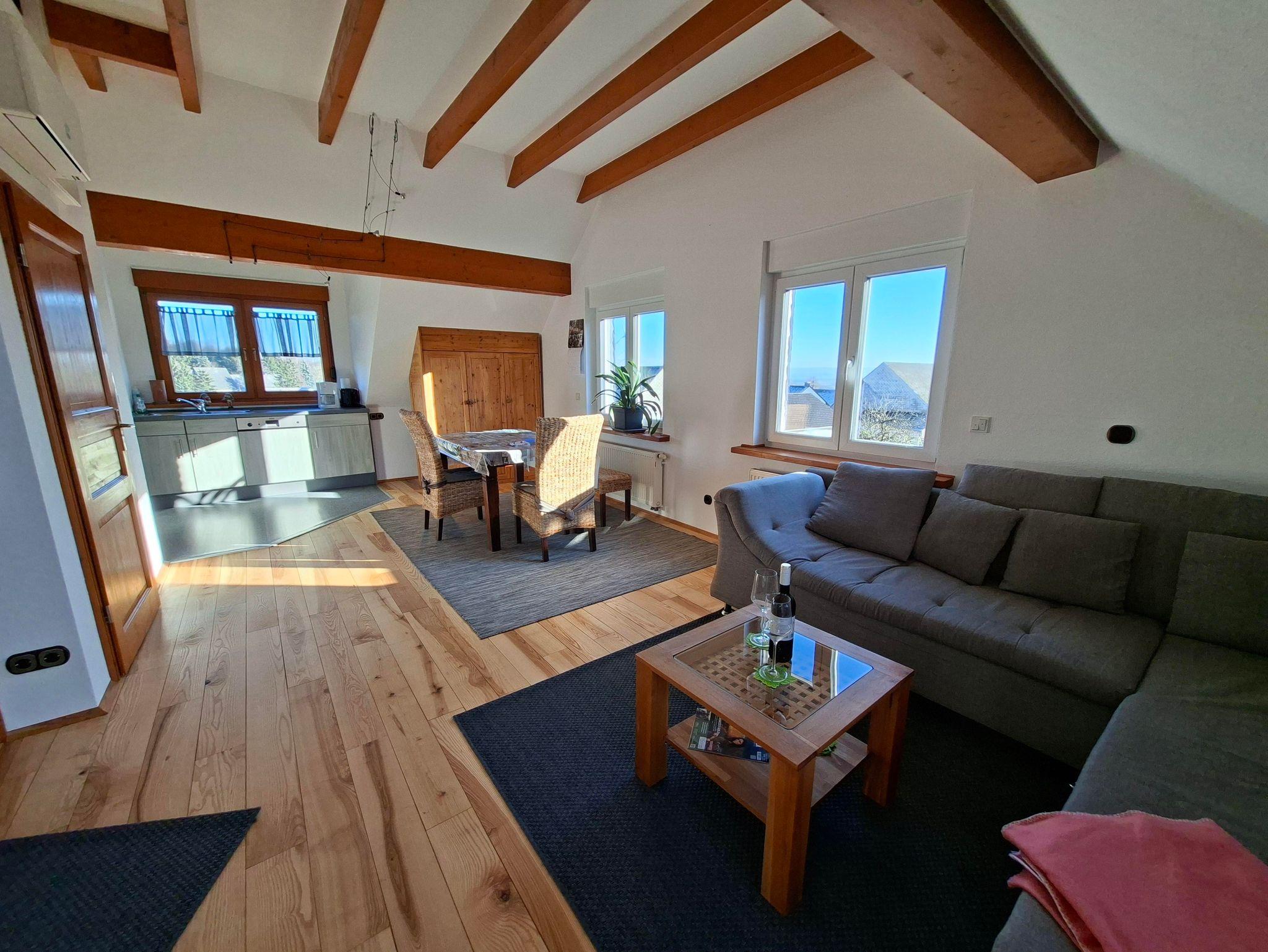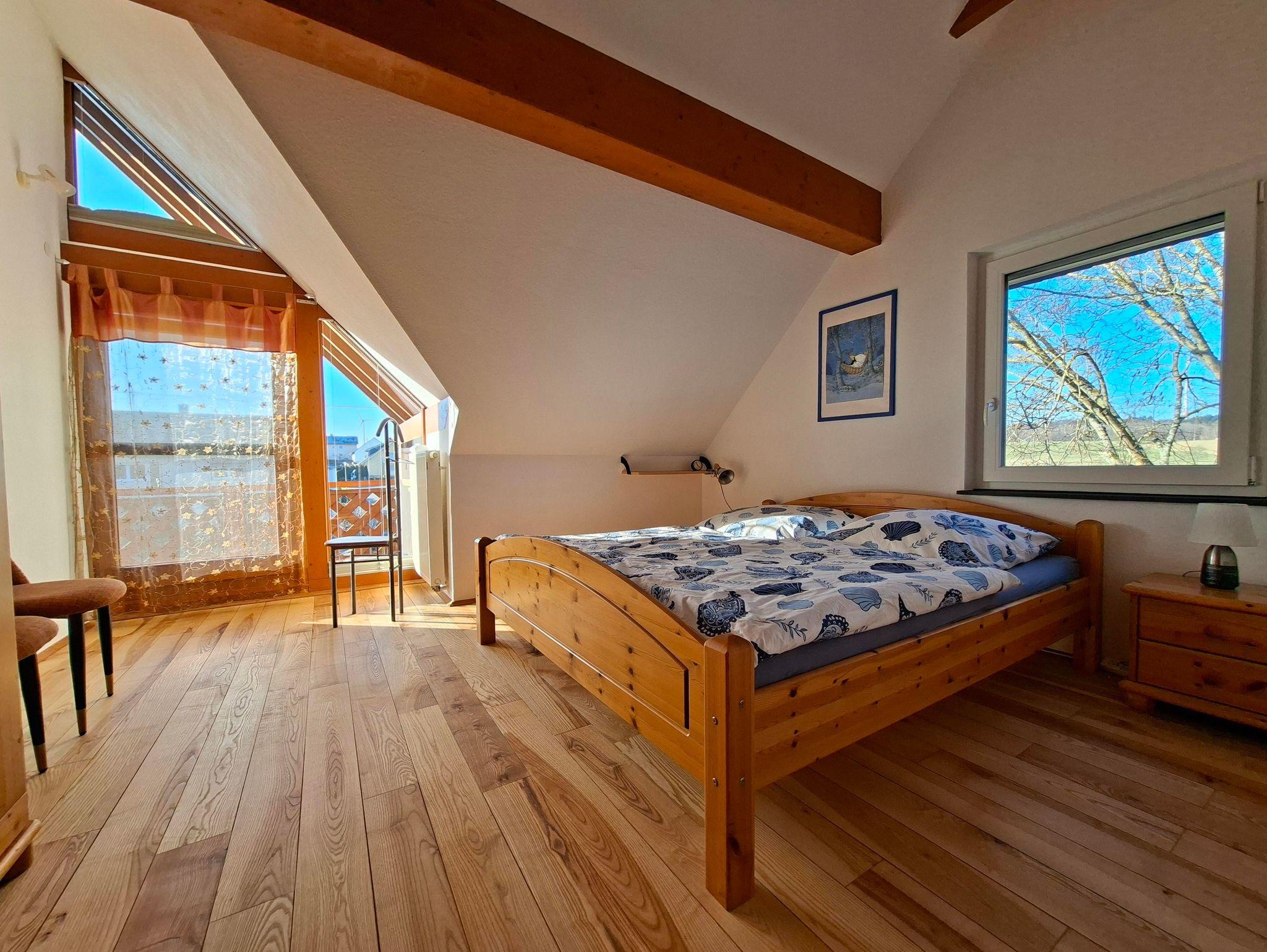 Moderne, helle, 62 qm große Ferienwohnung, mit vielen Fenstern und tollem Weitblick. Die Ferienwohnung ist offiziel vom deutschen Tourismusverband mit 4 Sternen zertifiziert , ruhig gelegen am Ortsrand von Reckershausen und bietet eine komfortable Unterkunft für 2 Personen. Ein Kinderbett kann auf Wunsch zusätzlich aufgestellt werden. Die Wohnung hat 1 Schlafzimmer, ein grosszügiges Küchen-Wohnstudio, ein Bad und einen Balkon. Auf dem Balkon zur Südseite können Sie von mittags bis abends die Sonne genießen und rauchen. In der Grillhütte können Sie selbst bei schlechtem Wetter grillen. Der naturnahe Spielplatz mit Barfußpfad ist 200m vom Haus entfernt.
