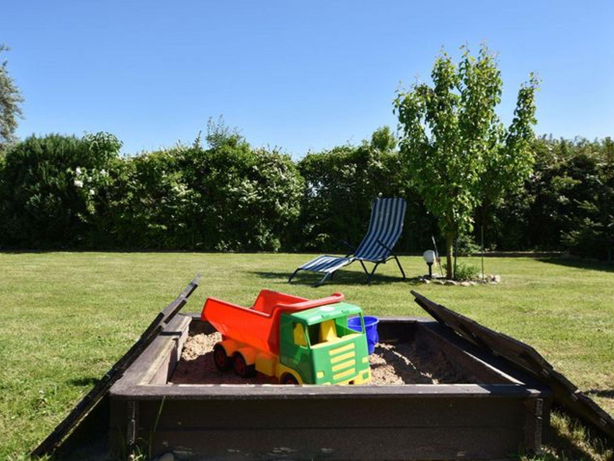 Eine Sandkaste und eine Schaukel stehen im Garten bereit.