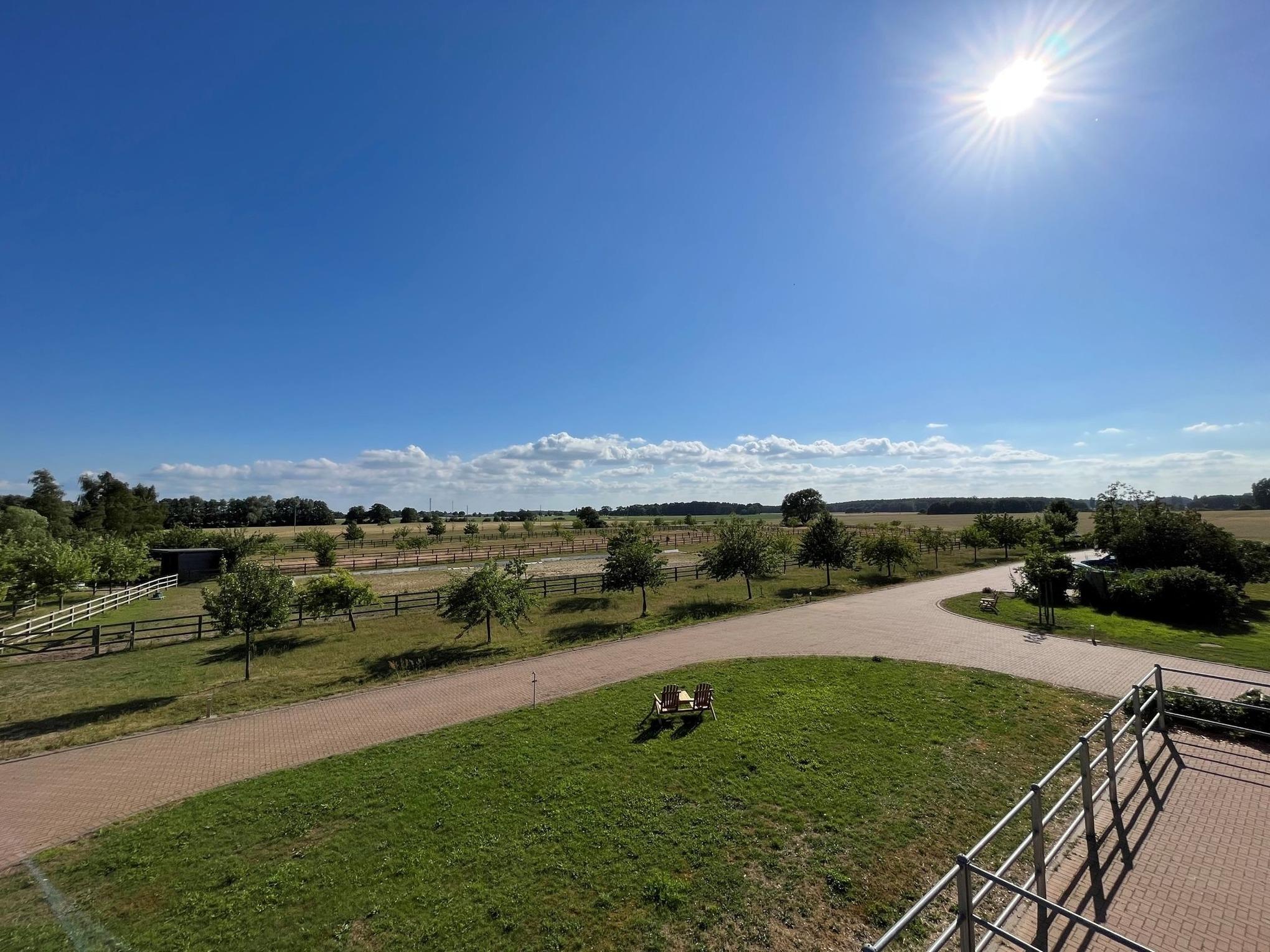 Balkon: Vom Wohnbereich aus gelangen Sie auf einen großzügigen Balkon mit Gartenmöbeln und Sonnenschirm, der einen weiten Blick über die Pferdekoppel, Wiesen und Felder bietet.