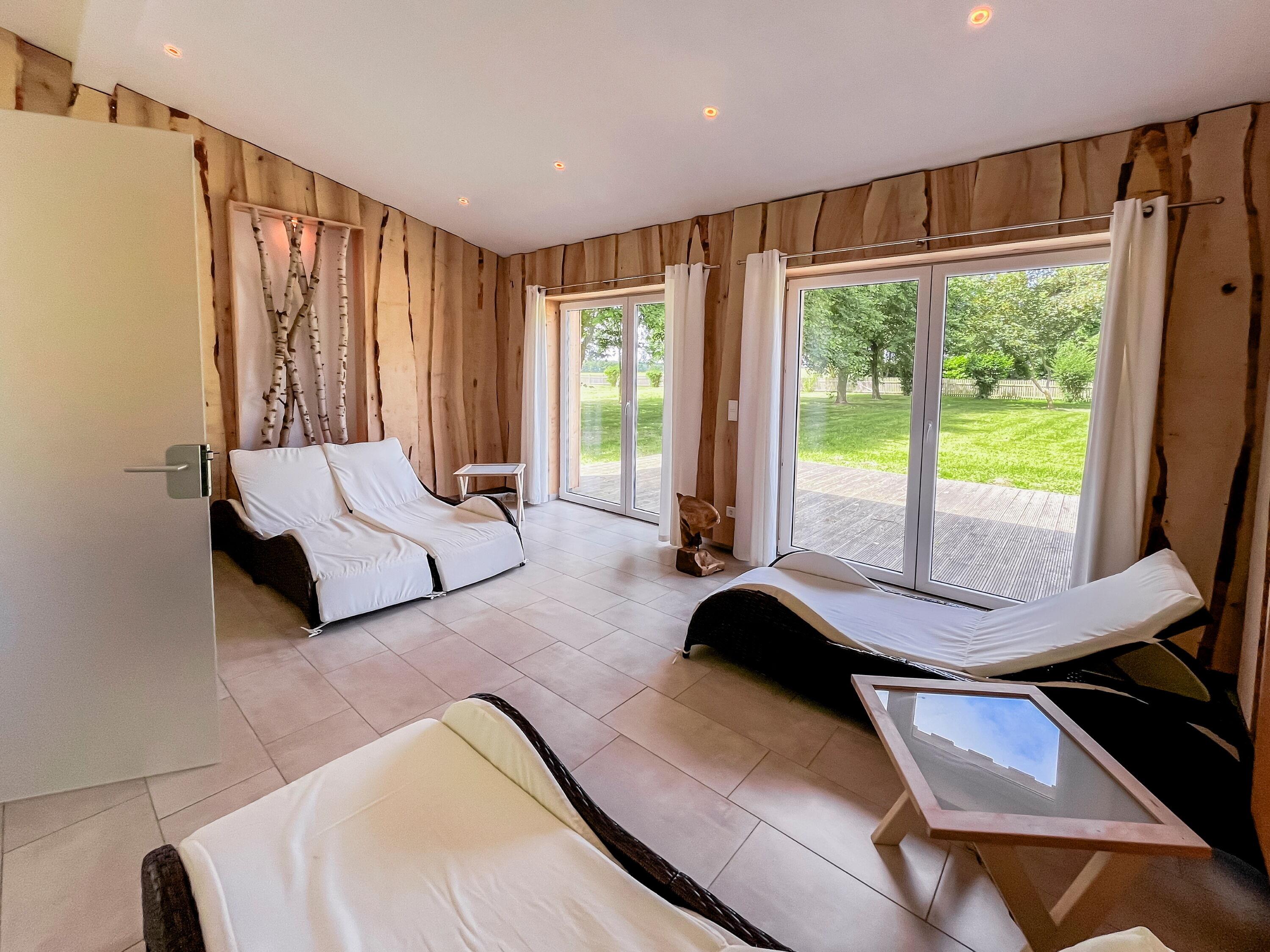 Die parkähnliche Gartenanlage des Lerchenhofs steht allen Gästen zur Verfügung und lädt mit Sitzmöglichkeiten und Sonnenliegen zum Relaxen ein. Für zusätzliche Entspannung sorgt das moderne Saunahaus, das 2022 fertiggestellt wurde (Nutzung gegen Gebühr). Mit Ruhebereich und einer Außenterrasse mit Sonnenliegen bietet es den perfekten Ort für Wellnessmomente.