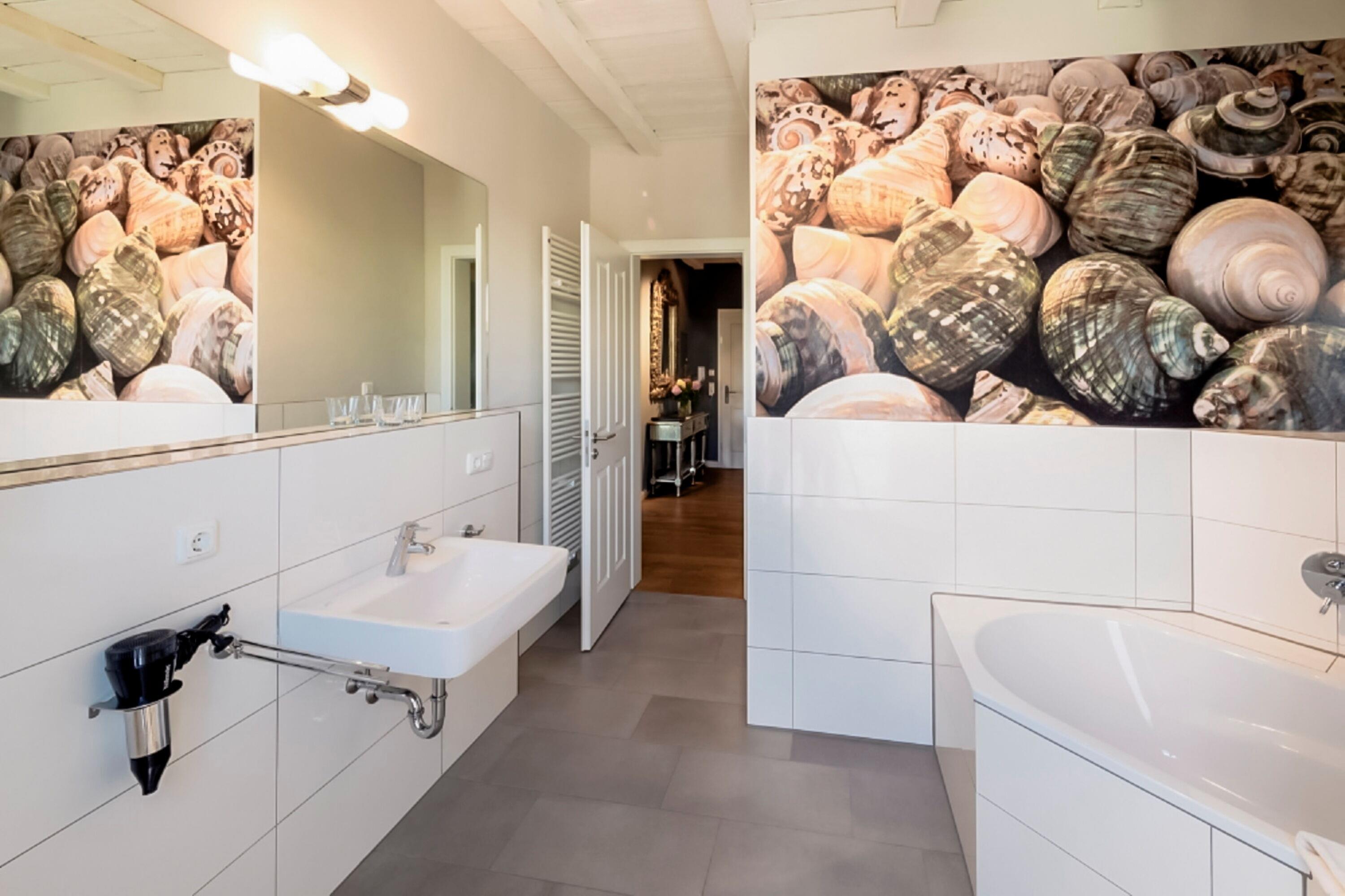 Luxuriöses Badezimmer: Badewanne, Dusche, Waschtisch und WC sorgen für höchsten Komfort.
