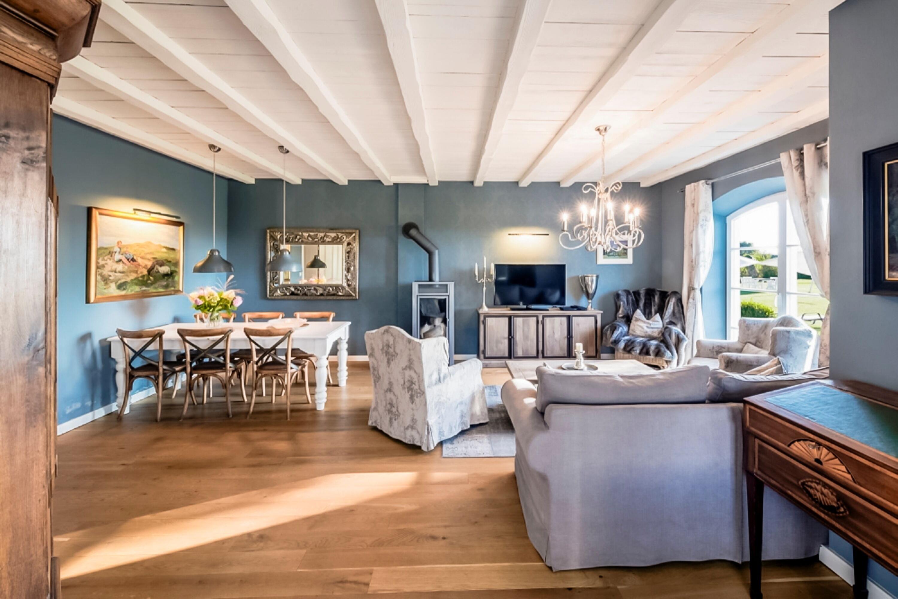 Großzügiges Wohnzimmer: Harmonisch abgestimmte Einrichtung im Landhausstil, Holzdielenboden, behagliche Fußbodenheizung sowie ein Kamin und ein TV-Flatscreen machen diesen Raum zur Wohlfühloase.