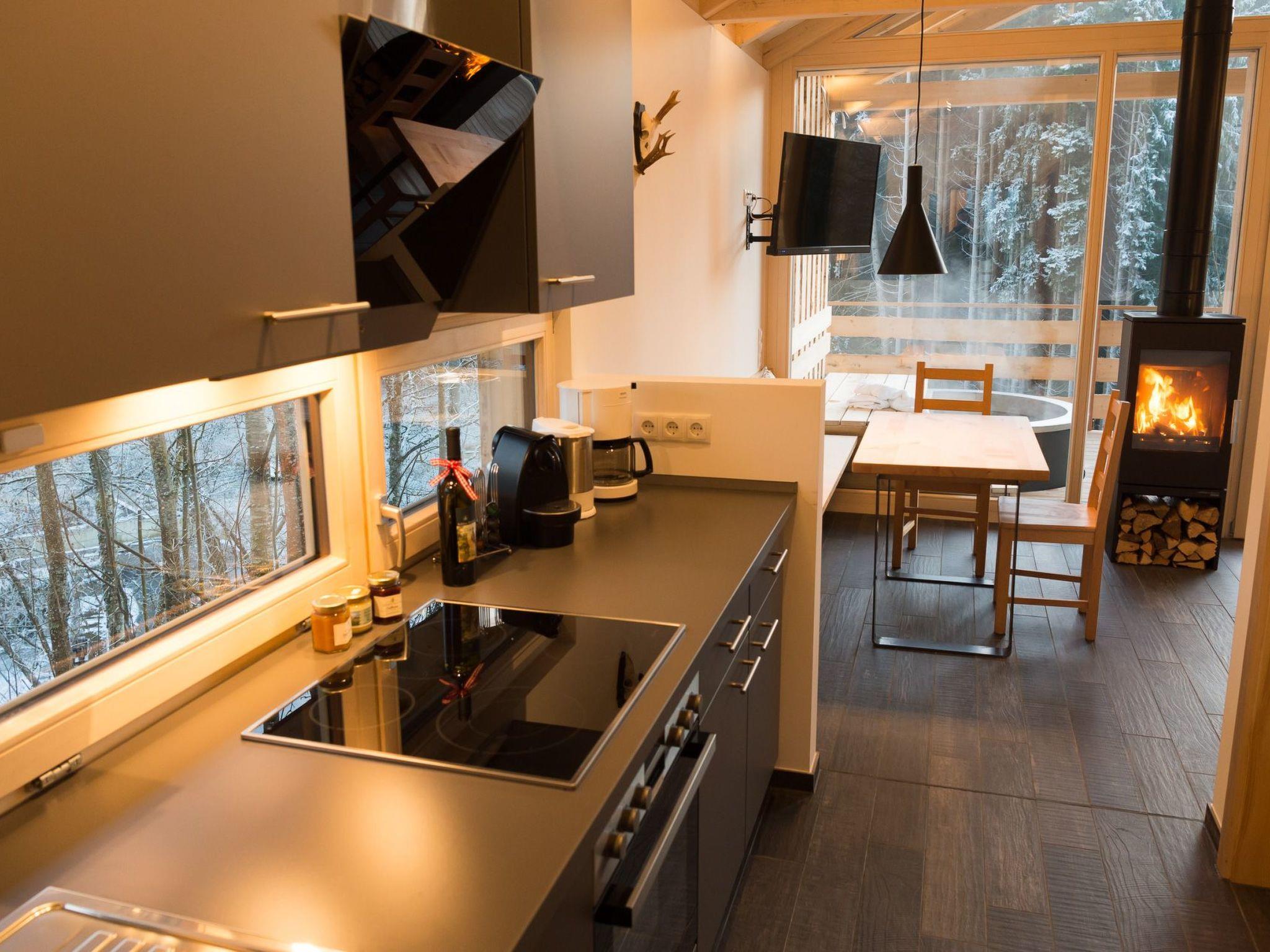 87 square metres offer space for your time at the Forstgut. Designed for 2 people, we offer you space to relax and take a deep breath with your own sauna in the bathroom and an outdoor hot tub on the covered terrace. The architecture, which is orientated towards valuable visual axes, opens up the space to the nearby estate forest. Nature in view, whether from the sauna, the bedroom or the cosy couch - always close to the estate forest, to the seasons and yet surrounded by a room equipped with a large kitchen, a crackling open fire and cosy reading corners. We invite you to the "Room for valuable time - Forstgut von Schnurbein"