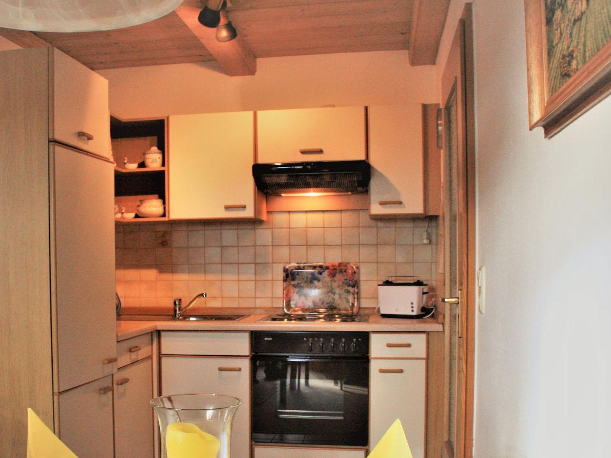 Komplett ausgestattete Küche mit Kühlschrank u. 3 Sterne Eisfach, E-Herd mit Backofen, Kaffee- u. Brotschneidmaschine, Wasser- u. Eierkocher, Toaster.