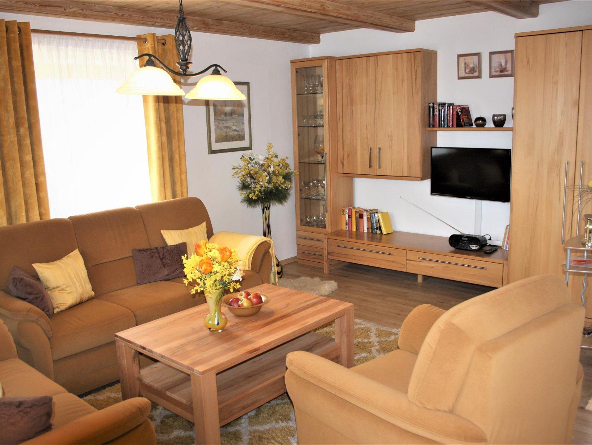 Wohnzimmer: Harmonische Einrichtung mit gemütlicher Chauchgarnitur u. ausziehbarem Schlafsofa, Schrank, Radio, Flachbild-SAT-TV, Internet (Welan).