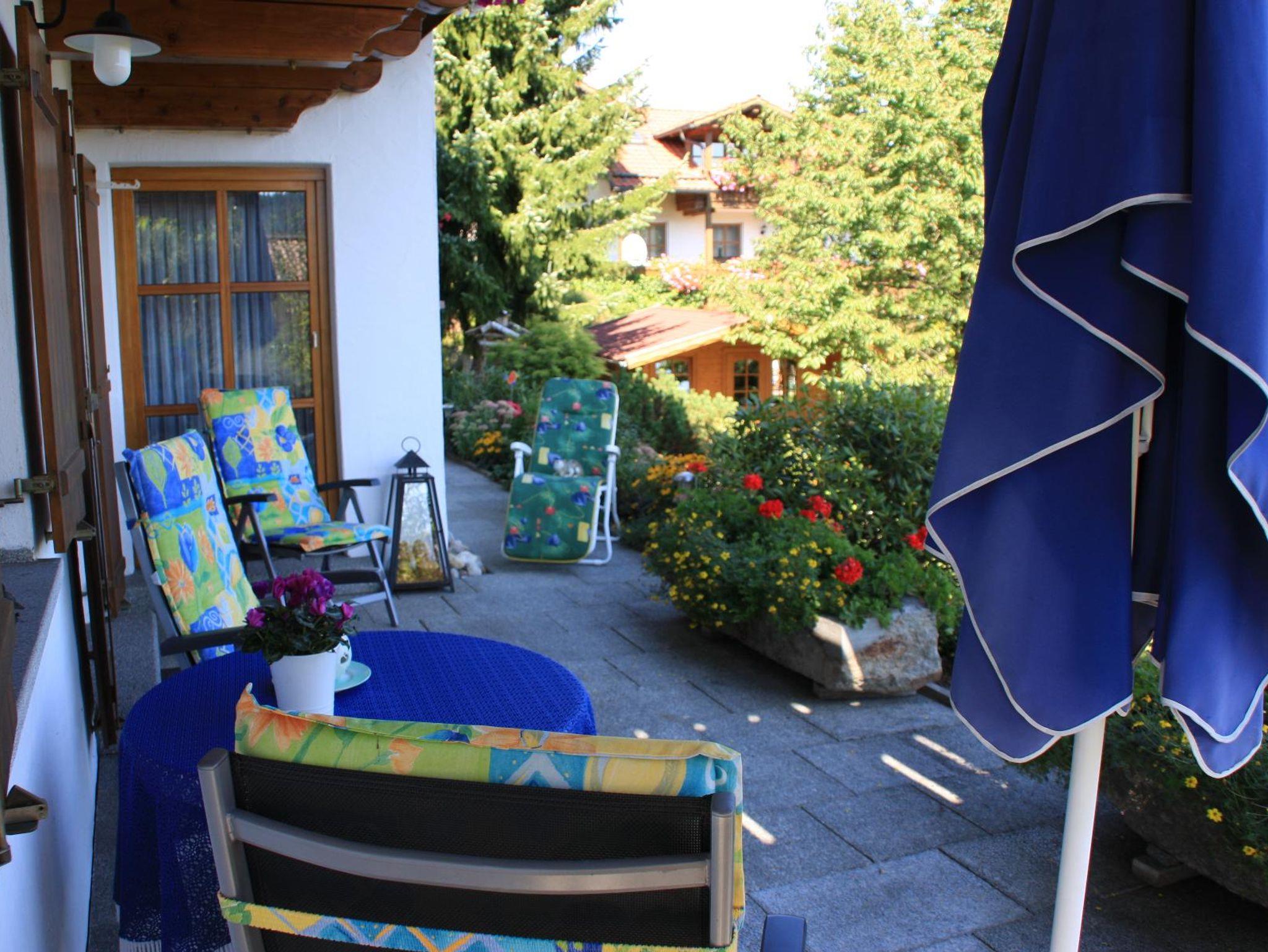 Terasse: Vom Sommer bis zum Herbst können Sie entspannte Stunden auf der überdachten, geschützten Sonnenterasse mit herrlichem Fernblick über das Regental genießen.