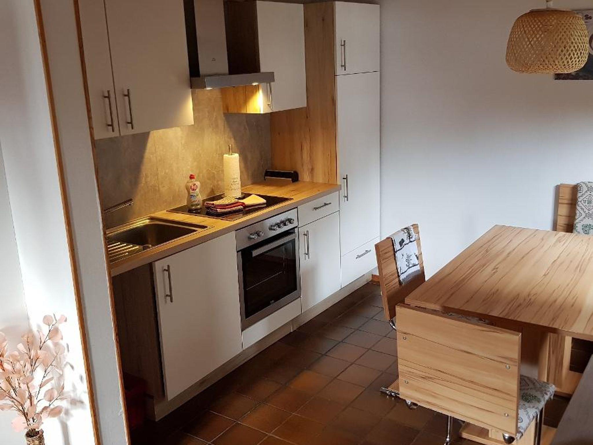 modernem elektrischen Kaminofen und einem zusätzlichen Holzofen zum selbst einheizen und eine voll eingerichtete, neue Wohnküche mit
