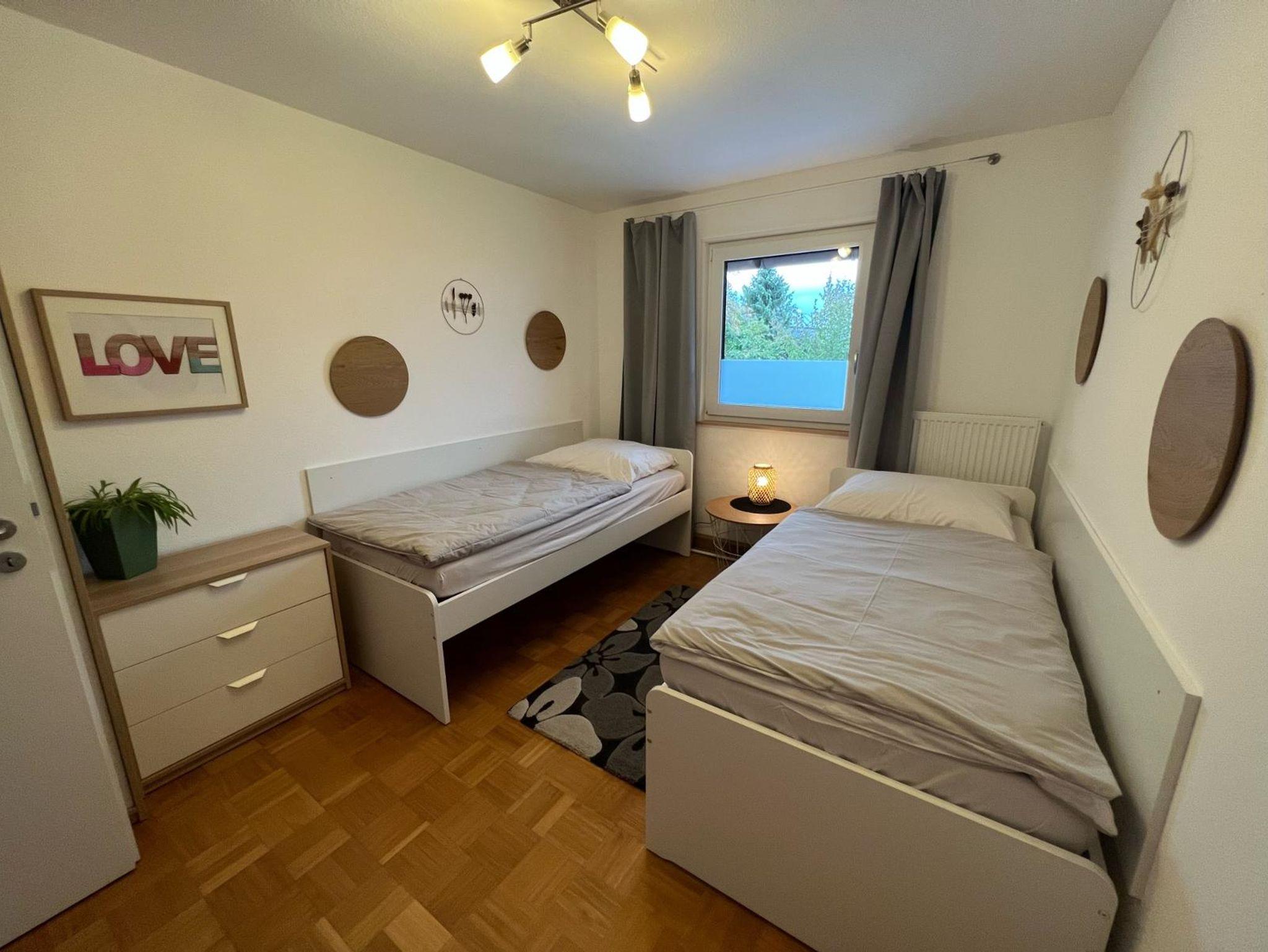extra Schlaf-/Kinderzimmer: zwei 90x200 cm Einzelbetten, Bettwäsche vorhanden, Fernseher mit Sat-TV;