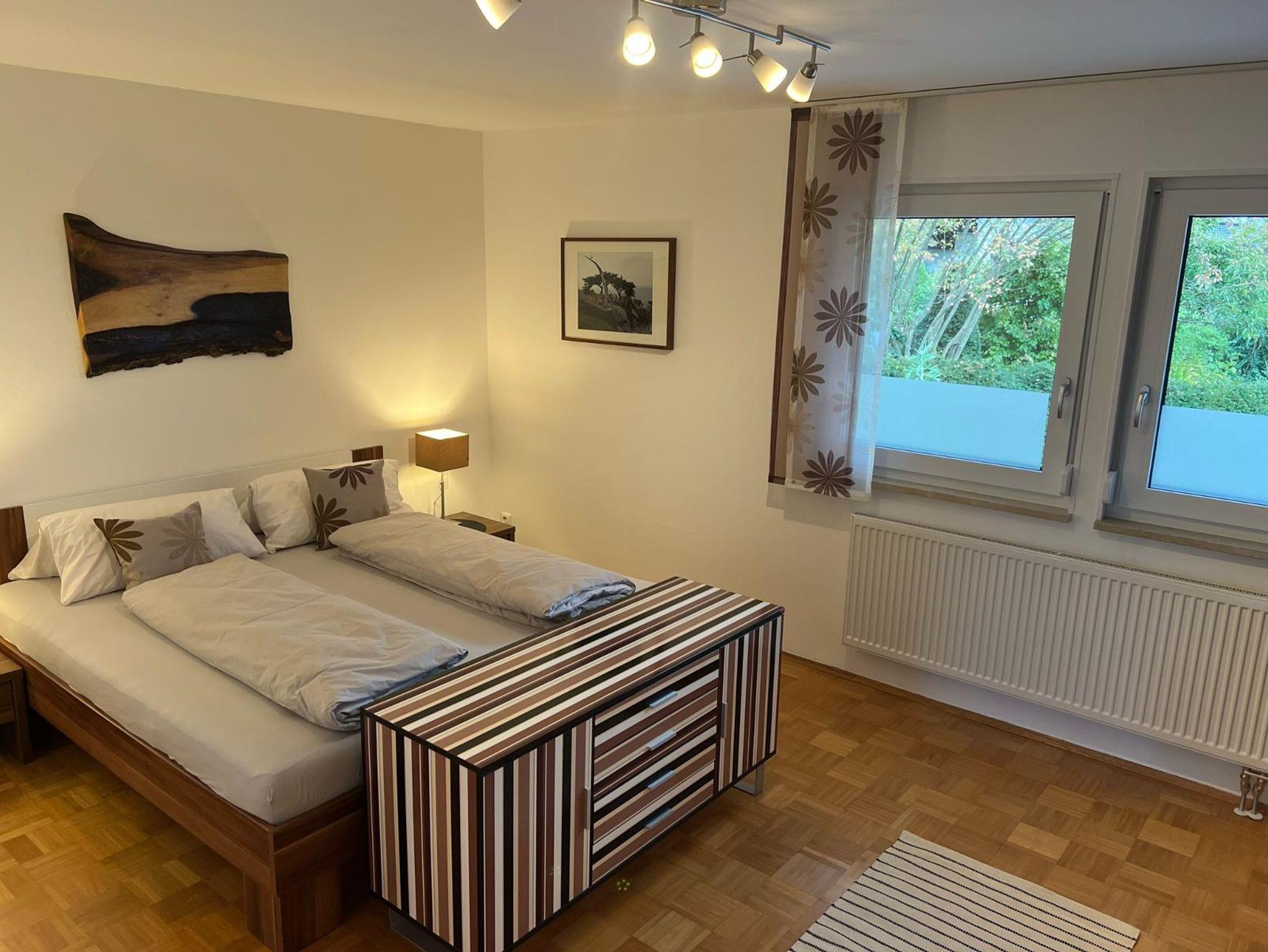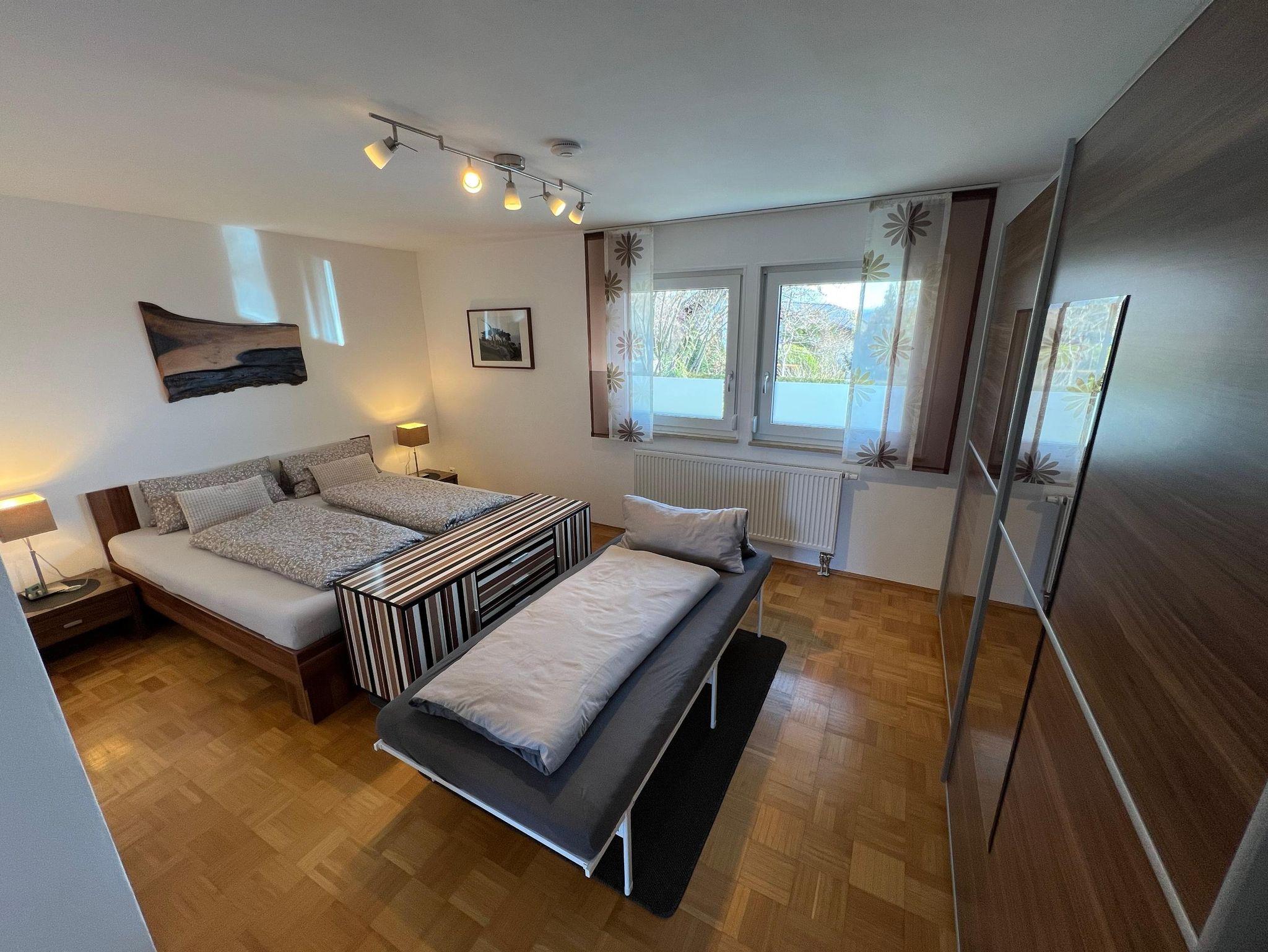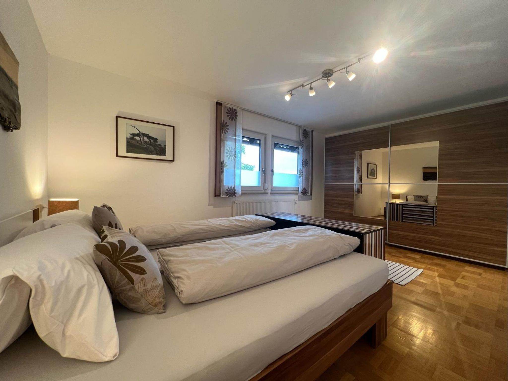 geräumiges Schlafzimmer: 180x200 cm Doppelbett, Bettwäsche vorhanden; weiteres Zustellbett (90x200) möglich