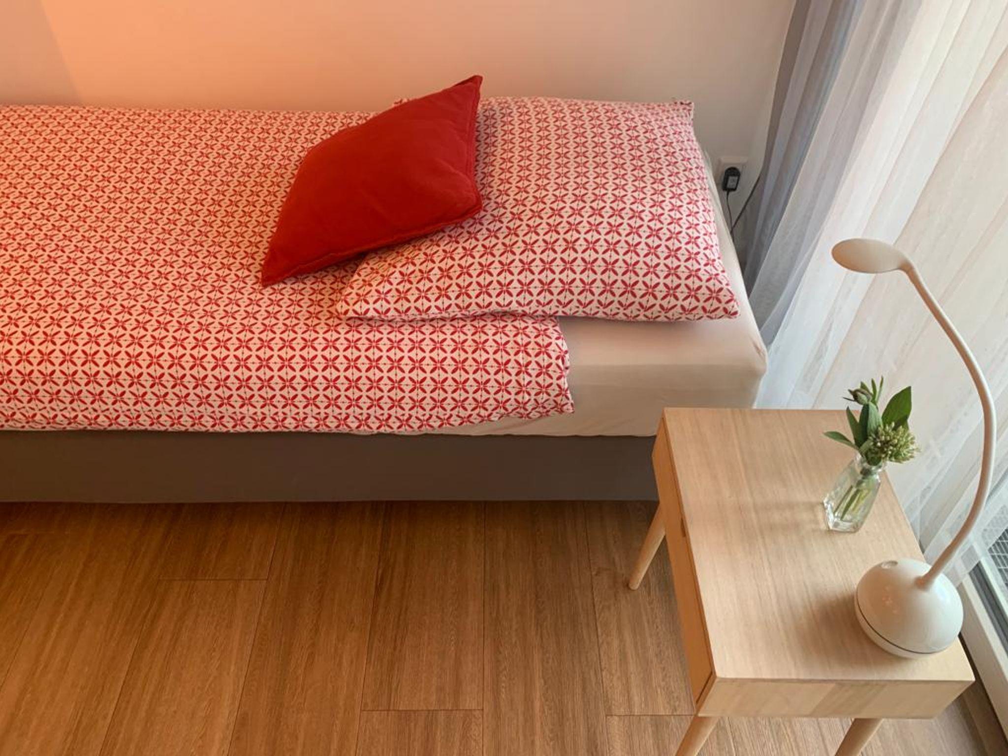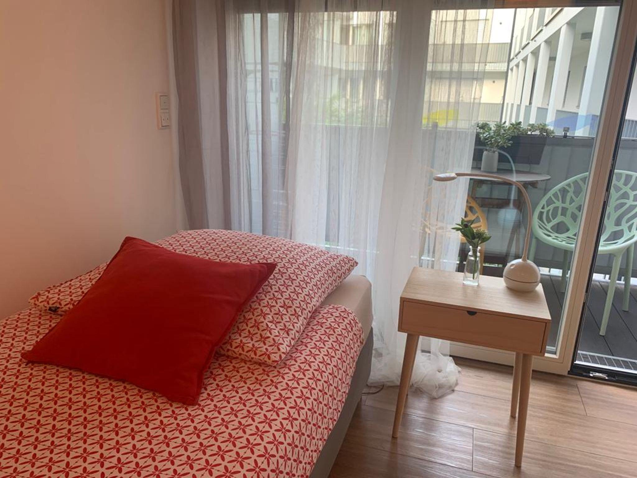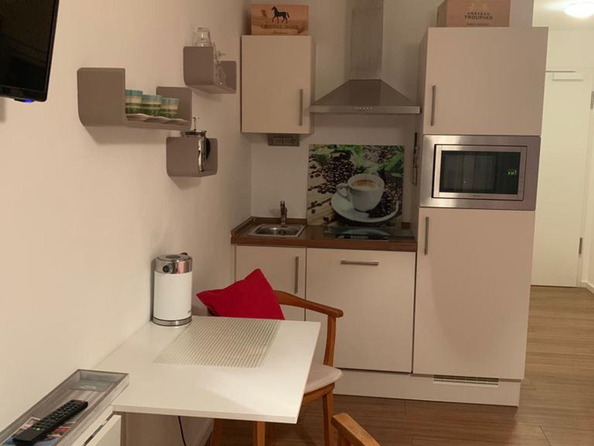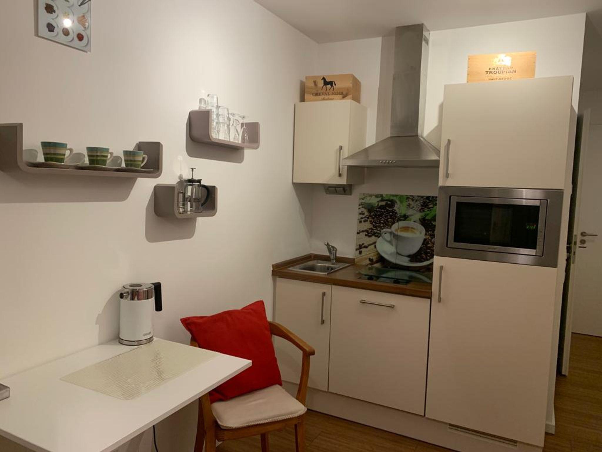 Schatzkästchen in Top Lage, alles da auf kleinstem Platz. Voll ausgestattetes Appartement (20 qm) mit Balkon zum ruhigen Innenhof. Das Appartement liegt im 3. Stock und ist bequem und barrierefrei über den Aufzug zu erreichen. Im kombiniertem Wohn- und Schlafbereich befinden sich Schlafmöbel, je nach Bedarf ein Einzelbett (90x200) mit Sitzgelegenheit Schrank und Garderobe. Die Mini-Wohnküche verfügt über ein 2-Platten Cerankochfeld mit Dunstabzugshaube, Spüle, Kühlschrank mit Gefrierfach, Geschirrspülmaschine, Mikrowelle mit Grillfunktion sowie eine Mokka-Kaffeemaschine. Ein Esstisch für 2 Personen steht ebenfalls zur Verfügung. Das Bad ist ausgestattet mit Dusche, WC und Waschbecken. Die gesamte Wohnung verfügt über eine Fußbodenheizung.