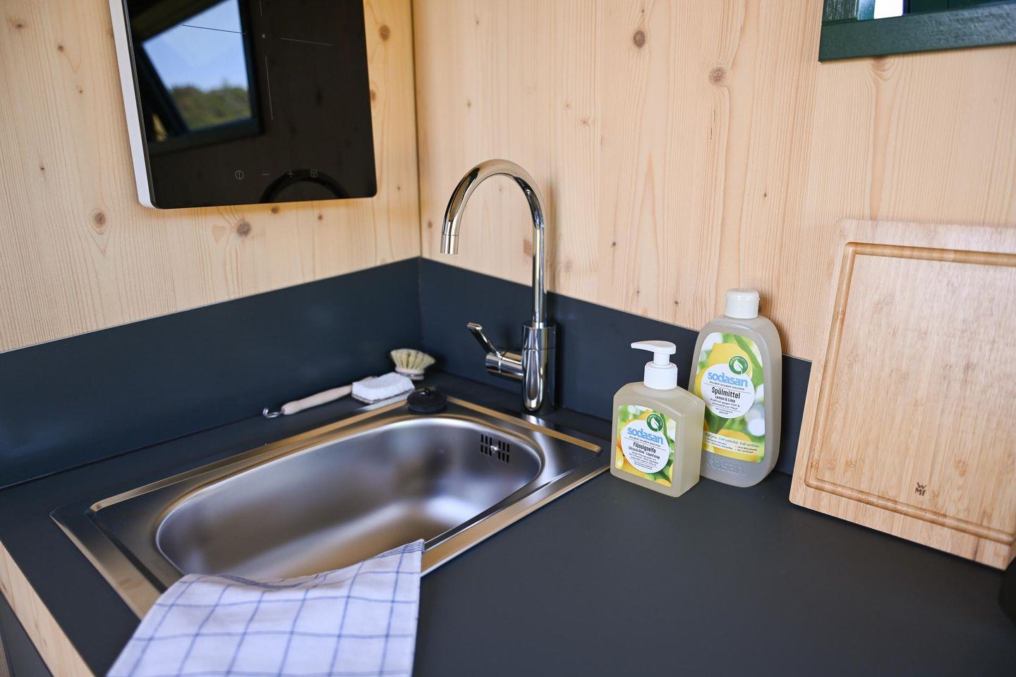 Auf 5 m² Innenfläche findest du alles, was nötig ist für einen Aufenthalt zu zweit: ein gemütliches Bett (1,40 × 2,00 m) inklusive Decken, Kopfkissen und hochwertiger Bettwäsche, genügend Stauraum, eine Heizung und ein großes Panoramafenster mit Verdunklungsmöglichkeit, das dir einen wunderbaren Blick über die Weide schenkt (je nach Saison mit Schafen). Für das leibliche Wohl sorgt eine kleine, aber gut ausgestattete Kochnische: Mini-Kühlschrank, ein mobiles Induktionskochfeld, Flötenkessel, French Press, Geschirr, Pfanne, Topf und Kochutensilien sowie Reinigungsmittel – alles da, um einfache Mahlzeiten und Kaffee ganz entspannt zuzubereiten.