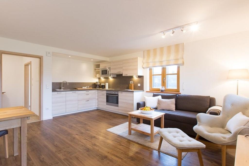 Ab Juli 2016! Auf 55m² Wohnfläche ist alles komplett neu gebaut und im modernen Landhausstiel eingerichtet. Die Wohnung besteht aus einem Schlafzimmer für 2 Personen ( Babybett auf Anfrage), einer geräumigen Wohnküche mit Südterrasse von der aus Sie einen wundervollen Blick in die bayerische Voralpenlandschaft haben. Ein großes Bad mit ebenerdiger Dusche ist selbstverständlich auch vorhanden. Ein Nebenraum für das unterbringen von Rädern, Skiern usw. ist ebenfalls vorhanden. Der Parkplatz befindet sich direkt neben dem Ferienhaus. Für Bauernhofliebhaber ist diese Wohnung ebenfalls zu empfehlen da sie sich direkt neben unserem Hof befindet. Ein großer Garten lädt zum spielen und verweilen ein. Grill wird gestellt