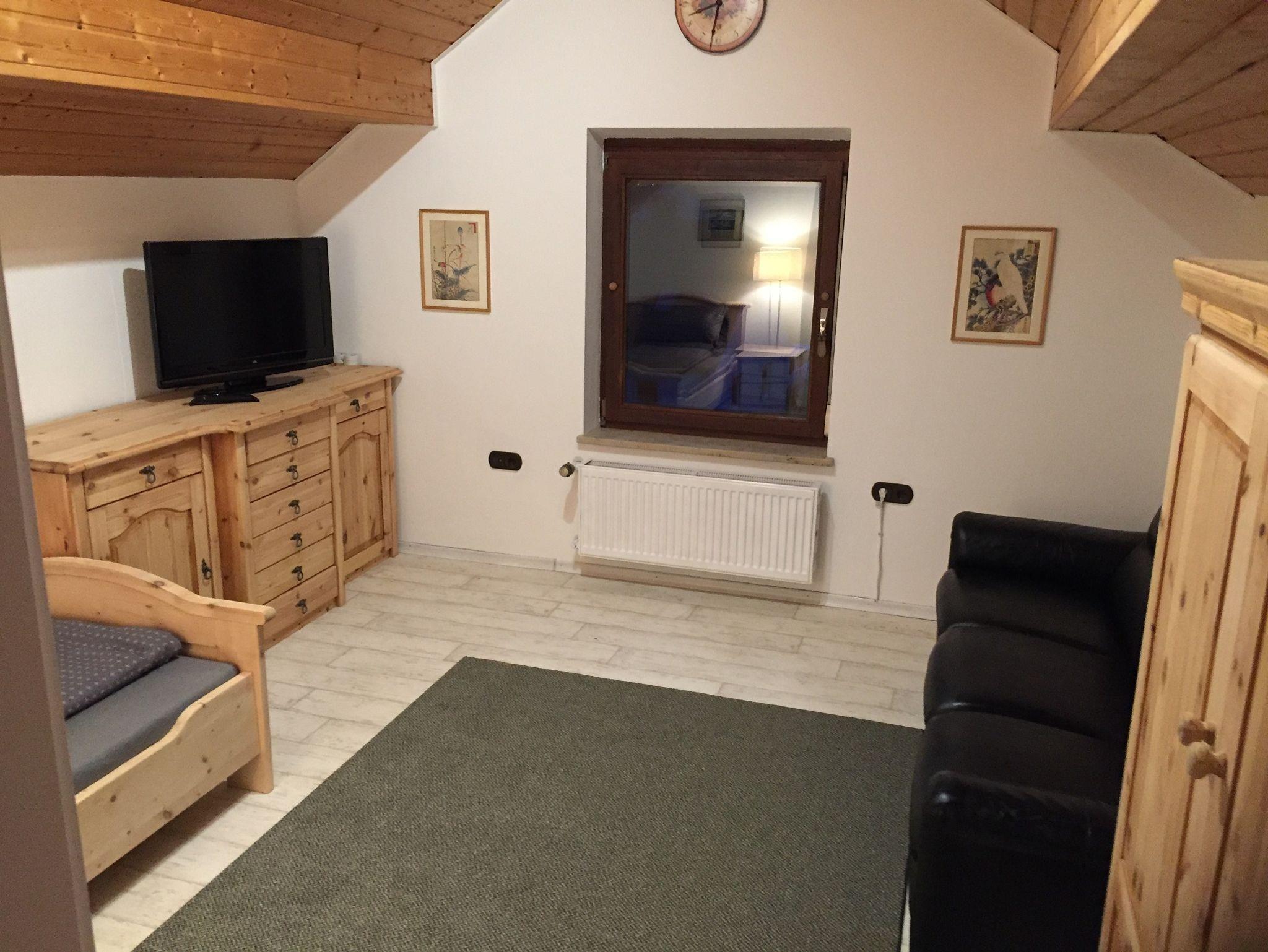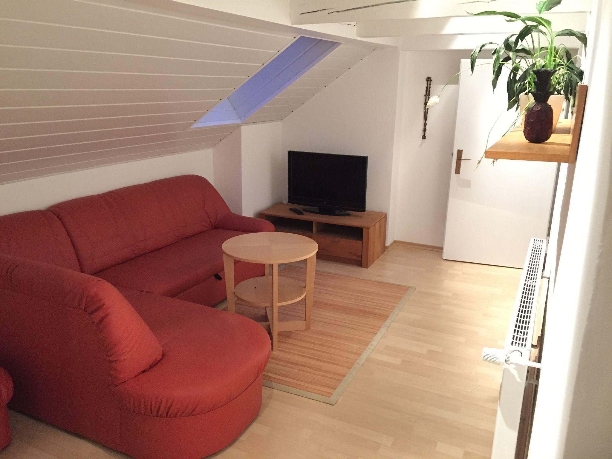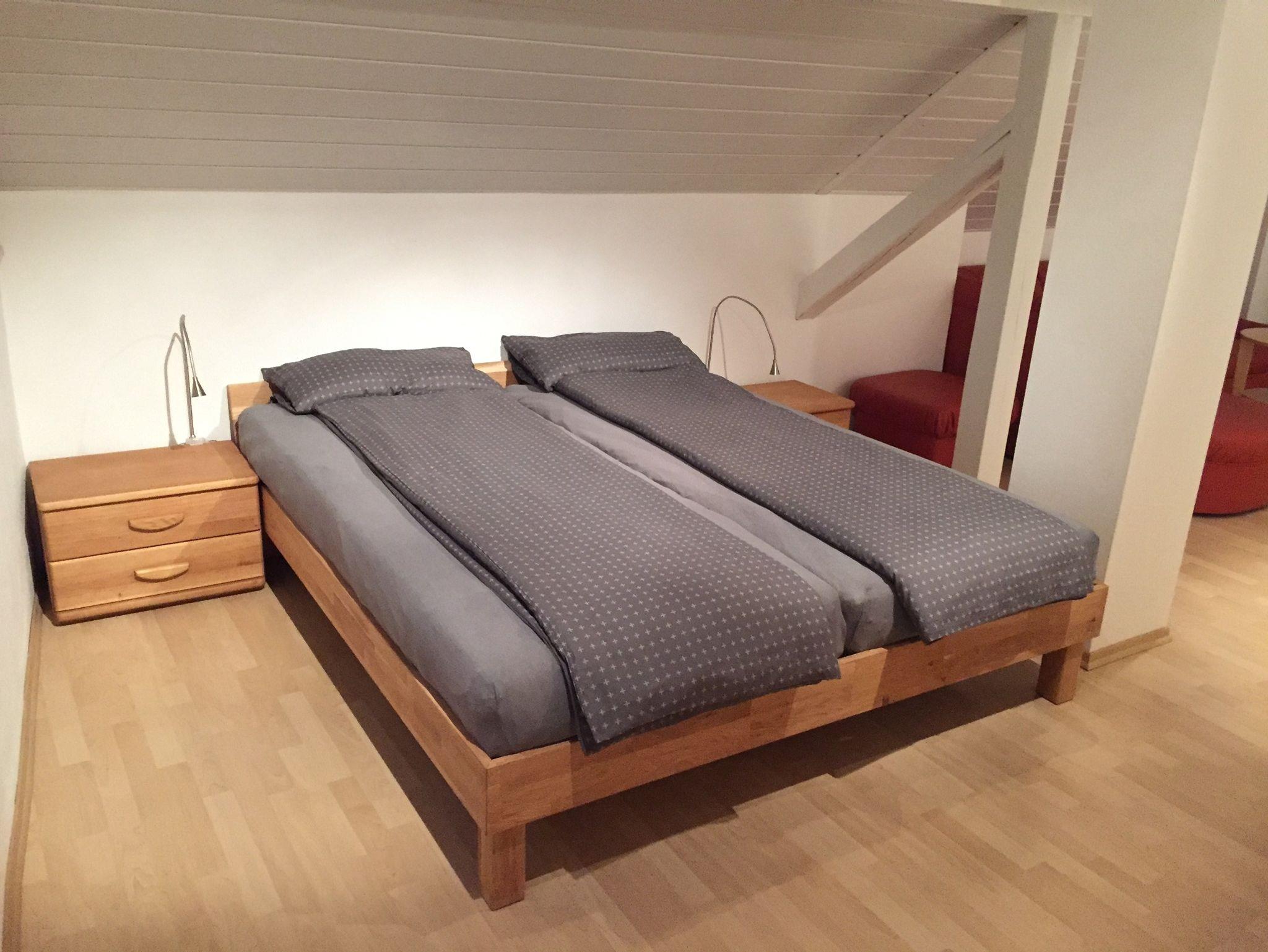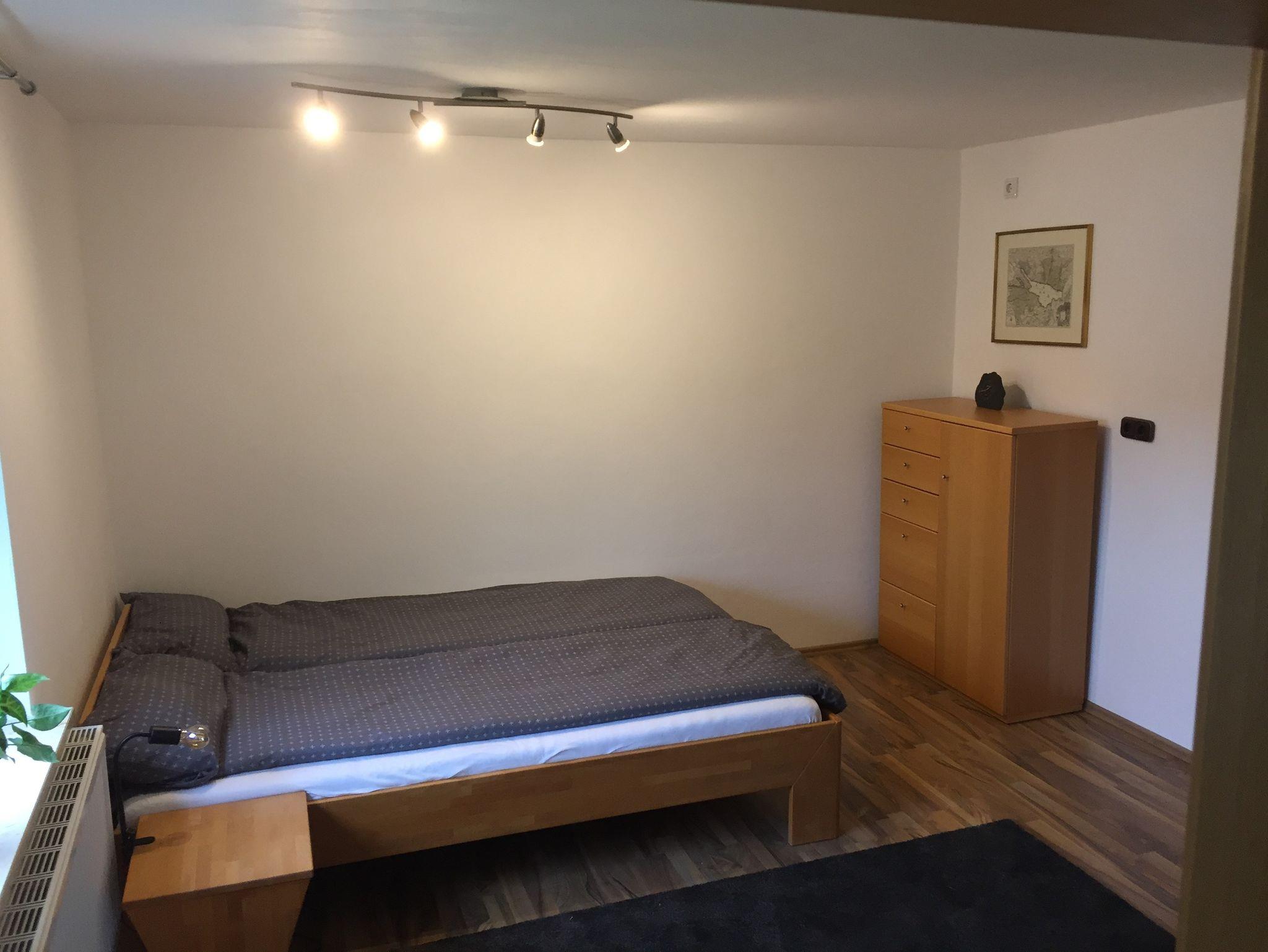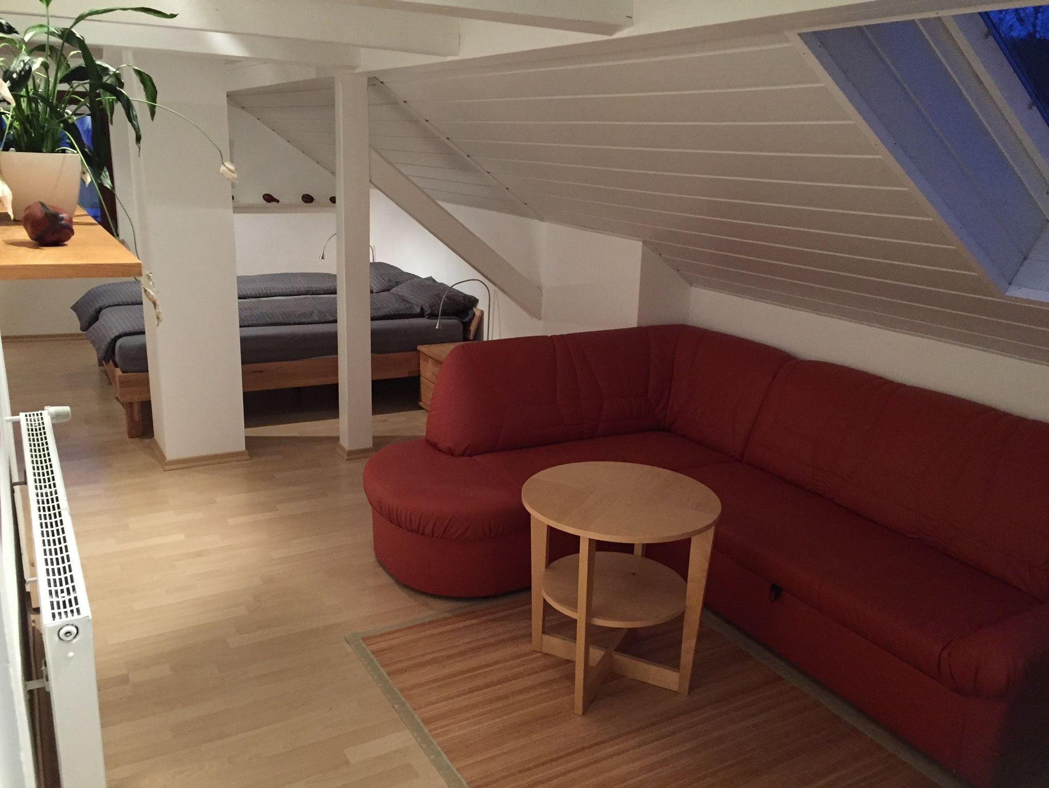 Der 1. Schlafraum ist ein 28m² großes lichtdurchflutetes Doppelzimmer (Doppelbett 180 x 200cm) mit Dachschräge, Einbau-Kleiderschrank, Ledercouch, Couchtisch, Flachbild TV.