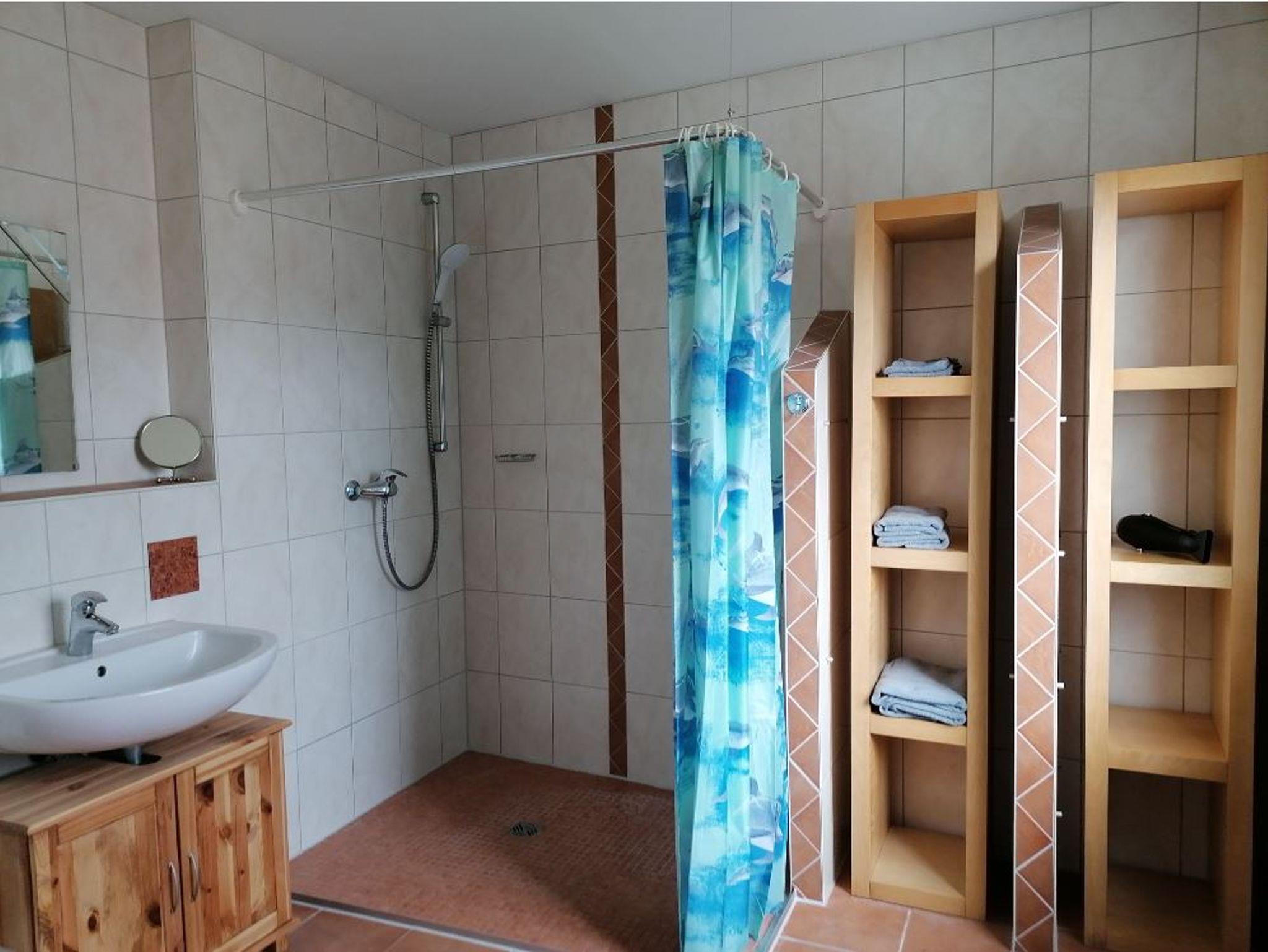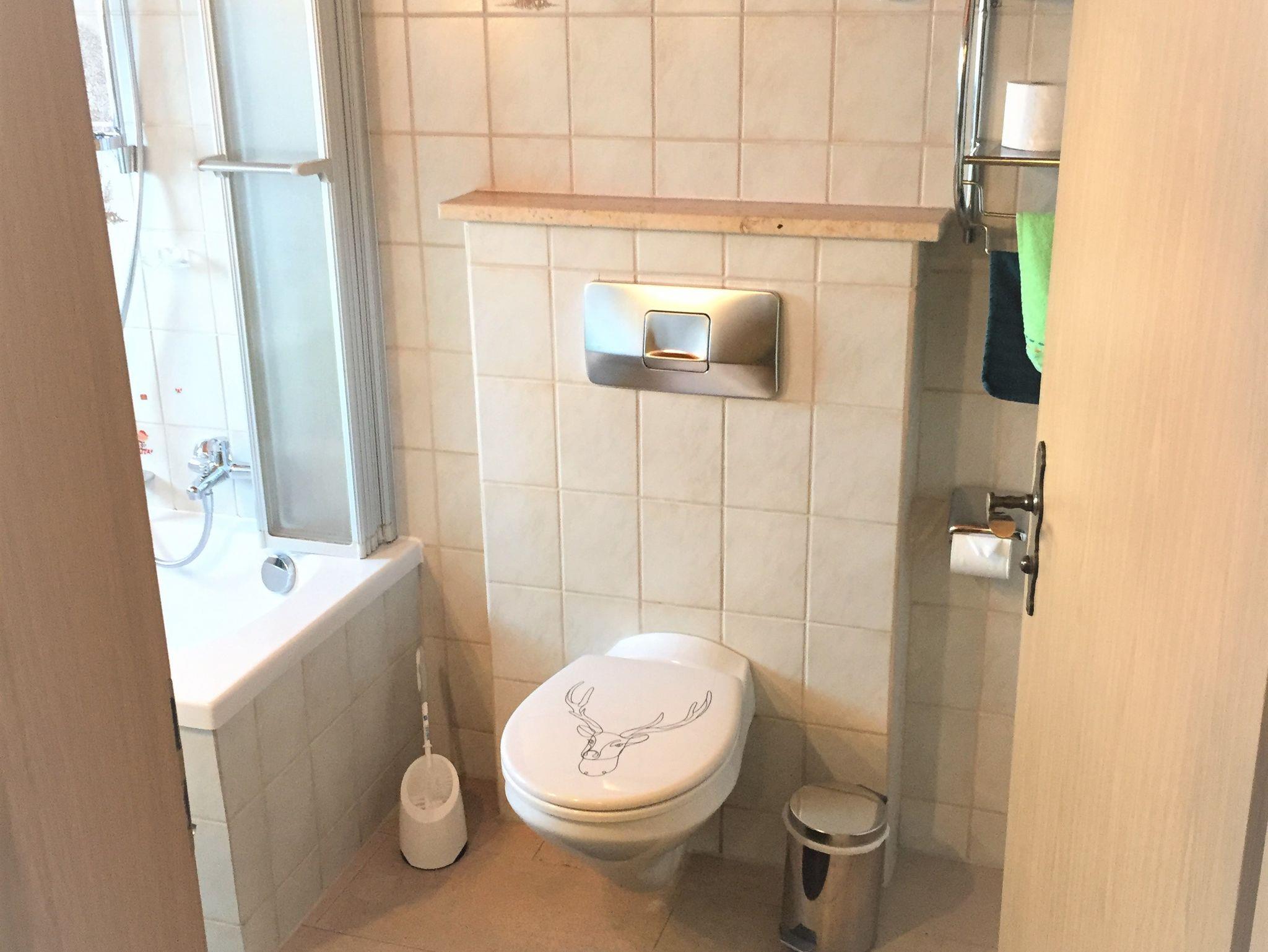 Über das Wohnzimmer gelangen Sie in das 1. Bad mit Fenster, Dusche, WC. Dieses ist mit allen nötigen Accessoires (Fön, Kosmetikspiegel etc.) zur täglichen Körperpflege und Hygiene ausgestattet