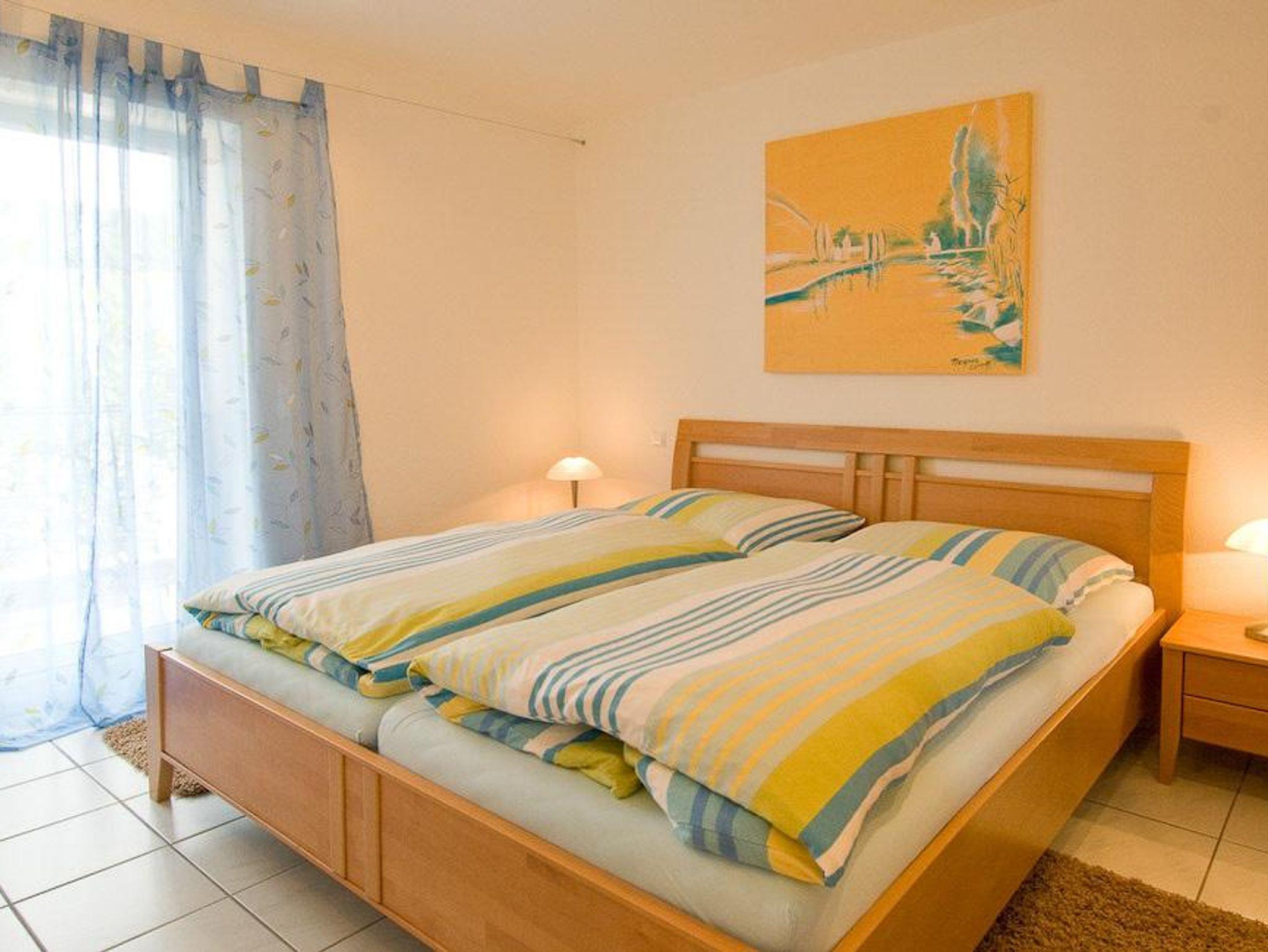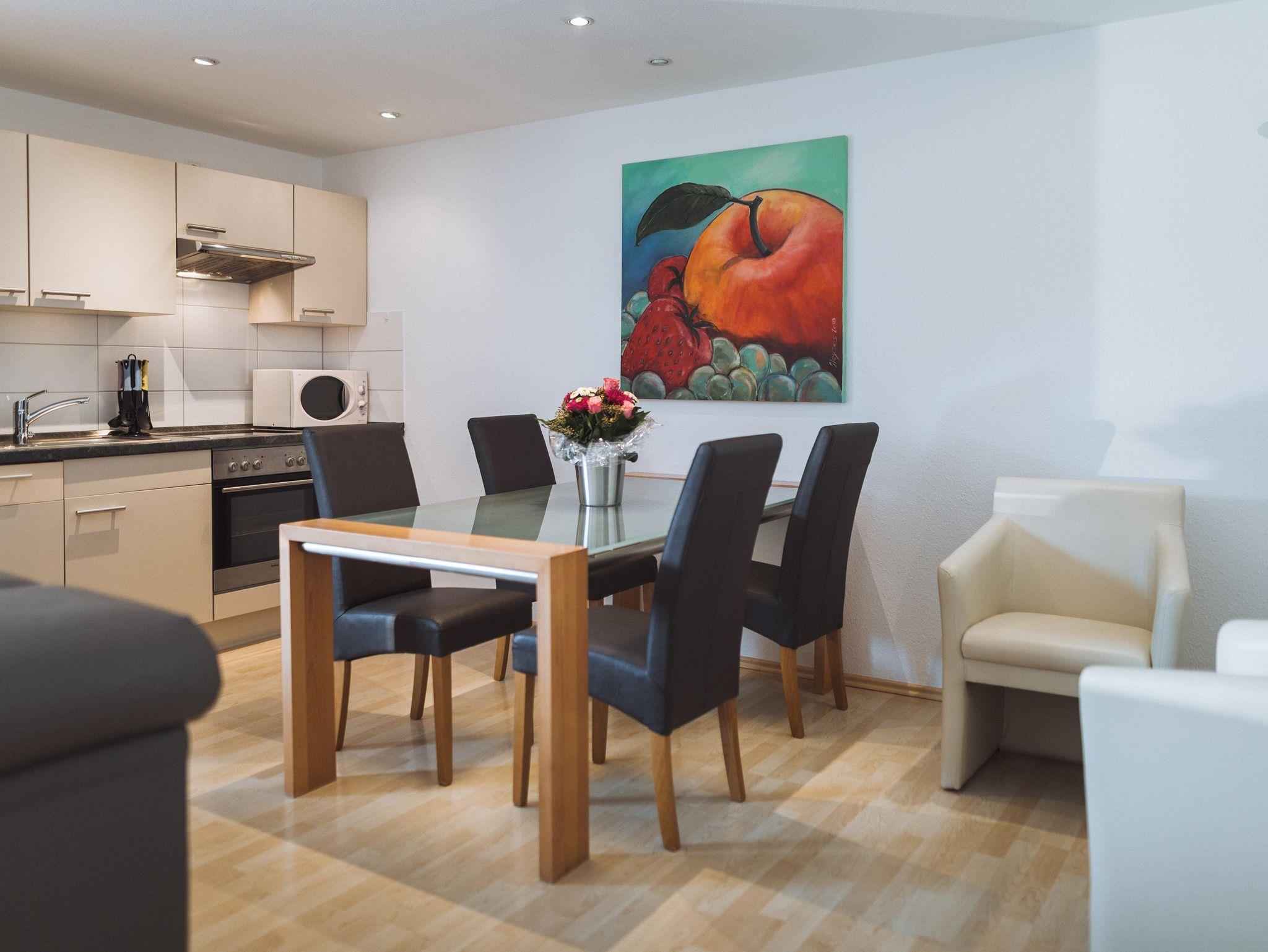Sie verfügt über zwei Schlafzimmer mit jeweils 1,80 m x 2,00 m großen Doppelbetten mit getrennten Matratzen, zwei Nachtschränken und einem Kleiderschrank. Ein modernes Badezimmer bestehend aus Dusche, Waschbecken und WC ist direkt von einem Schlafzimmer aus betretbar. Das große Hauptbad verfügt über eine geräumige, ebenerdige Dusche, zwei Waschbecken, einem WC, einem Bidet und einem Handtuchwärmer. Ein großes Wohnzimmer mit gemütlicher Couch lädt zum Verweilen ein. Ein großer Smart-TV mit Internetzugang runden das Angebot ab. Die vollausgestattete Küche inklusive Essbereich mit ausziehbarem Esstisch befinden sich ebenfalls in diesem Raum.
