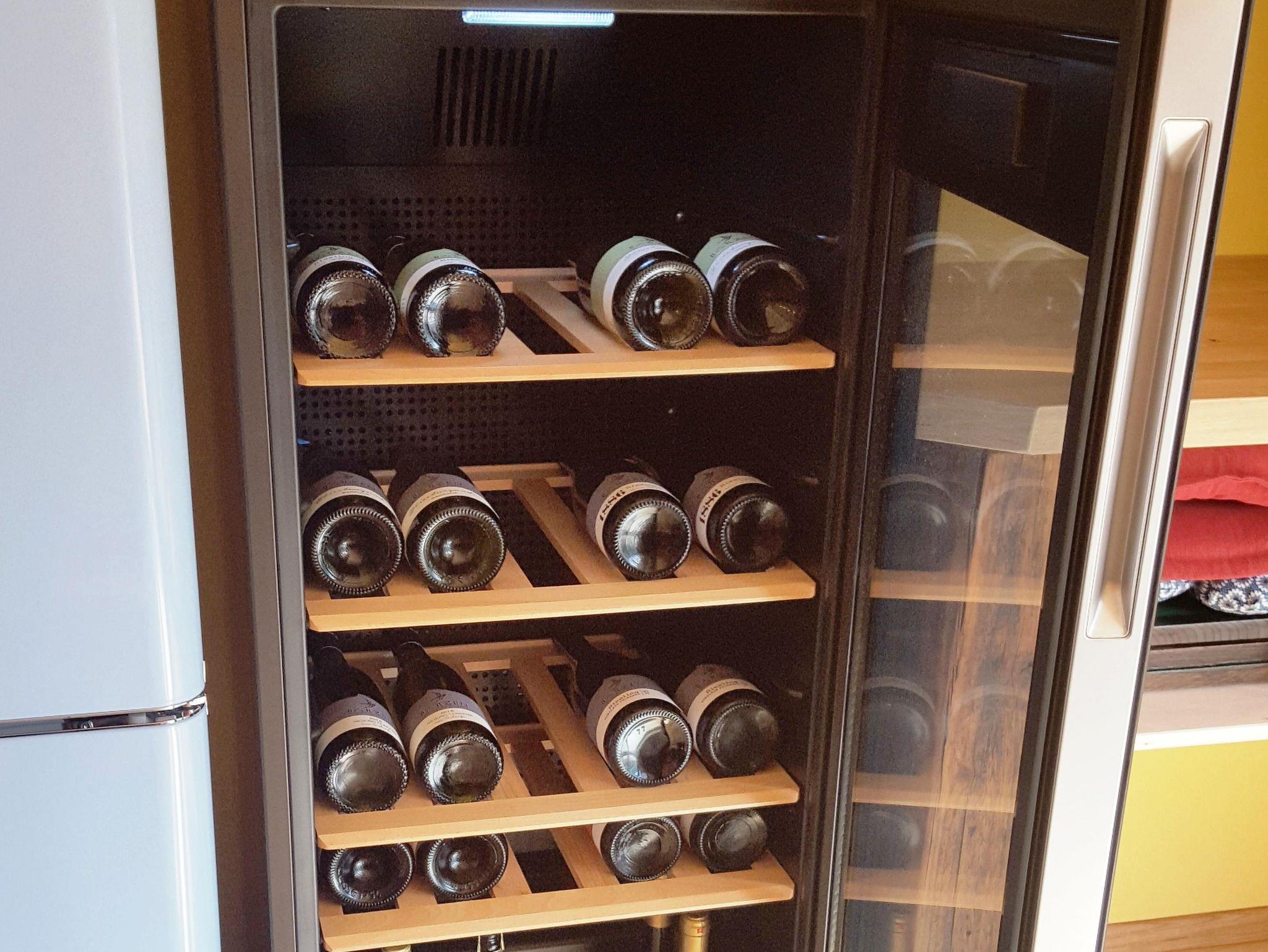 Weinkühlschrank mit Tropfen aus eigenem Weingut. Relax-Pavillon mit ´Hollyweinschaukel´ im Grünen.