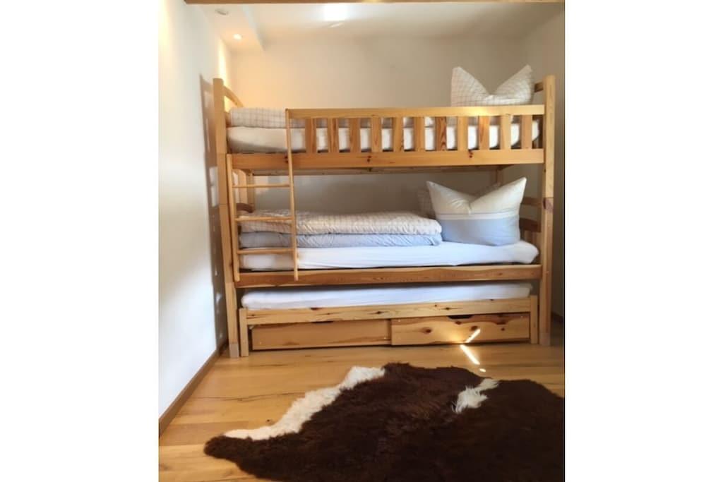 Der Wohnraum ist ca. 60 qm groß und alle Böden sind ökonomisch hergestellt als auch verarbeitet. Die Möblierung ist modern und nach Öko-Richtlinien ausgewählt worden. Dementsprechend auch für Allergiker geeignet. Der Living-Room verfügt über eine schöne Essecke sowie ein hochwertiges Ledersofa und einen Fernseher mit Kabelanschluss. Per WLAN haben Sie in der gesamtem Wohnung Internetzugang. Die amerikanische Küche ist mit einem 4-Zonen-Induktion-Ceranfeld ausgestattet. Der Kühlschrank mit Gefrierfach besitzt das Siegel „3 Sterne, Energieeffizient AAA“. Außerdem befinden sich in der Küche ein Geschirrspüler, eine Dunstabzugshaube und ein Backofen. Es sind ausschließlich WMF Küchengeräte vorhanden: Kaffeemaschine/Thermoskanne, Wasserkocher, Toaster, Töpfe, Mixer. Ein weiterer Vorteil ist die besonders große Ablagefläche und der ausgiebige Stauraum. Für die kleinen Gäste stehen Kinderhochstühle von Tripp Trapp® bereit. Das kleine, funktionale Duschbad ist frisch saniert. Es besitzt eine bodengleiche Schwalldusche, einen Haartrockner, ein Hänge-WC mit Absenkautomatik, Handtücher, eine Handtuchheizung, ein Tritthocker für Kinder und einen Baby-Toilettenaufsatz. Im Elternschlafzimmer ist ein Doppelbett vorhanden und ebenfalls ein Fernsehgerät mit Kabelanschluss und DVD-Player. In dem geräumigen Kleiderschrank befindet sich zusätzlich ein Safe für Ihre Wertsachen. Für einen komfortablen Aufenthalt befindet sich im Kinderzimmer ein Doppel-Etagenbett, wo bis zu 3 Personen (á max. 130 Kg) schlafen können. Für Kleinkinder sind ein Babybett und ein Bettgitter verwendbar. Der Fernseher ist mit einem Kabelanschluss versehen und ein DVD-Player ist integriert. Zudem ist eine Nintendo Wii Spielkonsole installiert. Auf dem Balkon können Sie sonnige Abende ausklingen lassen und entspannt grillen. Der Grill beinhaltet das dafür vorgesehene Grillbesteck. Die Markise beschert auch bei heißen Tagen ein angenehmes Beieinandersein auf dem Balkon sowie Sonnenschutz für den Wohnraum. Im Keller können Sie Waschmaschine, Trockner und Bügeleisen nutzen. Ansonsten steht Ihnen ein Kinderwagen, ein Bobby Car, eine Tischtennisplatte und ein Schlitten für Rodelspaß im Winter zur Verfügung. Unsere Gesellschaftsspiele können Sie nutzen, als auch Spiele für draußen. Damit Ihr Aufenthalt in der Ferienwohnung in Reit im Winkl perfekt wird, erhalten unsere Gäste die „Reit im Winkl inklusiv Card“ kostenlos. Diese beinhaltet unter anderem die Nutzung von Frei- und Hallenbädern, der Benz-Eck-Lifte und eine Vergünstigung der Skipässe in Seegatterl. Der Ort überlegt sich jedes Jahr ein attraktives Programm mit viel Spaß in der freien Natur für die großen und kleinen Gäste. Vom Ponyreiten bis zum Hochseilgarten ist alles dabei. Hinweis: Die Ferienwohnung in Reit im Winkl wird auch von Privat – einer kinderfreundlichen Familie OHNE Haustiere – genutzt. Daher sind Haustiere nicht willkommen.