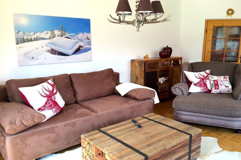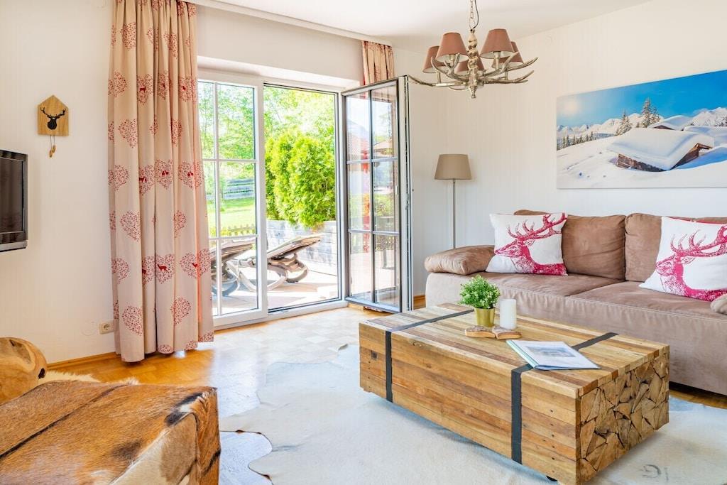 The ground-floor apartment in Landhaus St. Markus is 50 square meters and can accommodate up to four people plus one infant. The apartment features a large living room with a sofa bed and an open-plan kitchen with a dining area. The bedroom with a double bed (180 x 200 cm) has a large wardrobe and a second flat-screen TV. The bathroom with shower was newly renovated in 2021. The apartment is very bright, as all rooms have windows. The large, sunny terrace is in a quiet location overlooking the garden and features new garden furniture (2021). The apartment is furnished with new garden furniture. Note: We also rent out 3 other apartments at Landhaus St. Markus: Apartment No. 1, Kaiserblick: ? Living space approx. 60 m² on the 2nd floor with a large terrace on the 1st floor ? Max. 4 guests + 1 infant Apartment No. 3, Jägerglück: ? Living space approx. 35 m² on the ground floor with a large terrace and garden ? Max. 2 guests Apartment No. 4, Chalet Alpin: ? Living space approx. 85 m² on the 1st floor with a large balcony ? Max. 5 guests and one infant Please scroll to the bottom for the links.