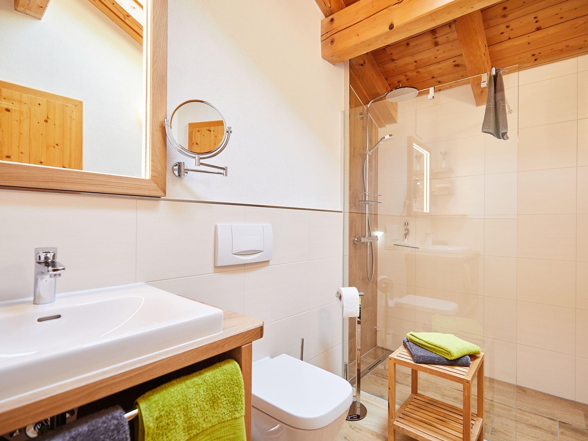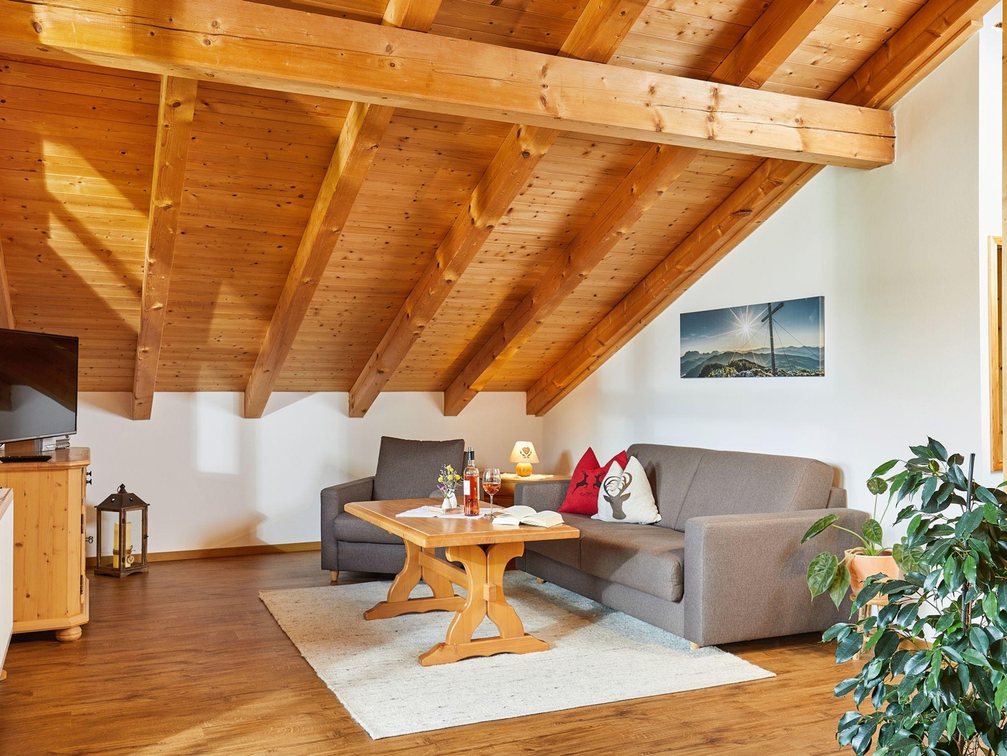 Bei der geräumigen Zwei-Zimmer-Mansardenwohnung (2. Obergeschoß) haben wir vor allem auf Komfort und Gemütlichkeit geachtet. Mit 67 m² bietet die Wohnung für 2-4 Personen ausreichend Platz. Die abgestimmte Einrichtung im Landhausstil, sowie die liebevolle Dekoration und der Sichtdachstuhl mit Giebelverglasung machen die Wohnung besonders behaglich und laden zum entspannen ein. Vom Balkon aus blicken Sie in Richtung Osten zum Walmberg in den Ort. Er bietet Platz zum Frühstücken oder ein Gläschen Wein zu genießen.
